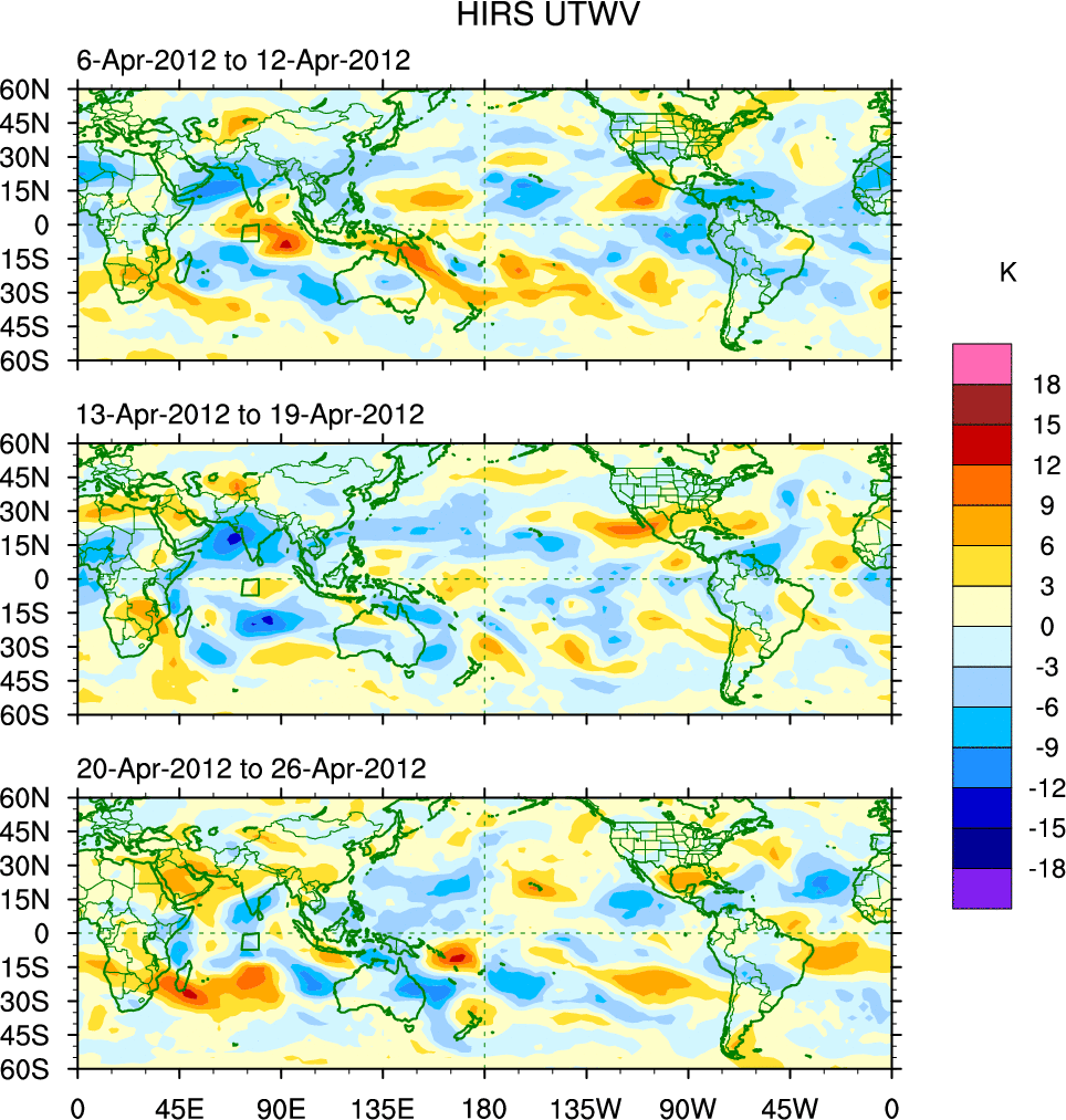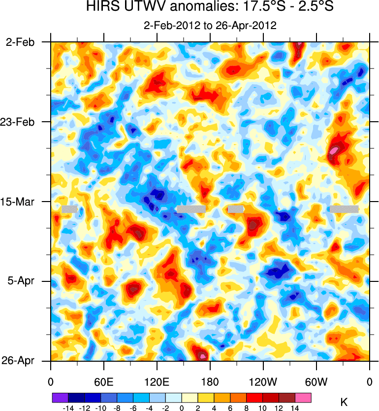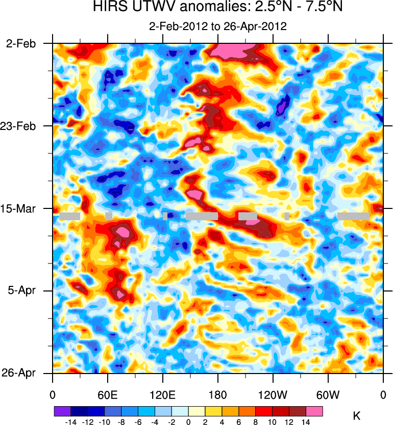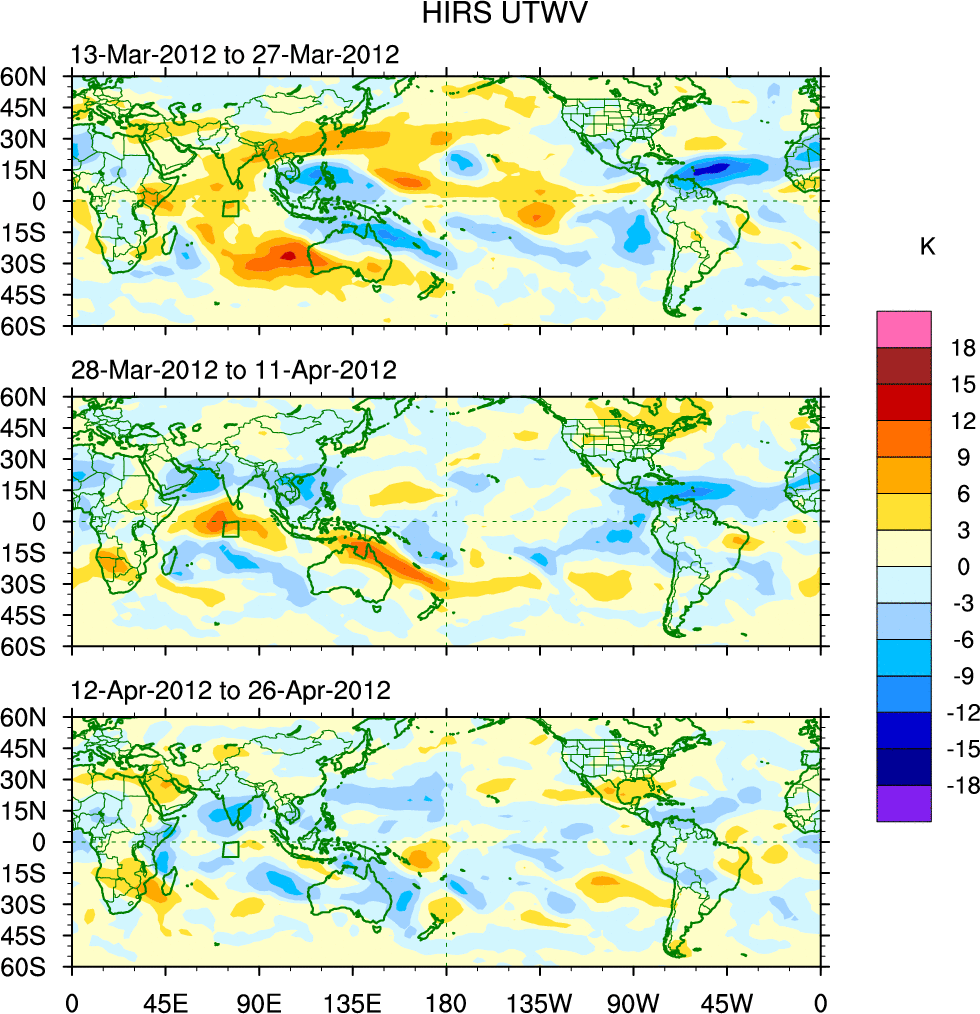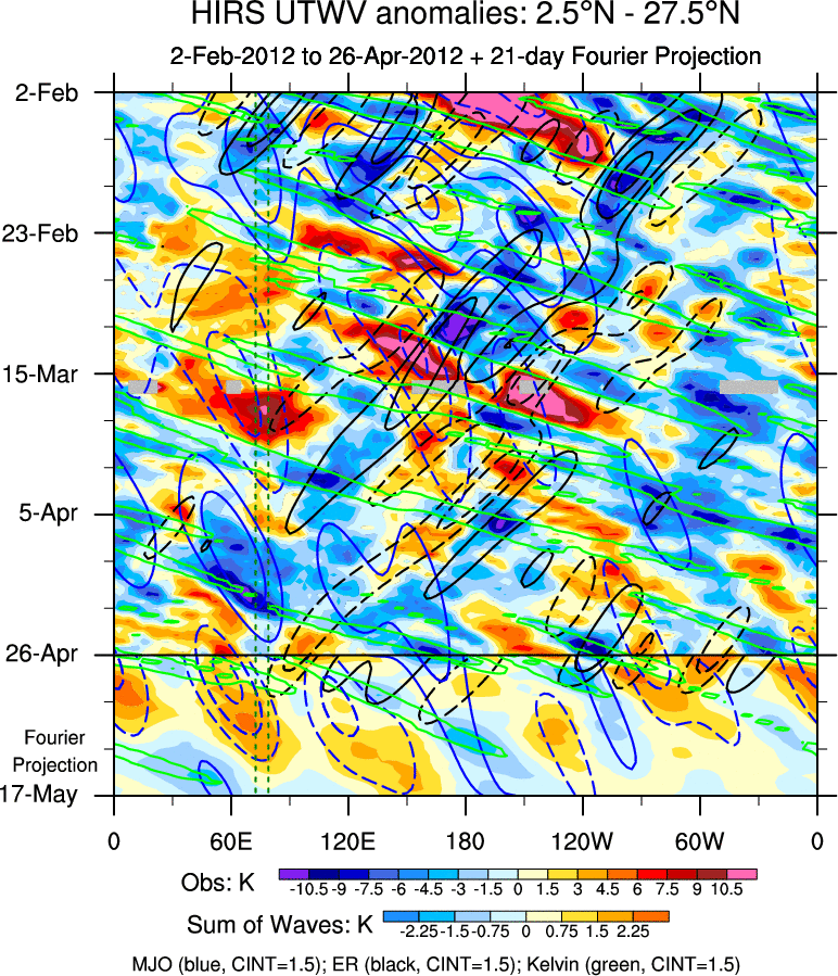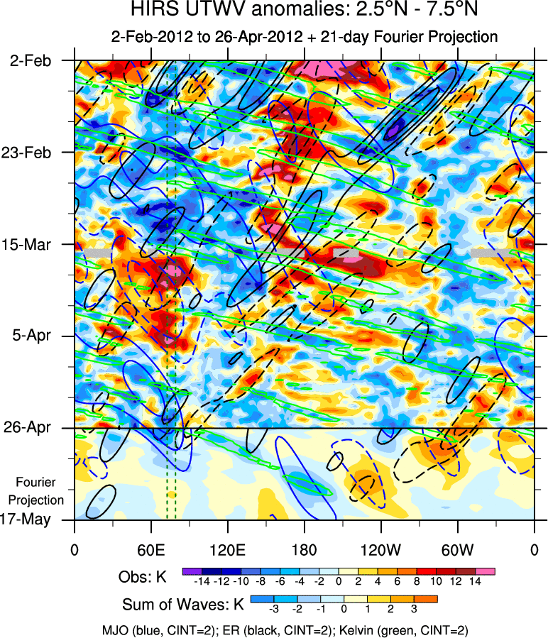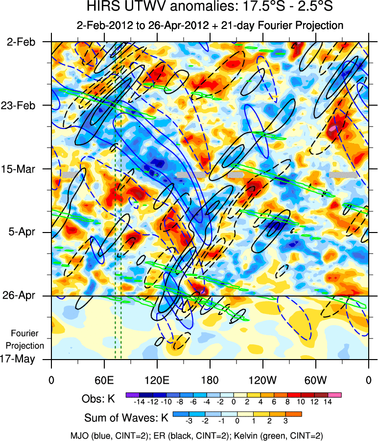 To identify tropical waves in near real-time, the OLR and UTWV data are filtered following Wheeler & Weickmann (2001 MWR). The daily anomalies are calculated using the first 3 harmonics of the seasonal cycle for 1979–2009. Missing values are then filled using linear interpolation in space and time. The most recent 365 days of anomalies are padded with 659 days of zeroes, and the result is filtered for each wave type.