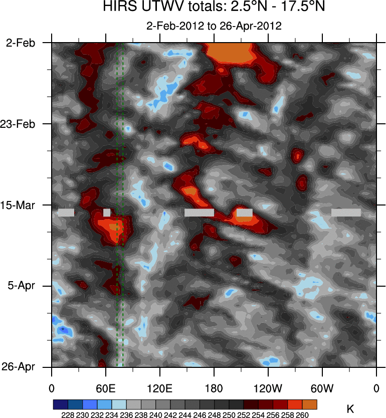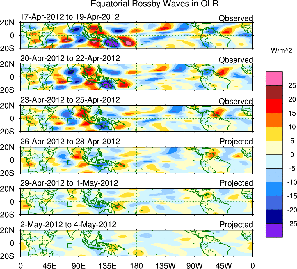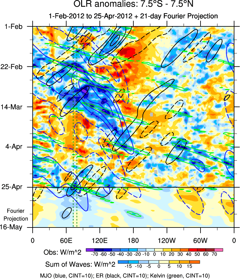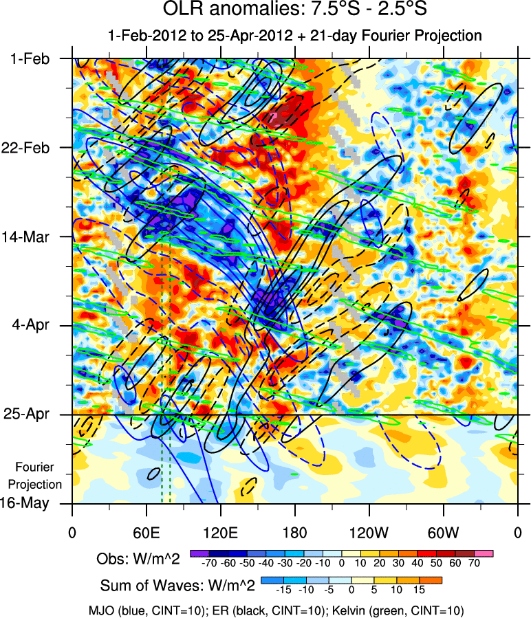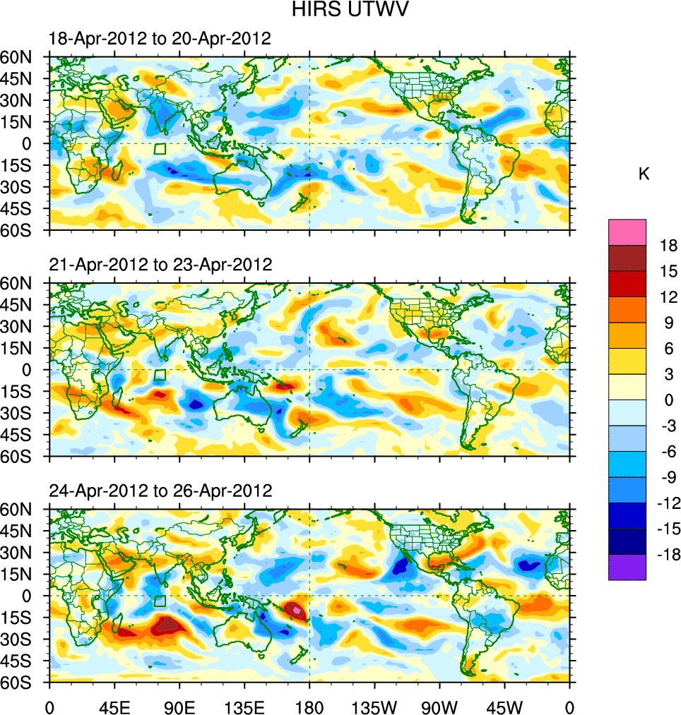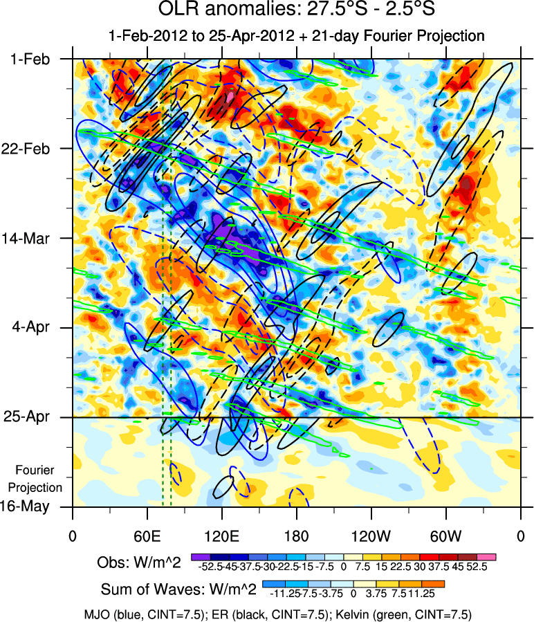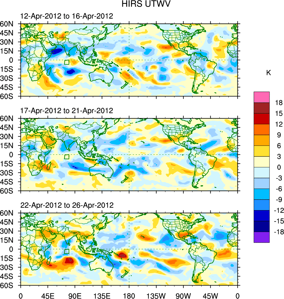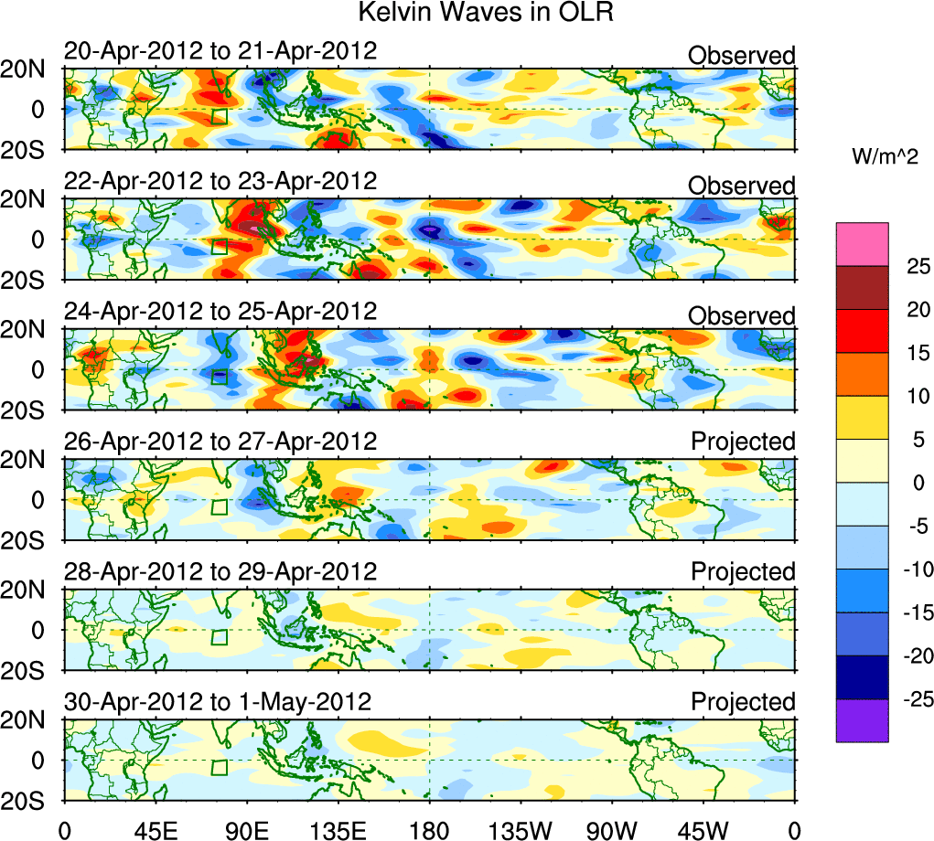 To identify tropical waves in near real-time, the OLR and UTWV data are filtered following Wheeler & Weickmann (2001 MWR). The daily anomalies are calculated using the first 3 harmonics of the seasonal cycle for 1979–2009. Missing values are then filled using linear interpolation in space and time. The most recent 365 days of anomalies are padded with 659 days of zeroes, and the result is filtered for each wave type.