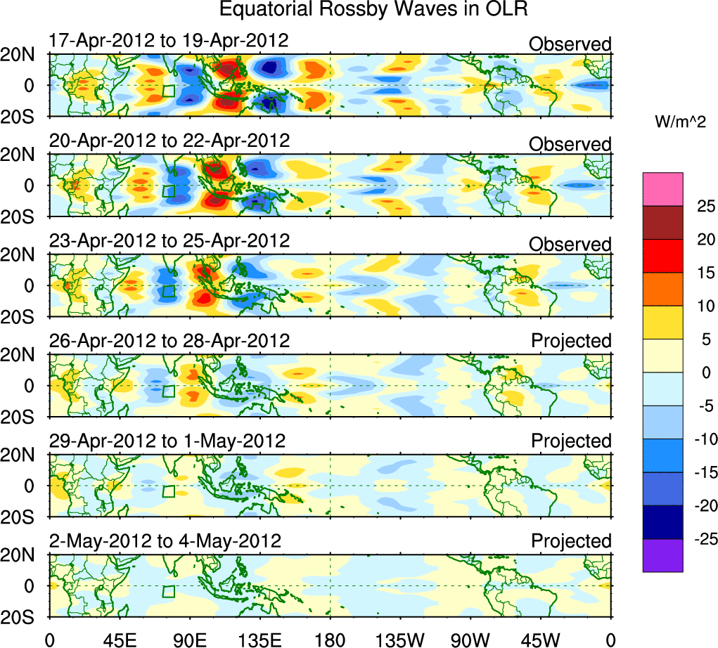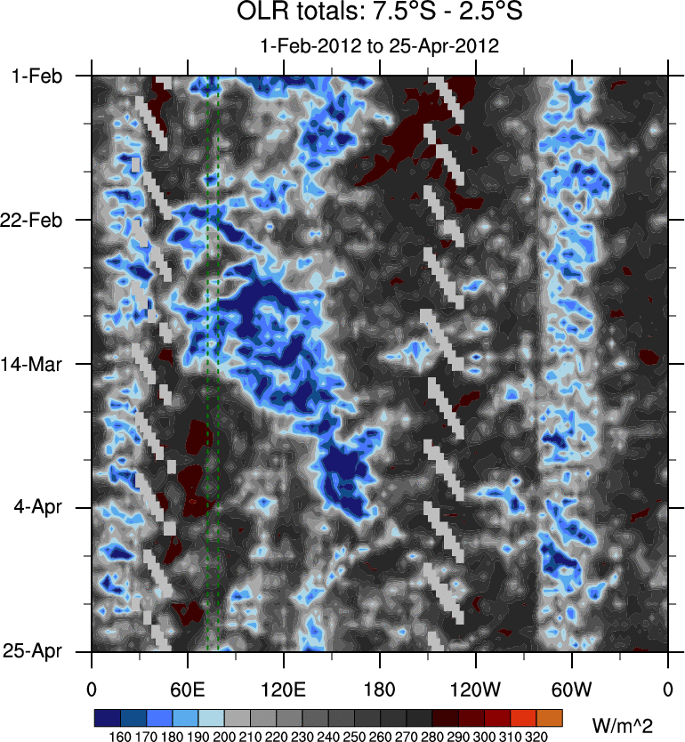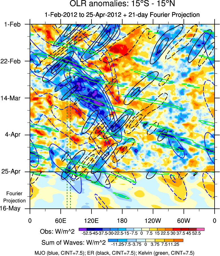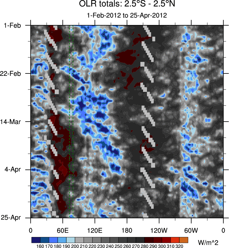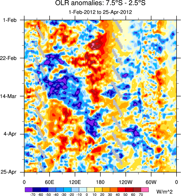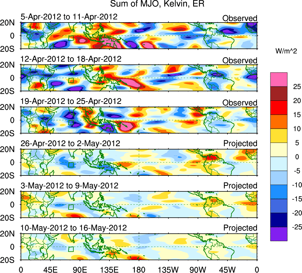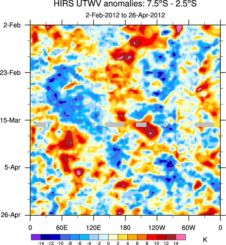 To identify tropical waves in near real-time, the OLR and UTWV data are filtered following Wheeler & Weickmann (2001 MWR). The daily anomalies are calculated using the first 3 harmonics of the seasonal cycle for 1979–2009. Missing values are then filled using linear interpolation in space and time. The most recent 365 days of anomalies are padded with 659 days of zeroes, and the result is filtered for each wave type.