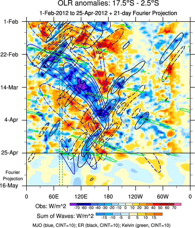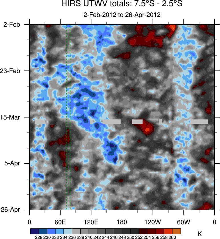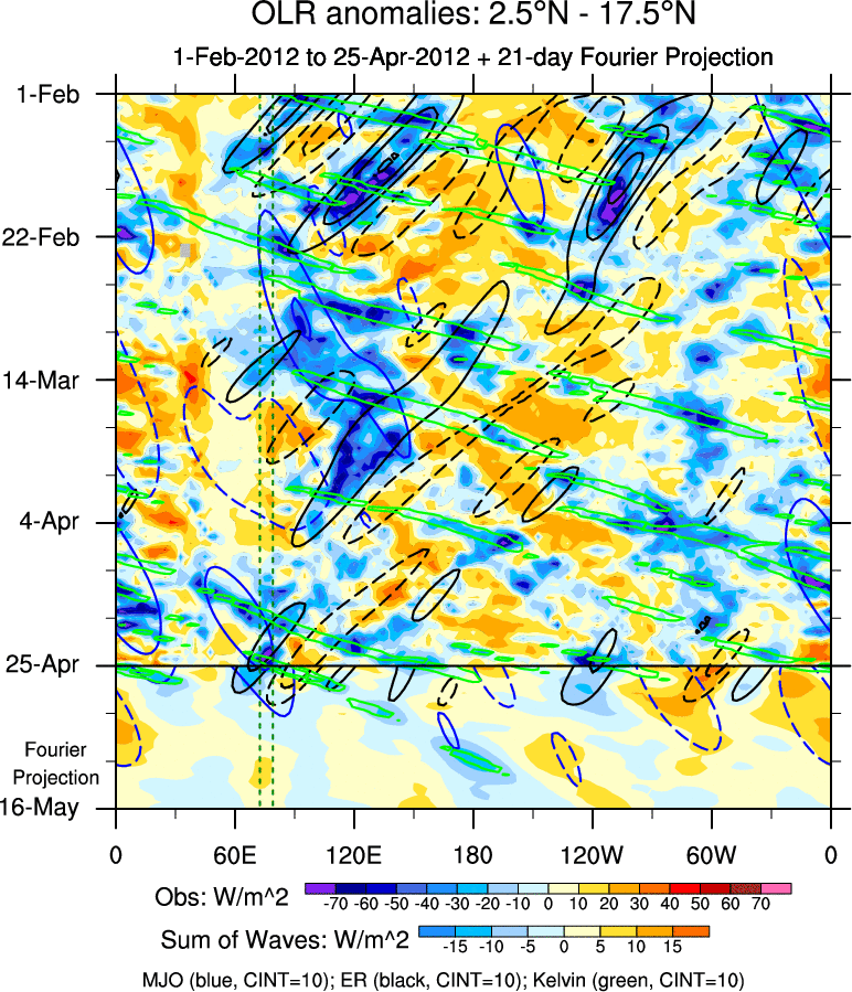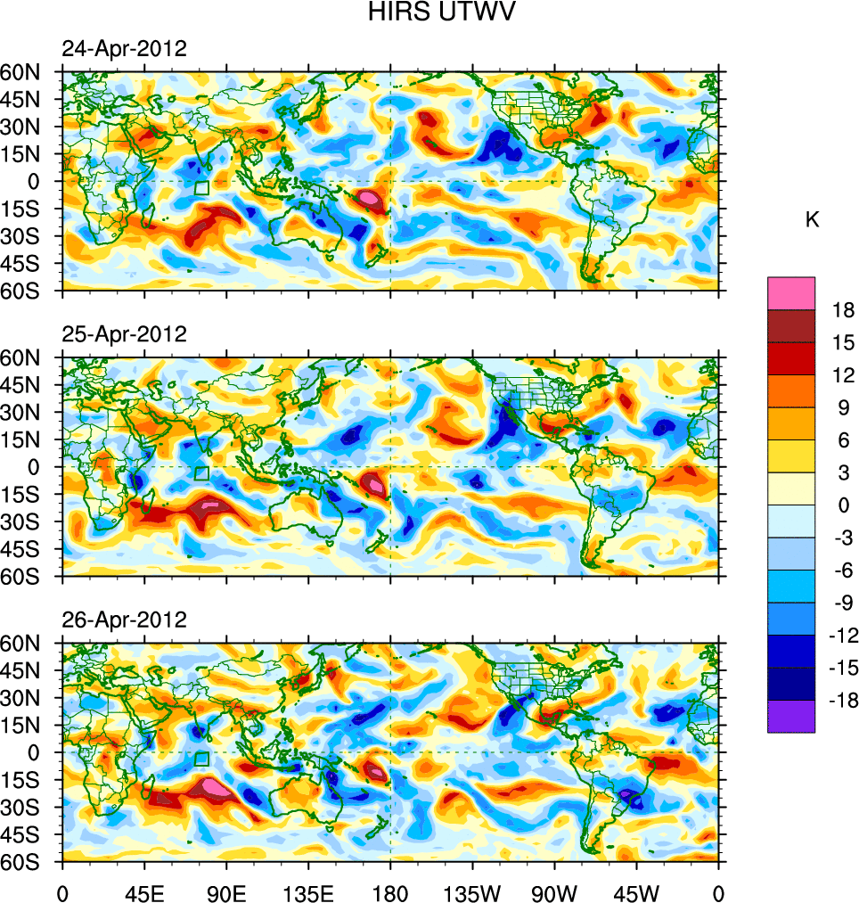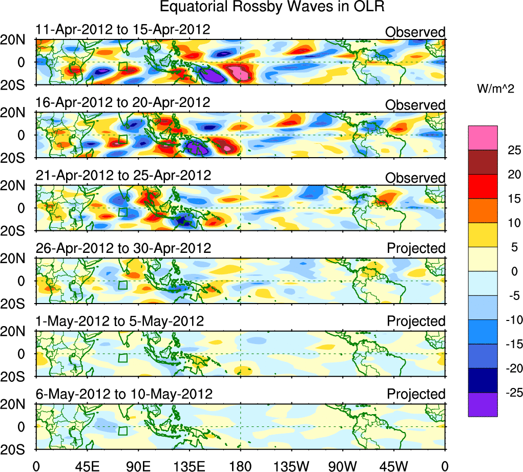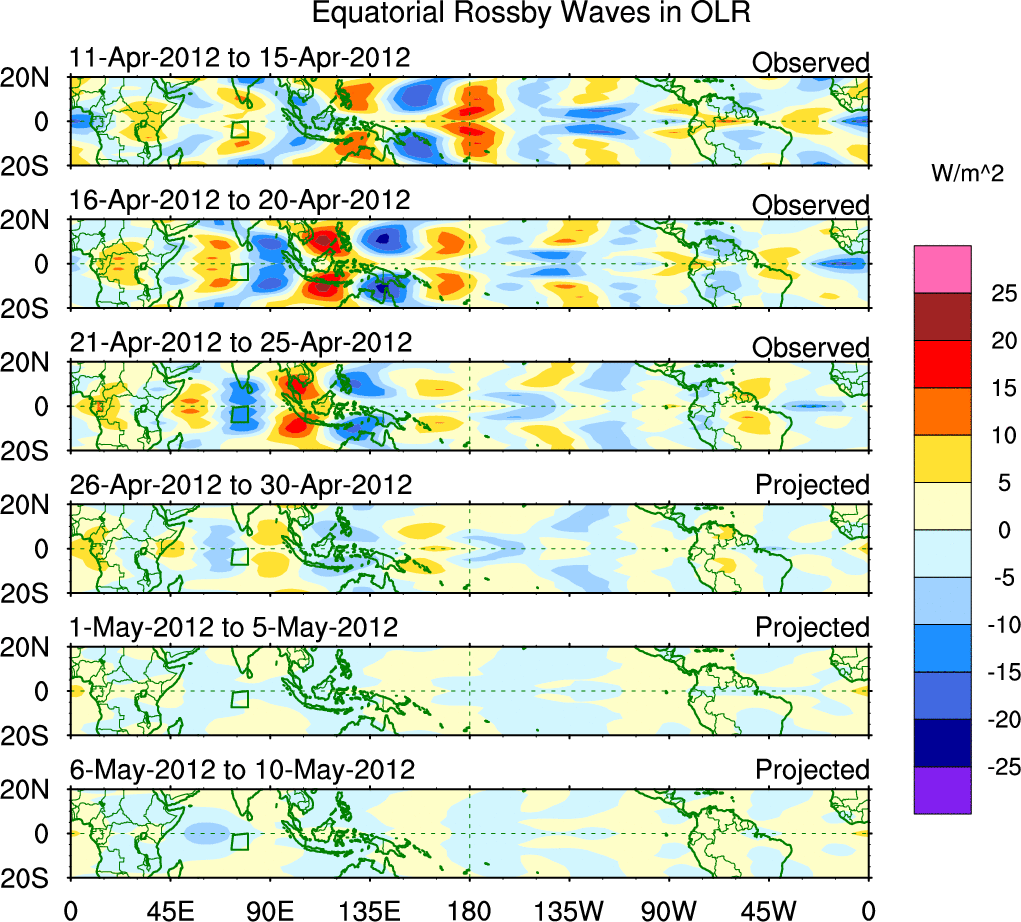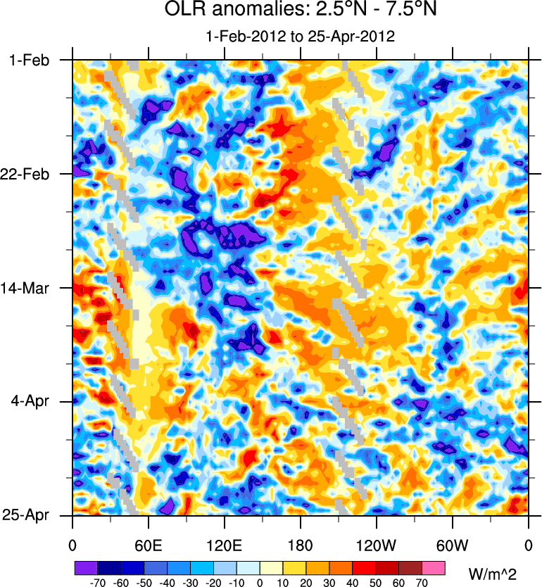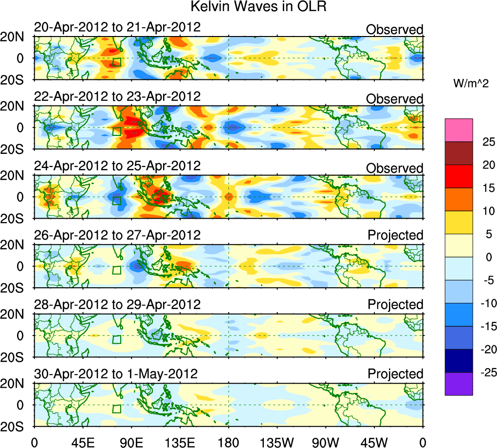 To identify tropical waves in near real-time, the OLR and UTWV data are filtered following Wheeler & Weickmann (2001 MWR). The daily anomalies are calculated using the first 3 harmonics of the seasonal cycle for 1979–2009. Missing values are then filled using linear interpolation in space and time. The most recent 365 days of anomalies are padded with 659 days of zeroes, and the result is filtered for each wave type.