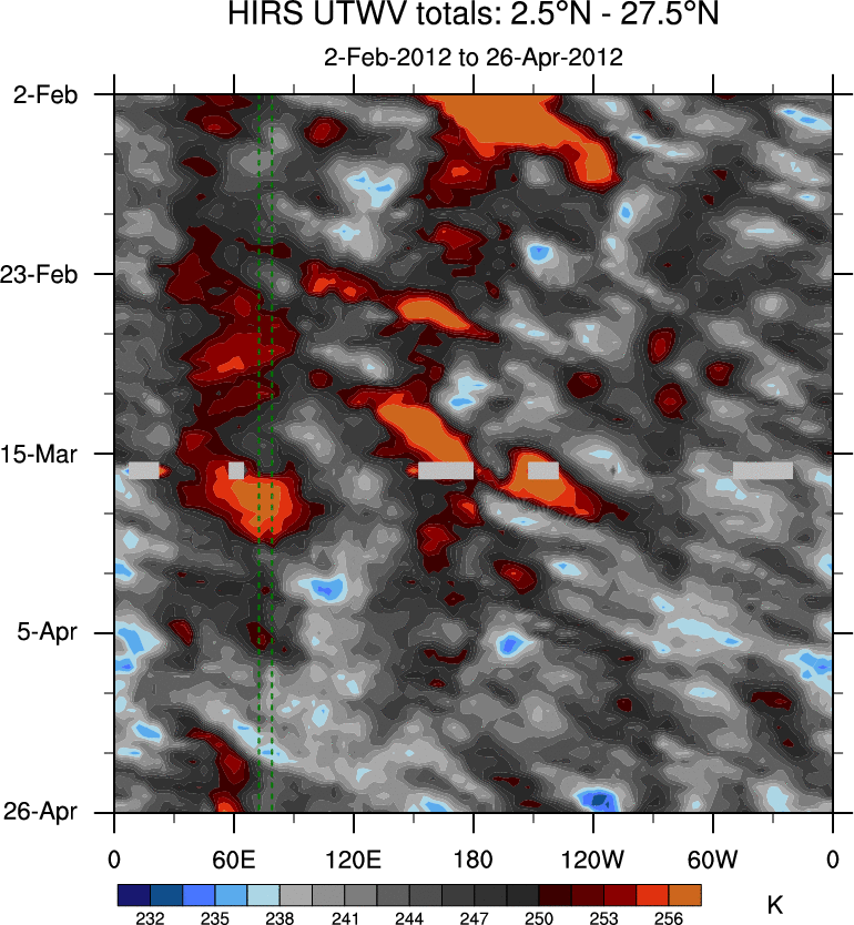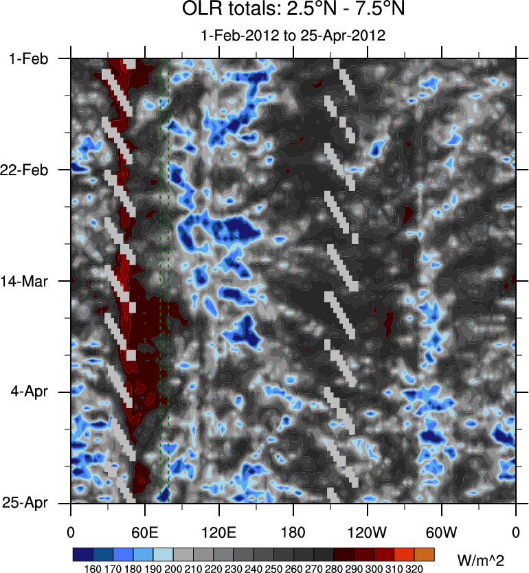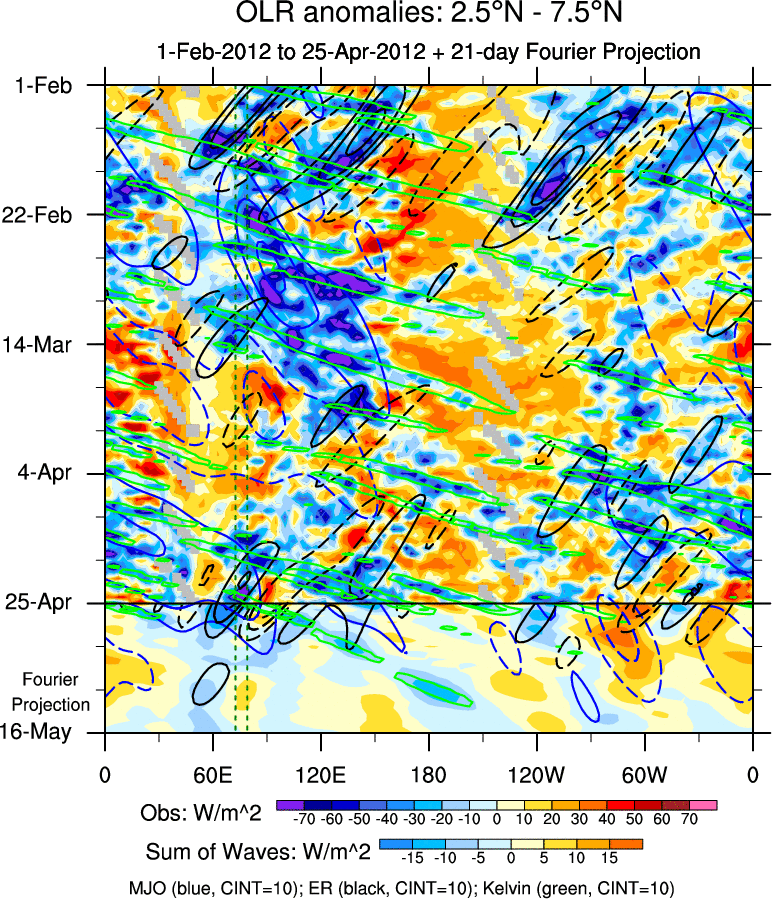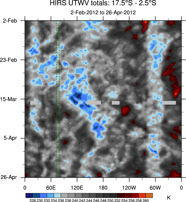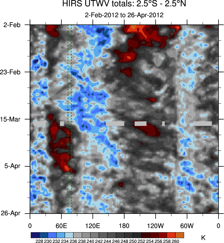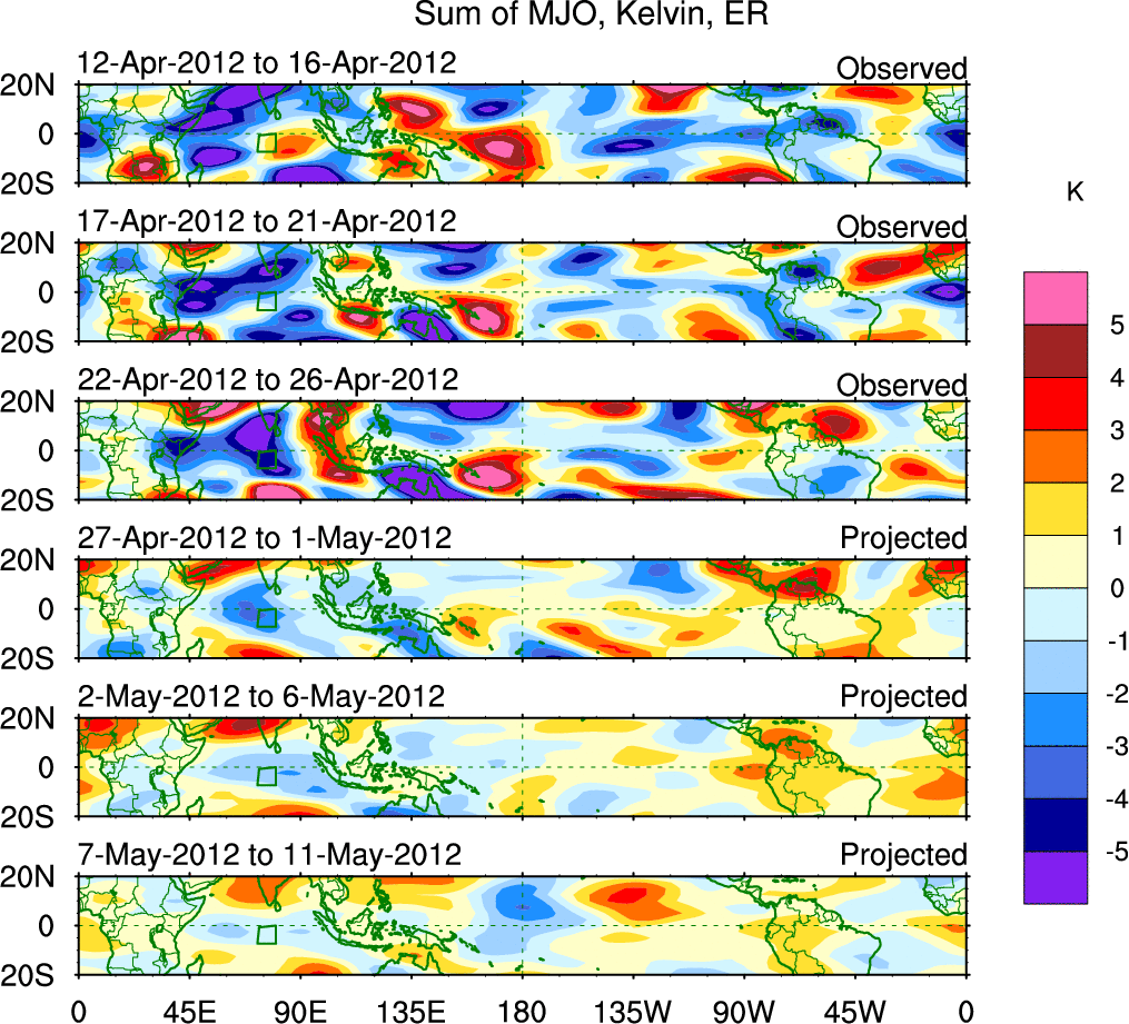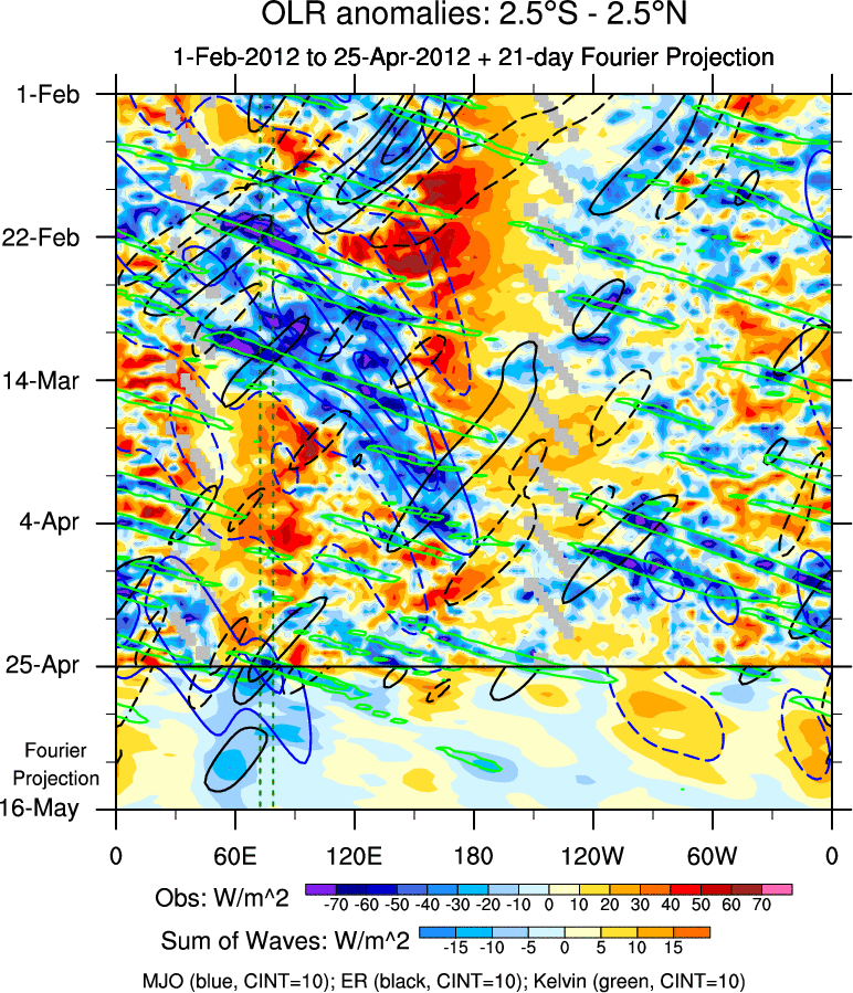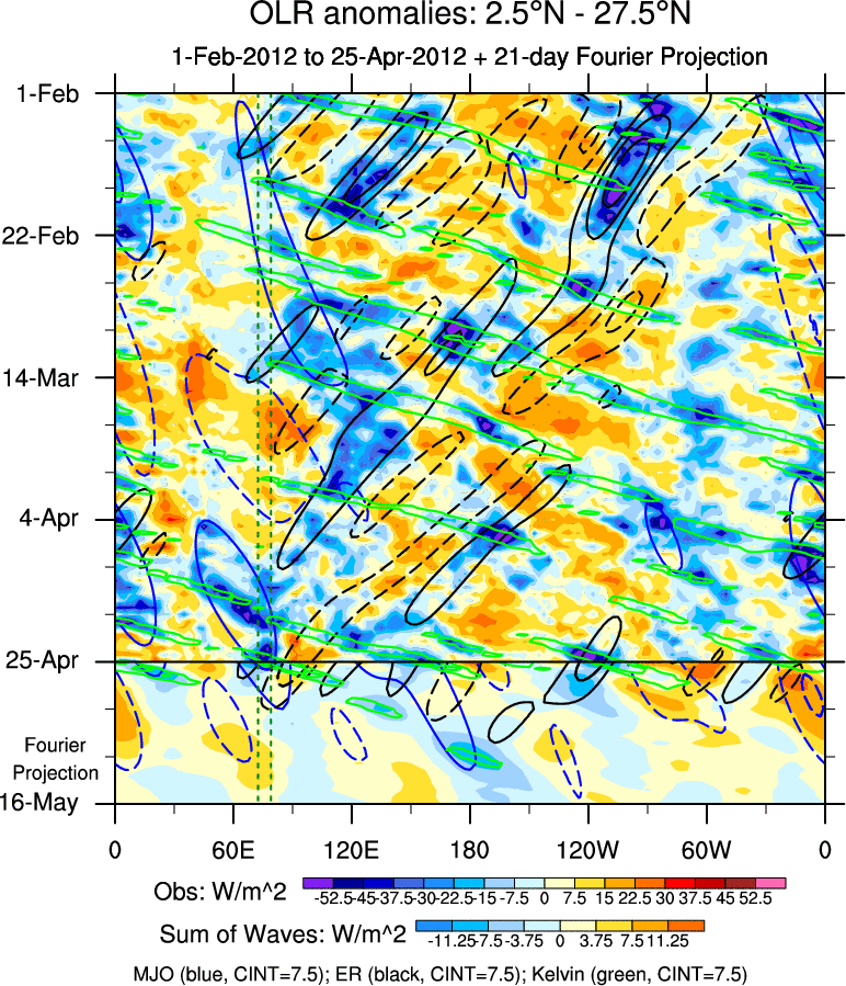To identify tropical waves in near real-time, the OLR and UTWV data are filtered following Wheeler & Weickmann (2001 MWR). The daily anomalies are calculated using the first 3 harmonics of the seasonal cycle for 1979–2009. Missing values are then filled using linear interpolation in space and time. The most recent 365 days of anomalies are padded with 659 days of zeroes, and the result is filtered for each wave type.