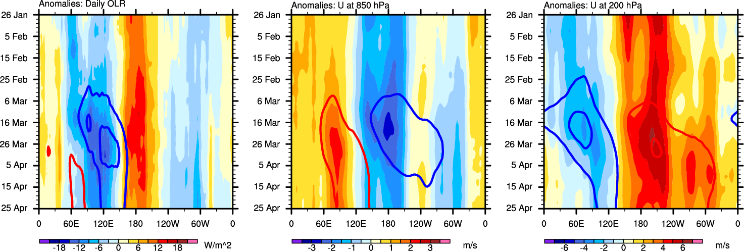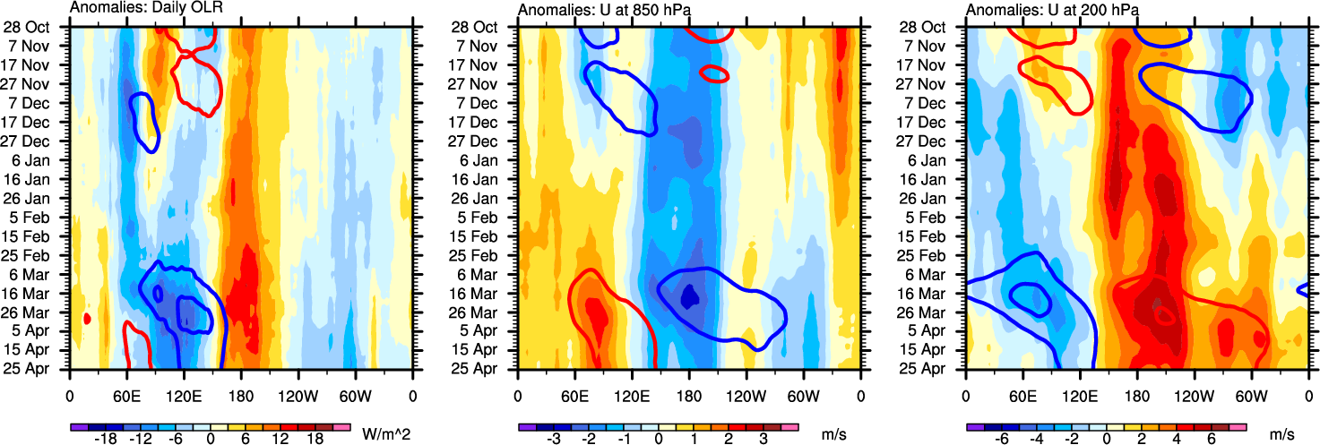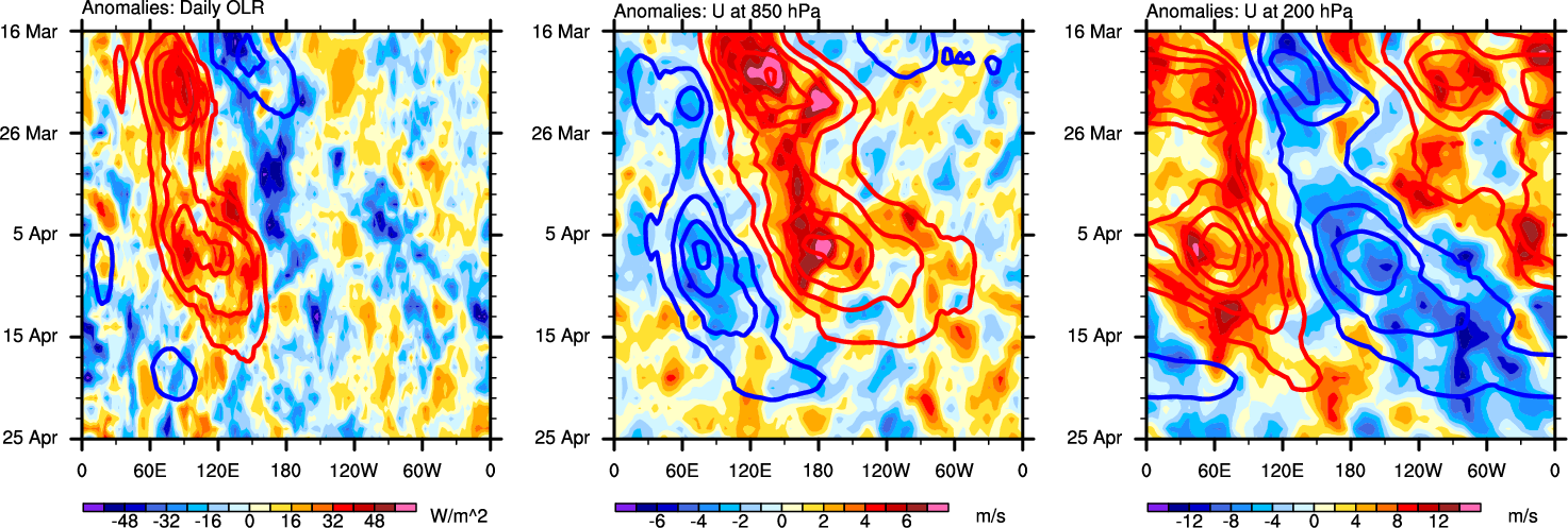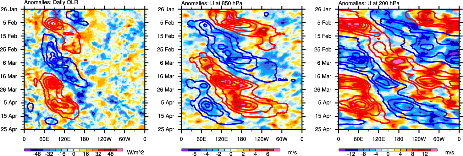 The Hovmollers show longitude-time plots for OLR, U-850, and U-200. The shading indicates the observed anomalies, while the contours are the projection of those anomalies onto the RMM EOFs.