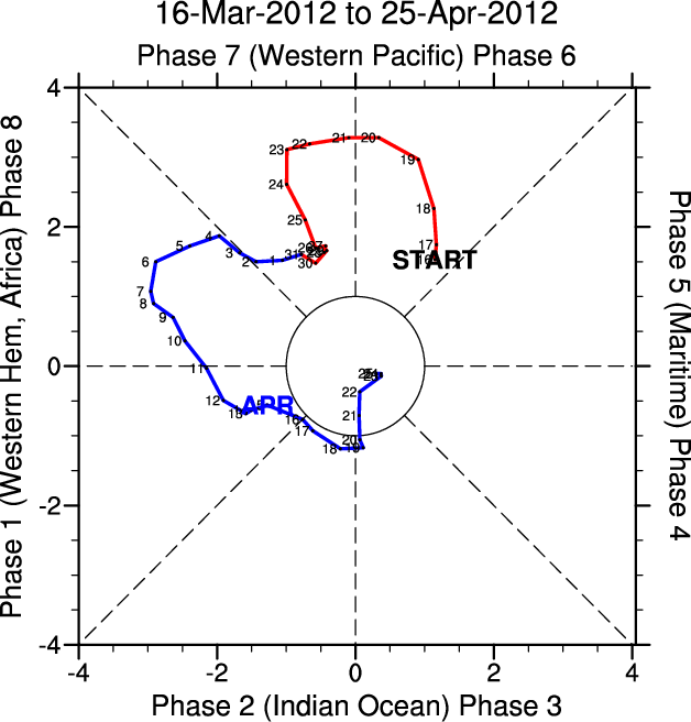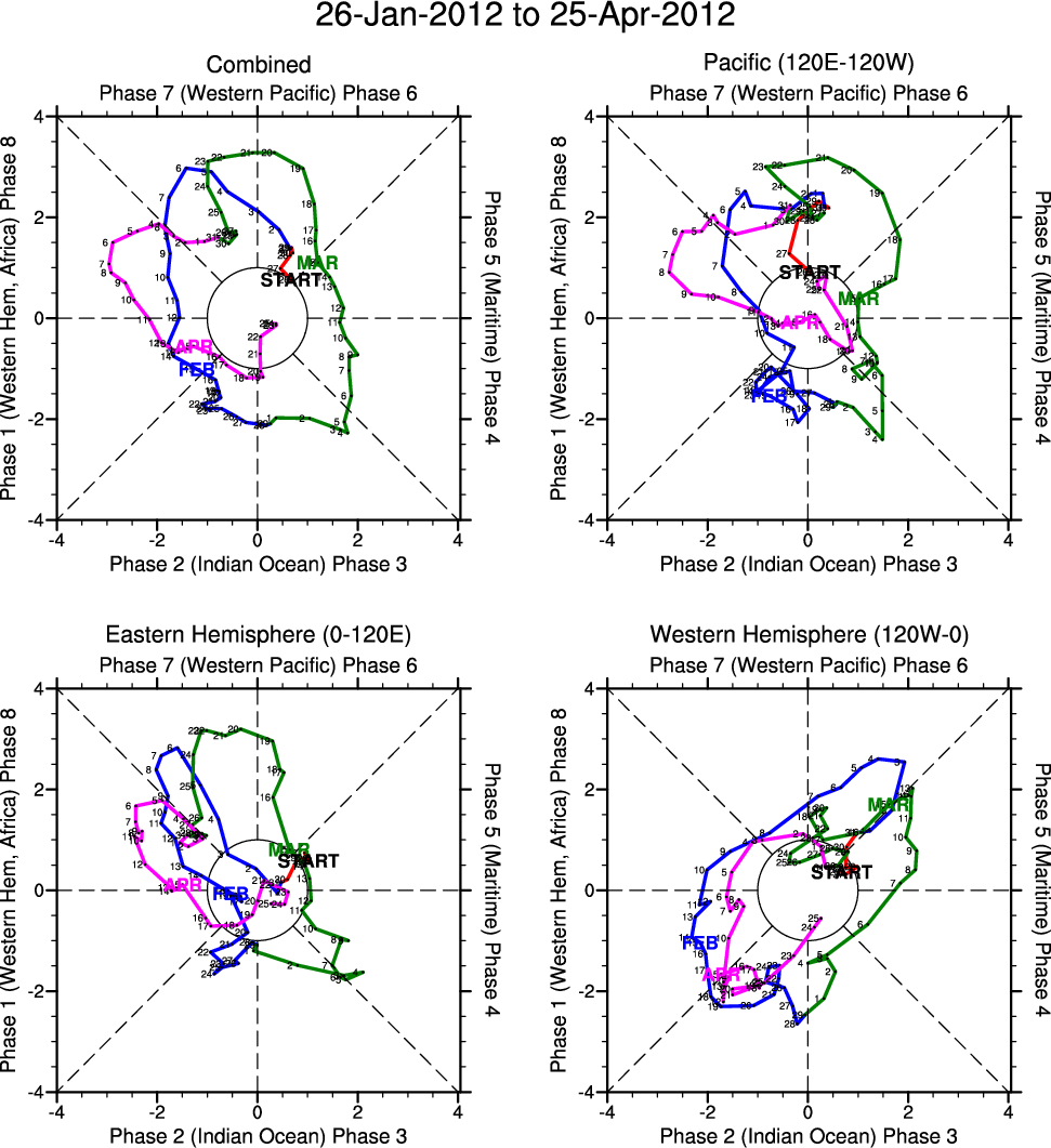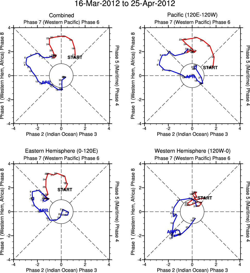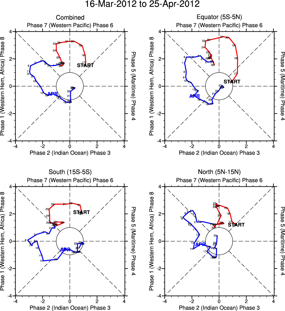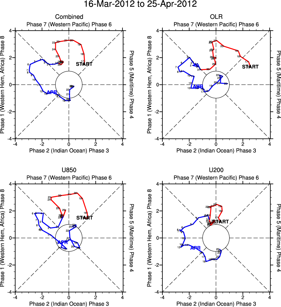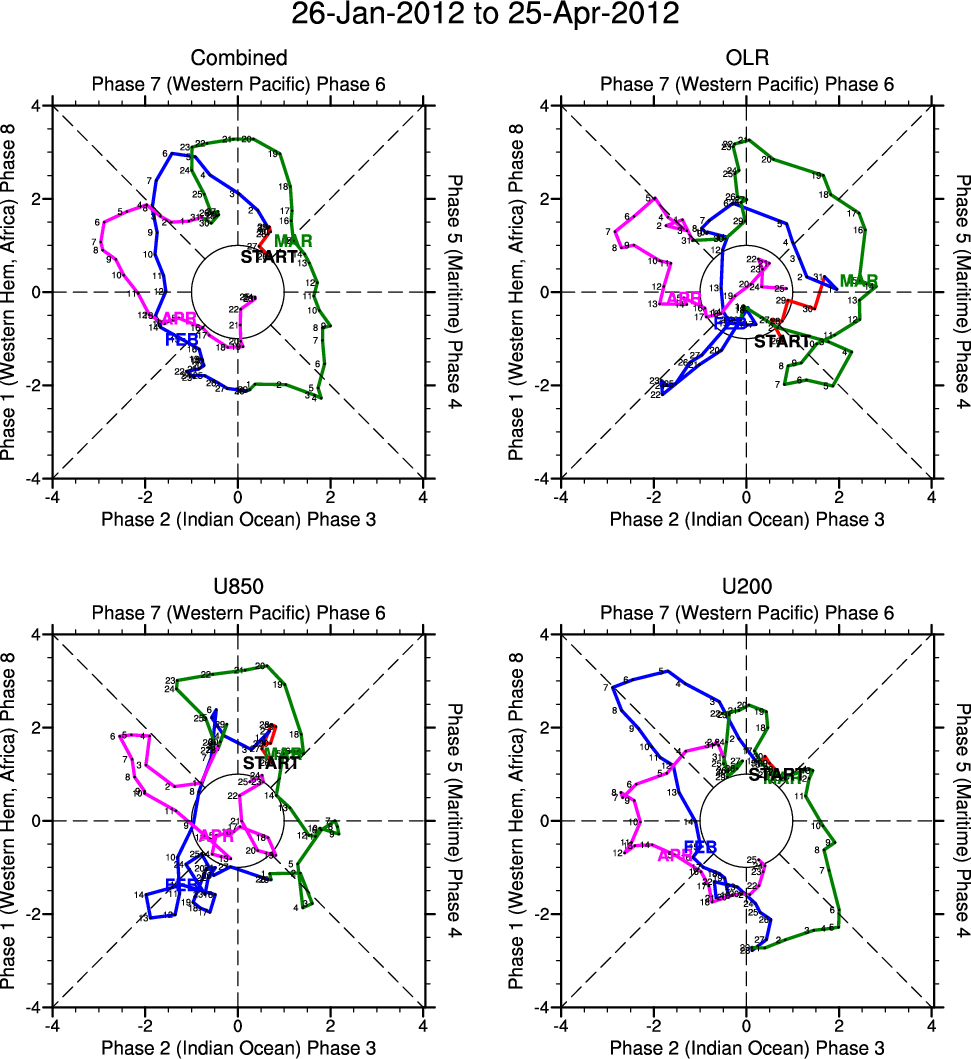 Wheeler and Hendon (2004) constructed the RMM index for monitoring the MJO. This index consists of the first two principal components (PCs) of OLR, 850-hPa zonal wind, and 200-hPa zonal wind averaged 15S-15N.