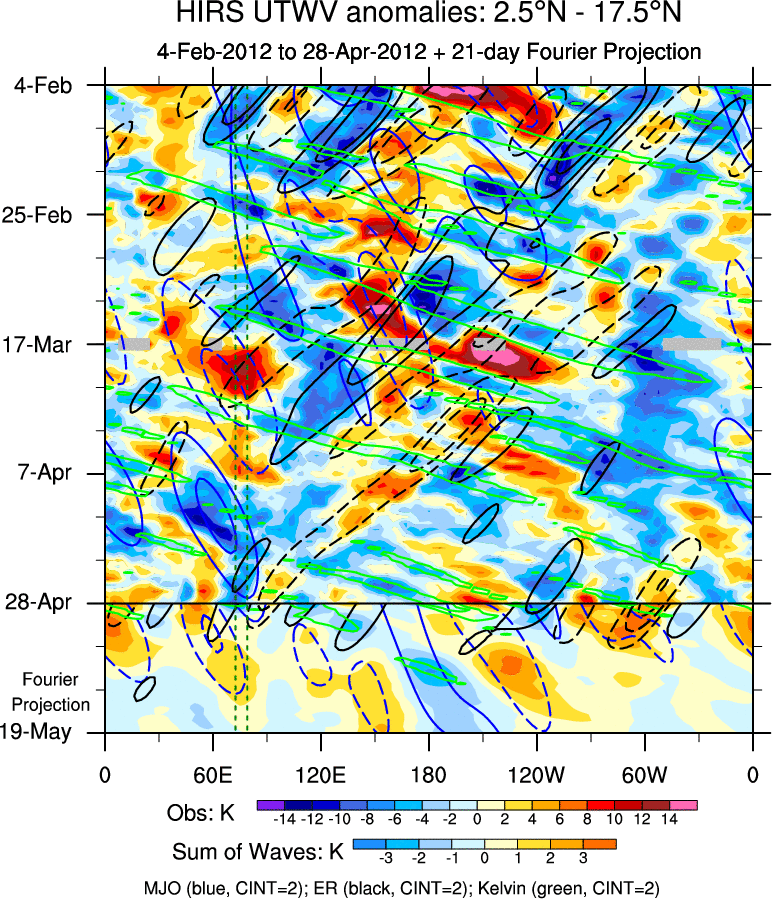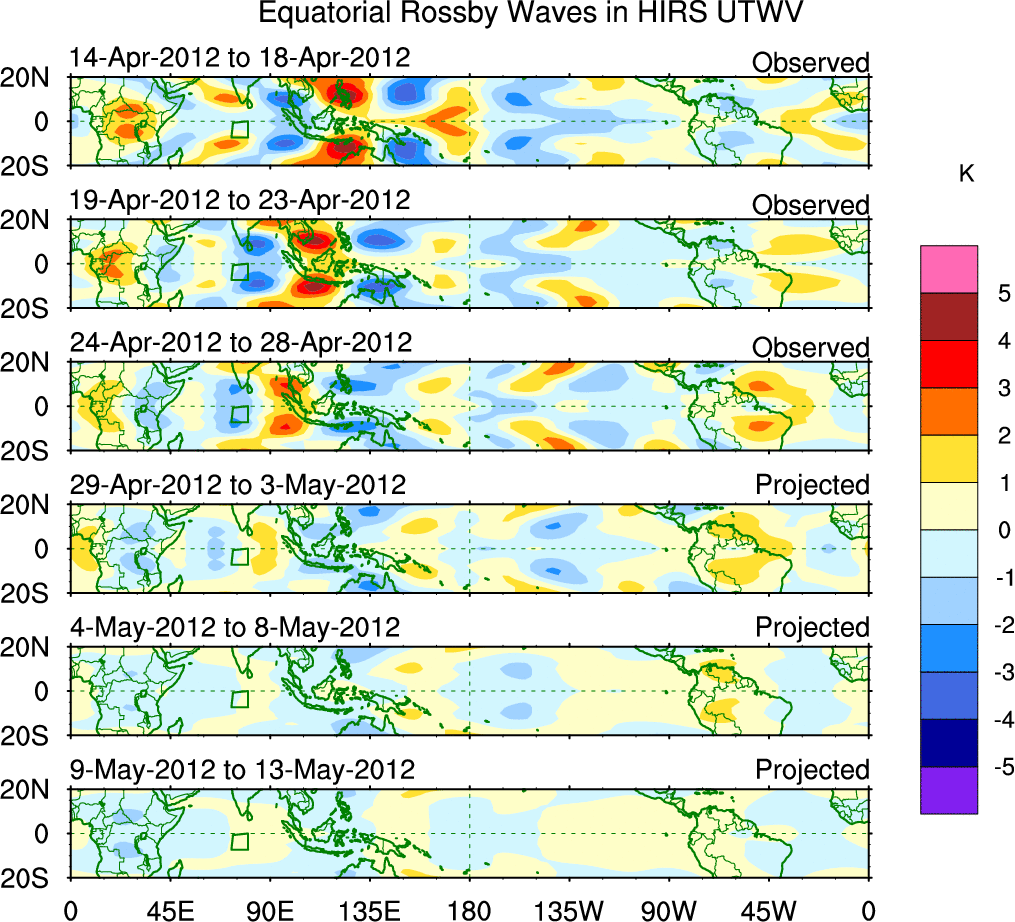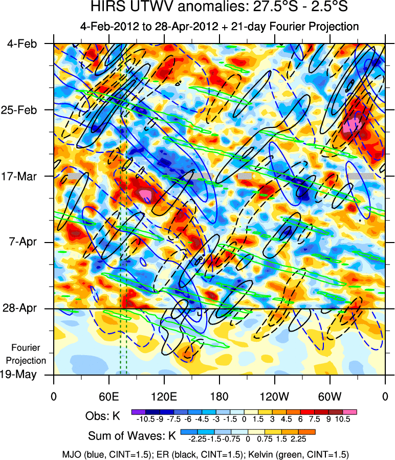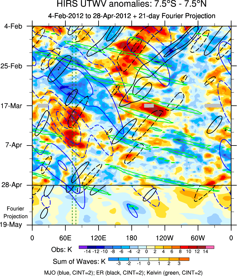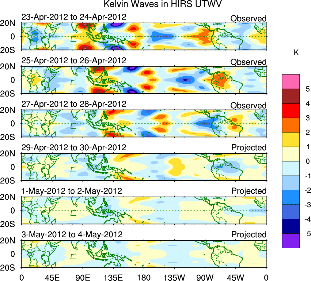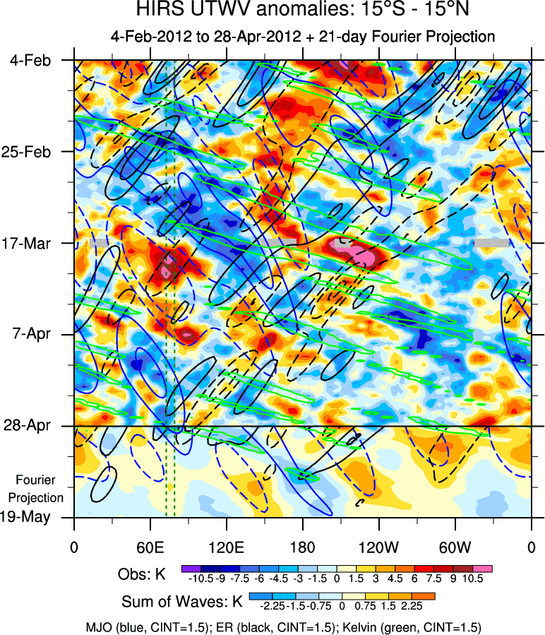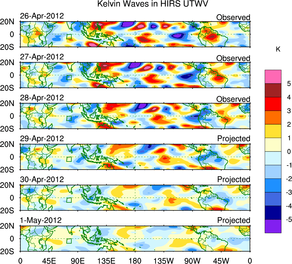To identify tropical waves in near real-time, the OLR and UTWV data are filtered following Wheeler & Weickmann (2001 MWR). The daily anomalies are calculated using the first 3 harmonics of the seasonal cycle for 1979–2009. Missing values are then filled using linear interpolation in space and time. The most recent 365 days of anomalies are padded with 659 days of zeroes, and the result is filtered for each wave type.