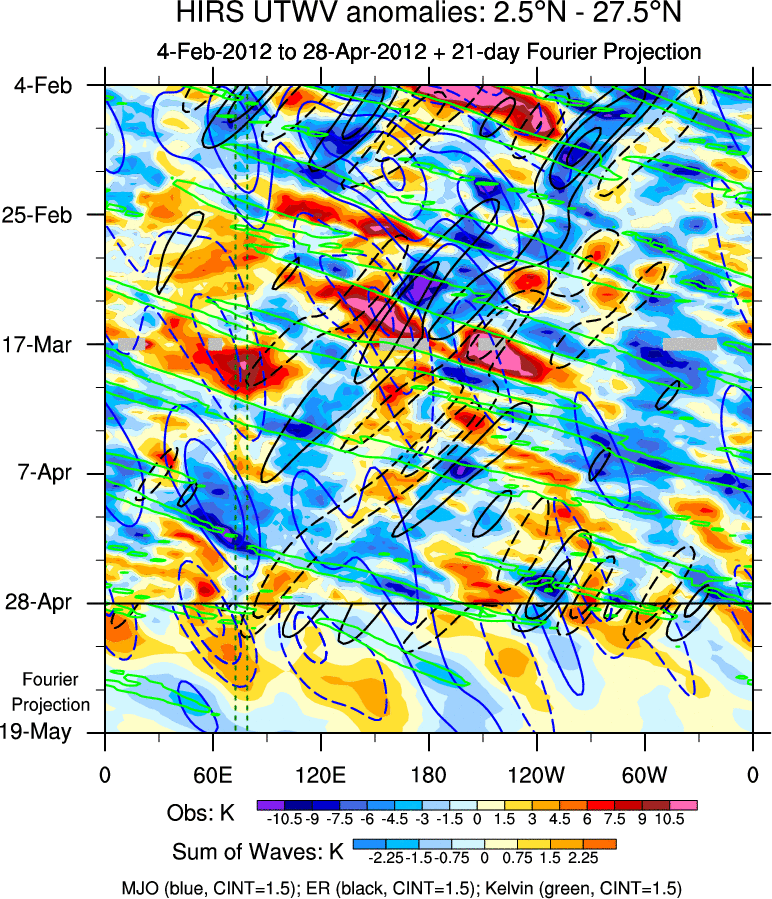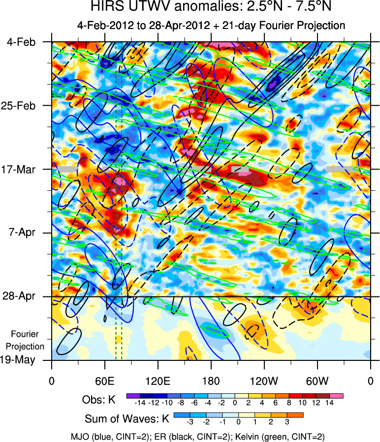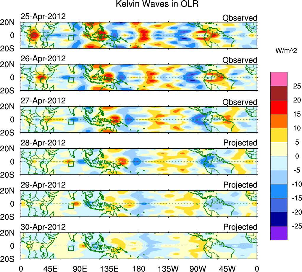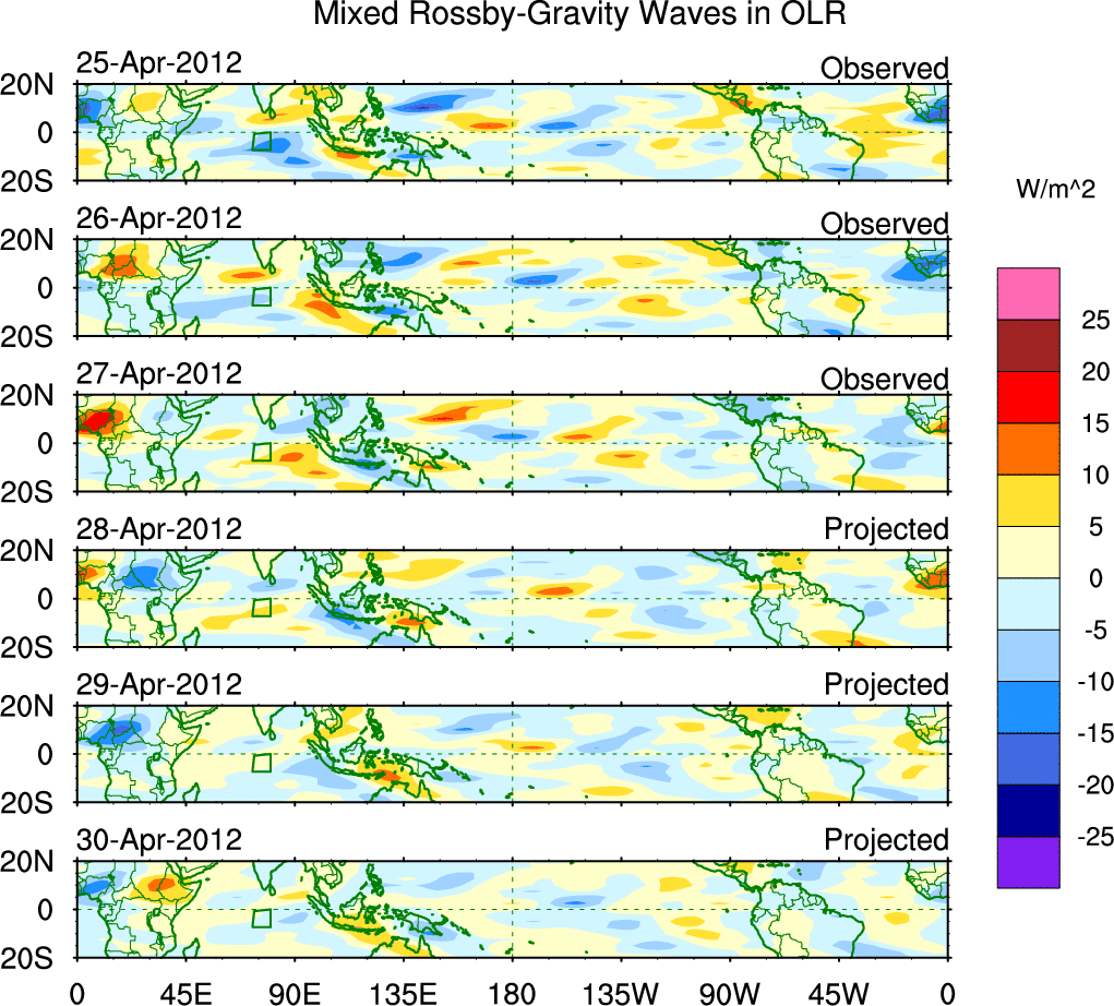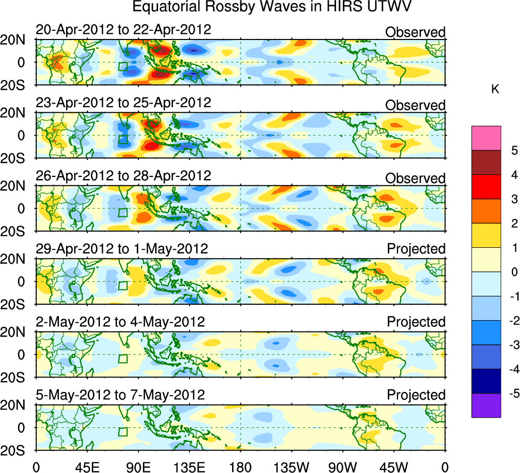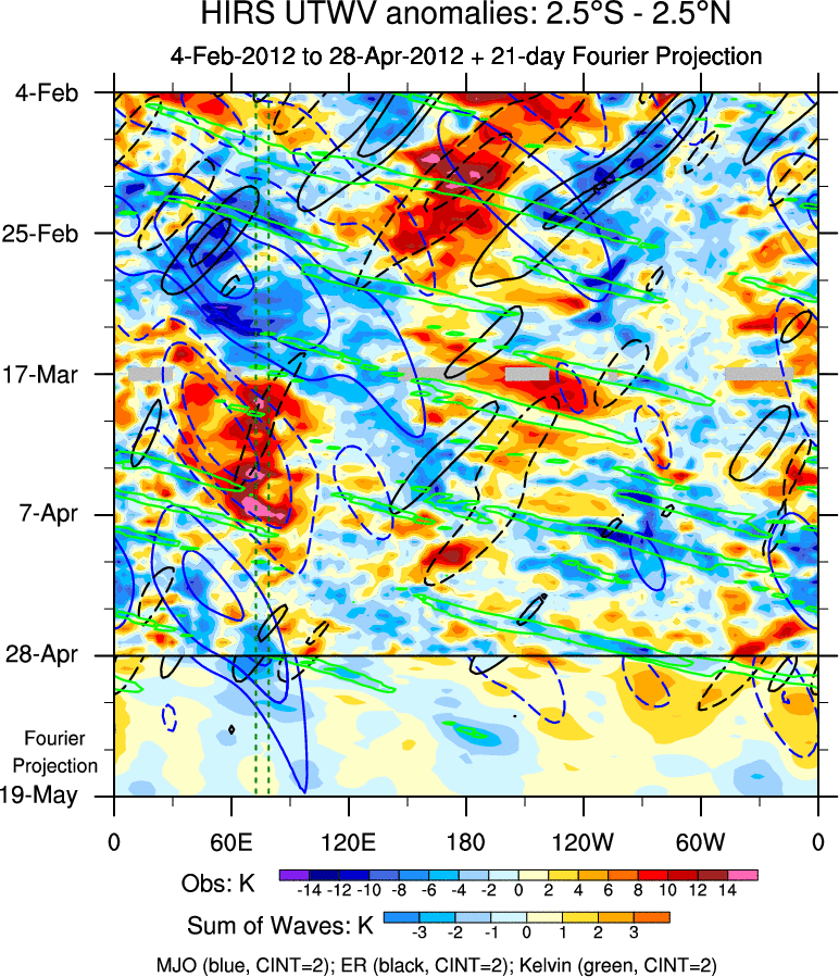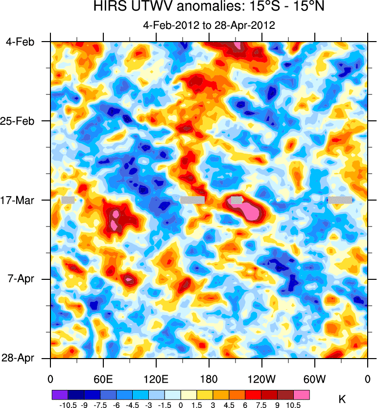 To identify tropical waves in near real-time, the OLR and UTWV data are filtered following Wheeler & Weickmann (2001 MWR). The daily anomalies are calculated using the first 3 harmonics of the seasonal cycle for 1979–2009. Missing values are then filled using linear interpolation in space and time. The most recent 365 days of anomalies are padded with 659 days of zeroes, and the result is filtered for each wave type.