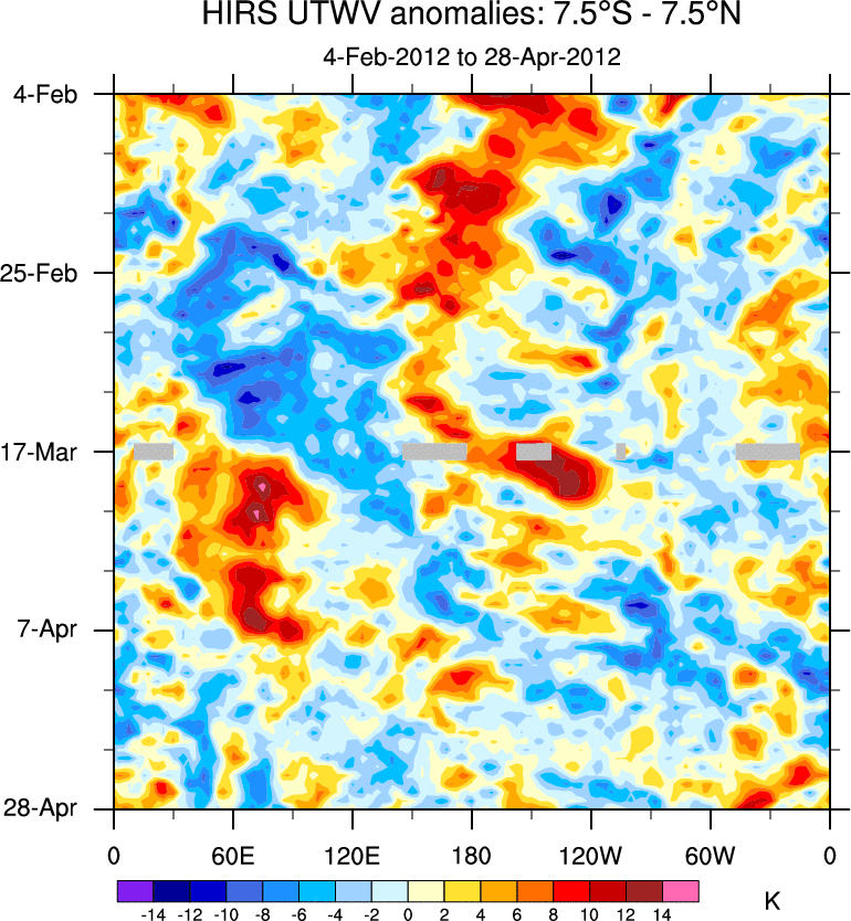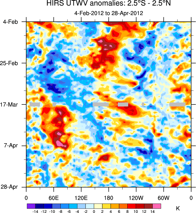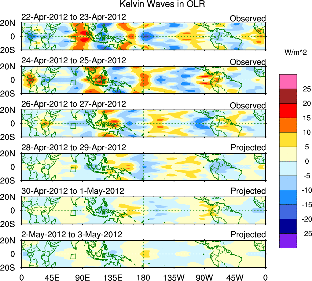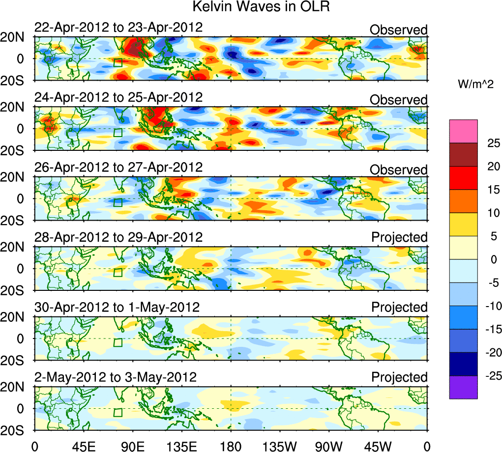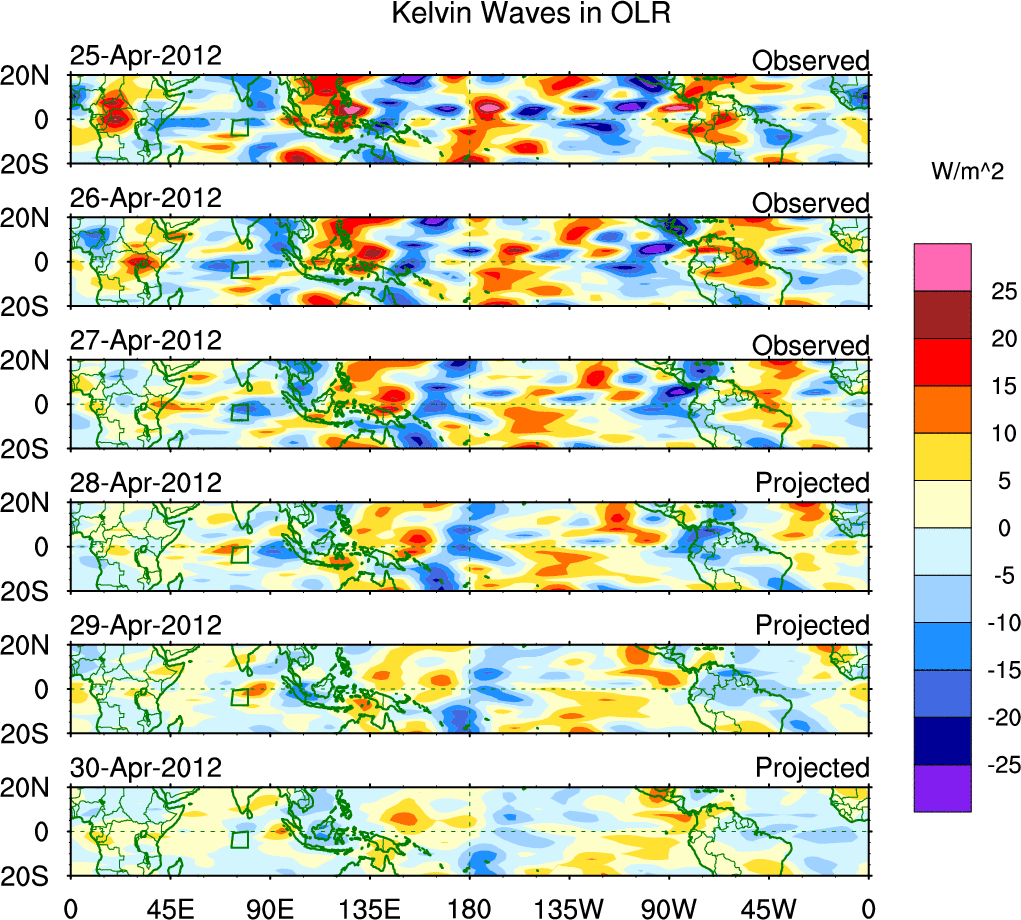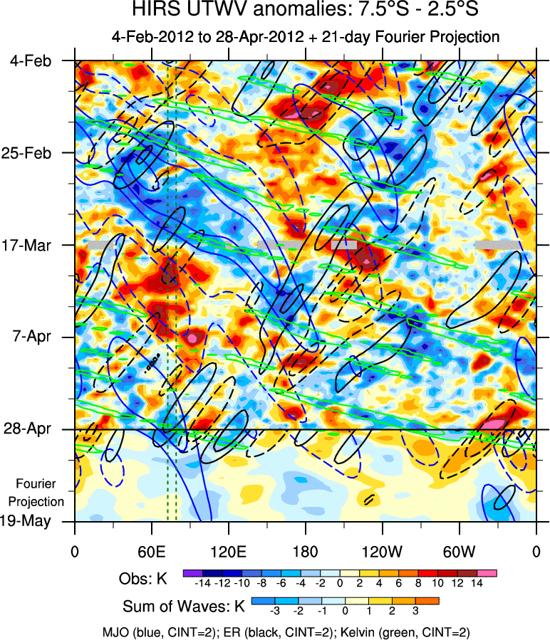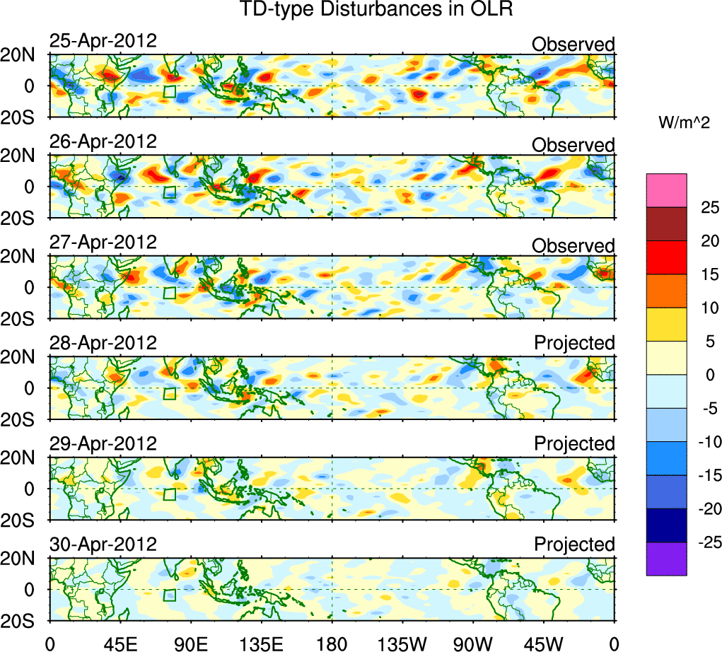 To identify tropical waves in near real-time, the OLR and UTWV data are filtered following Wheeler & Weickmann (2001 MWR). The daily anomalies are calculated using the first 3 harmonics of the seasonal cycle for 1979–2009. Missing values are then filled using linear interpolation in space and time. The most recent 365 days of anomalies are padded with 659 days of zeroes, and the result is filtered for each wave type.