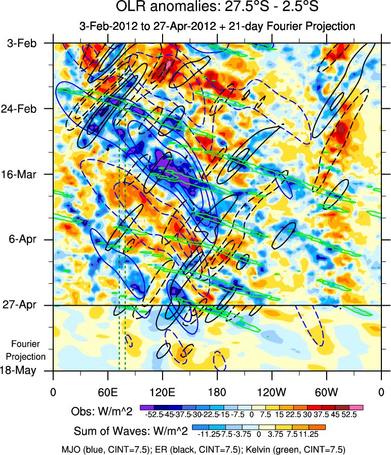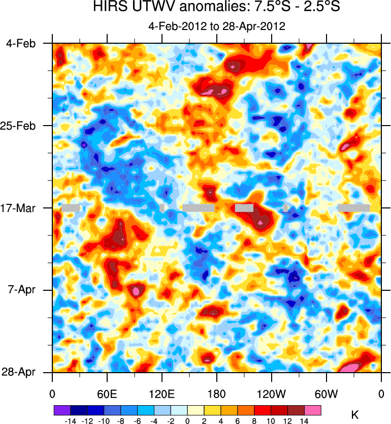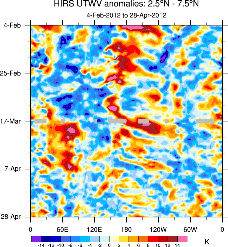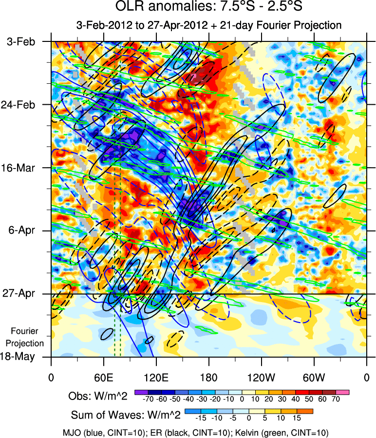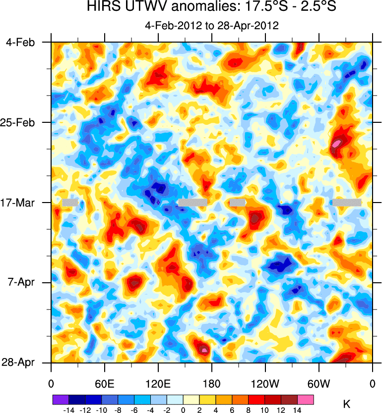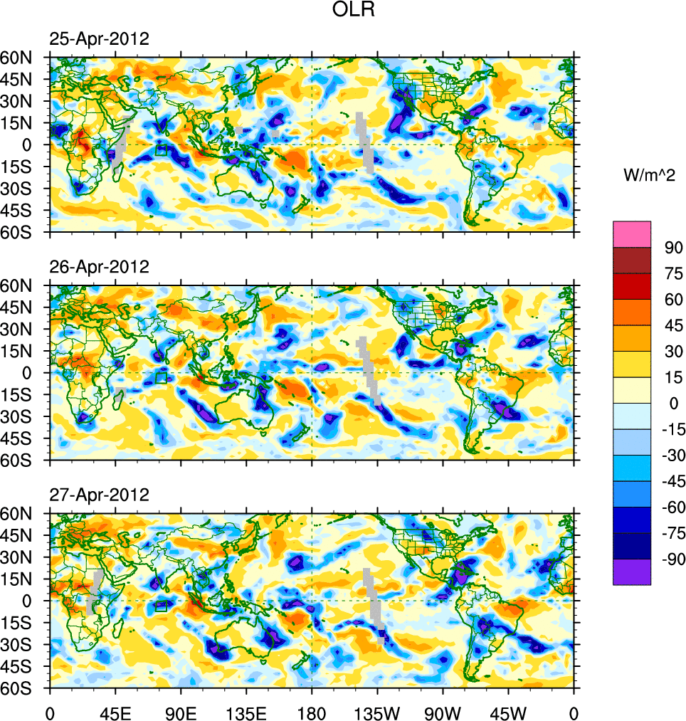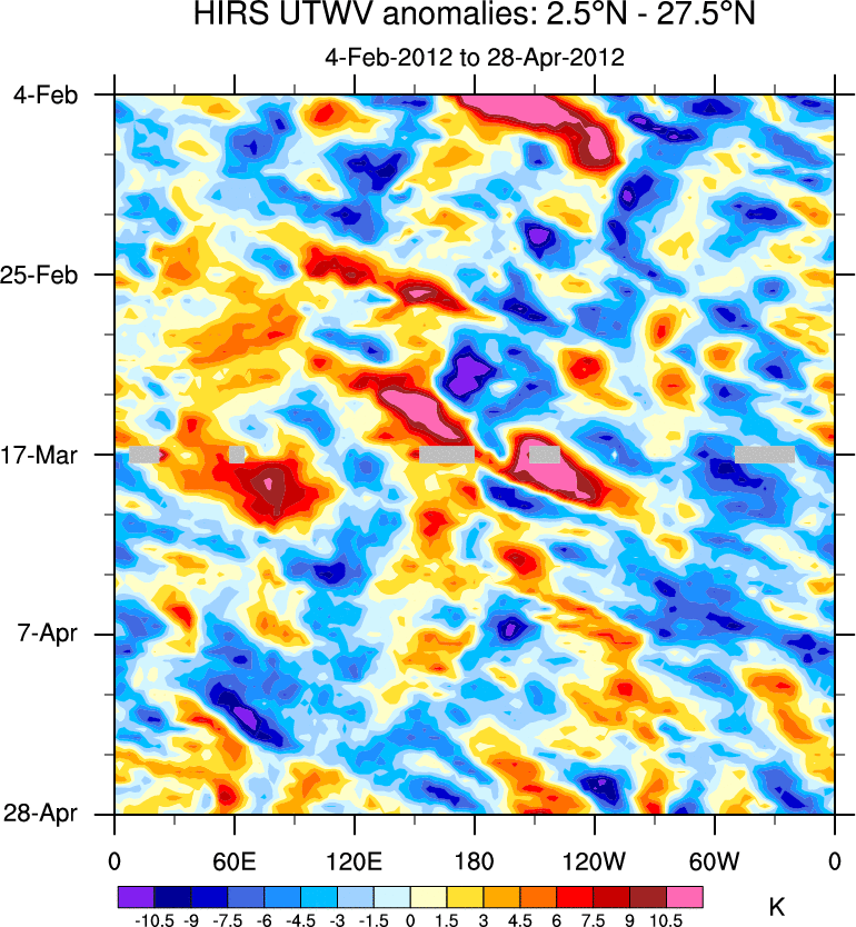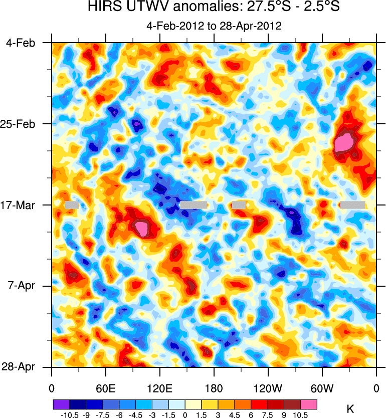 To identify tropical waves in near real-time, the OLR and UTWV data are filtered following Wheeler & Weickmann (2001 MWR). The daily anomalies are calculated using the first 3 harmonics of the seasonal cycle for 1979–2009. Missing values are then filled using linear interpolation in space and time. The most recent 365 days of anomalies are padded with 659 days of zeroes, and the result is filtered for each wave type.