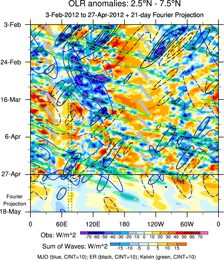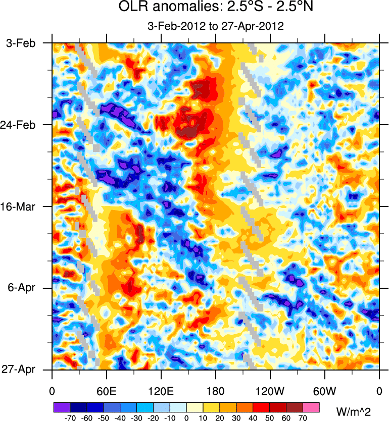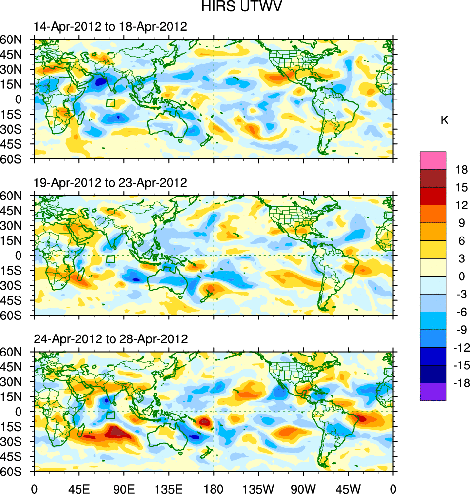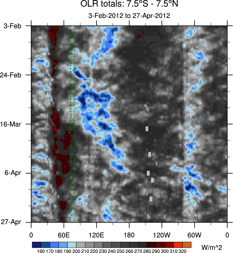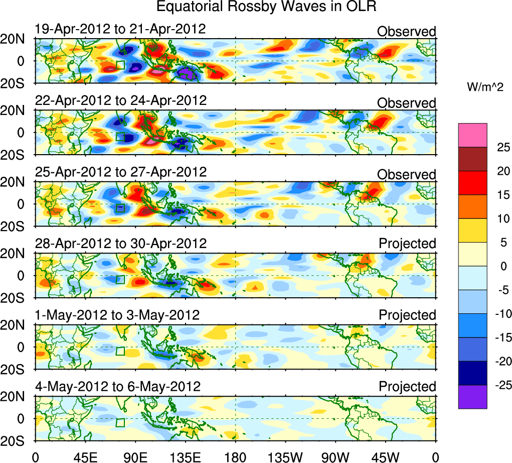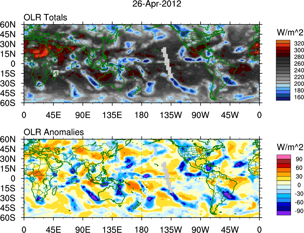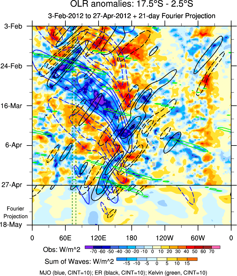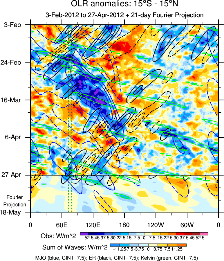 To identify tropical waves in near real-time, the OLR and UTWV data are filtered following Wheeler & Weickmann (2001 MWR). The daily anomalies are calculated using the first 3 harmonics of the seasonal cycle for 1979–2009. Missing values are then filled using linear interpolation in space and time. The most recent 365 days of anomalies are padded with 659 days of zeroes, and the result is filtered for each wave type.