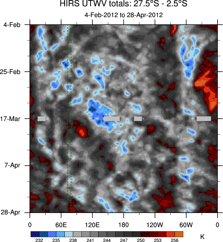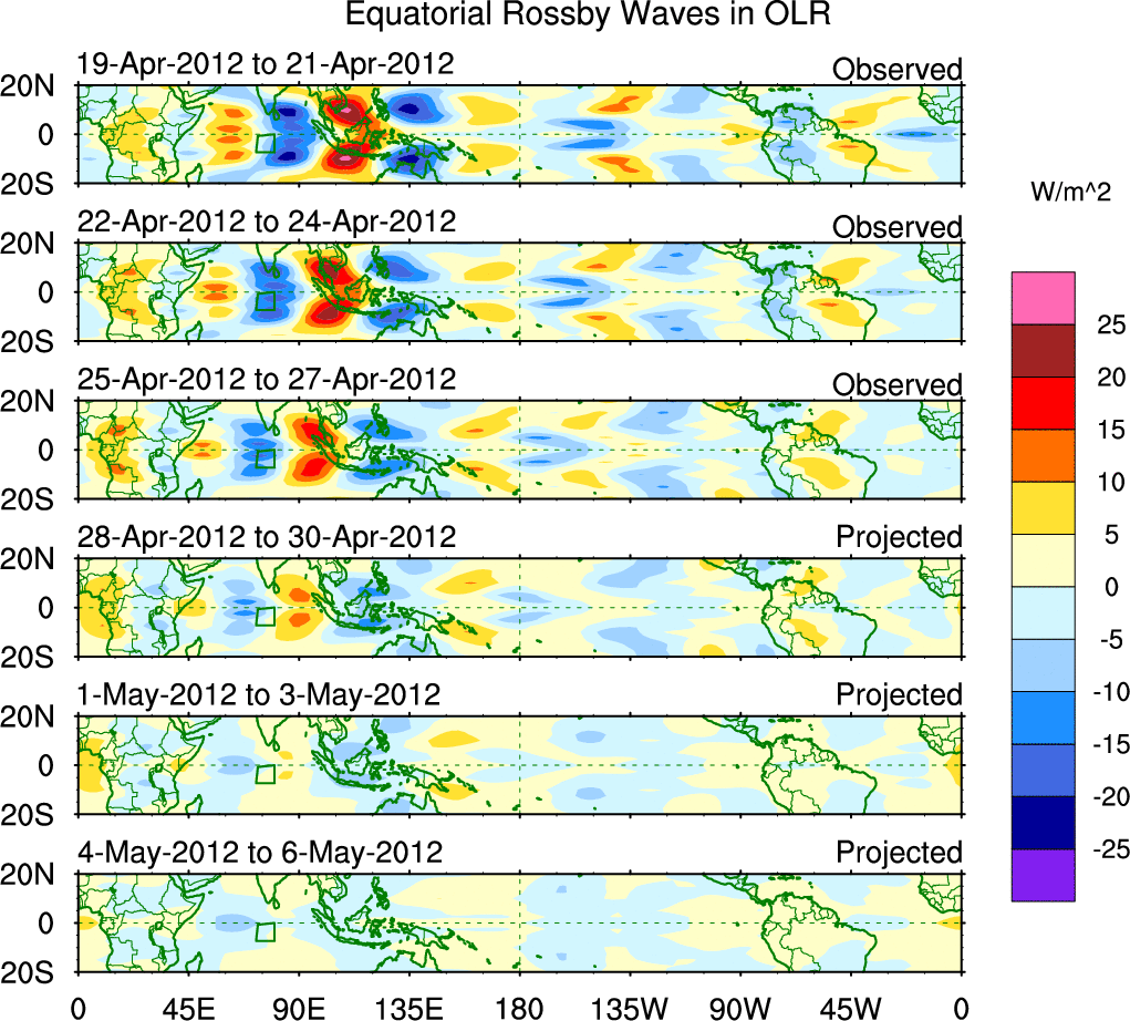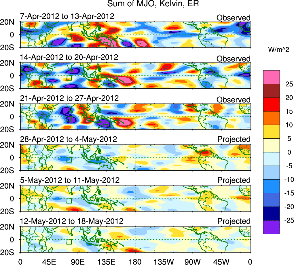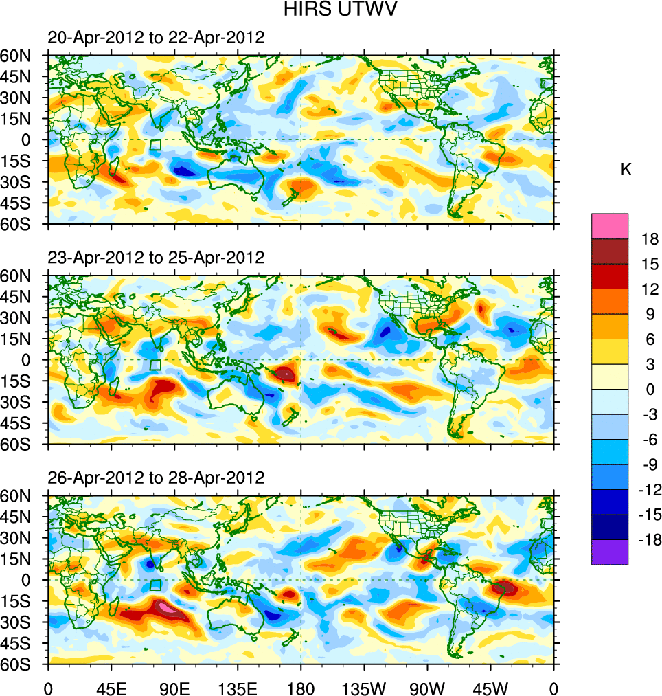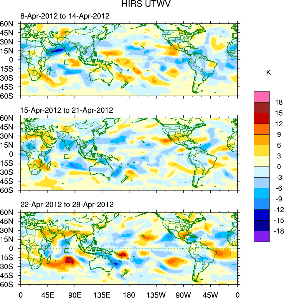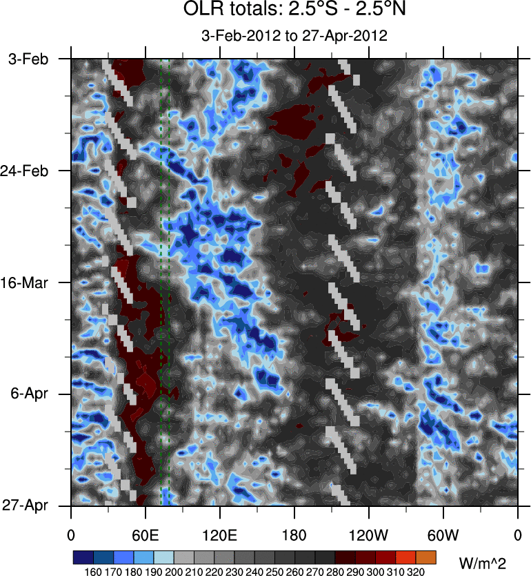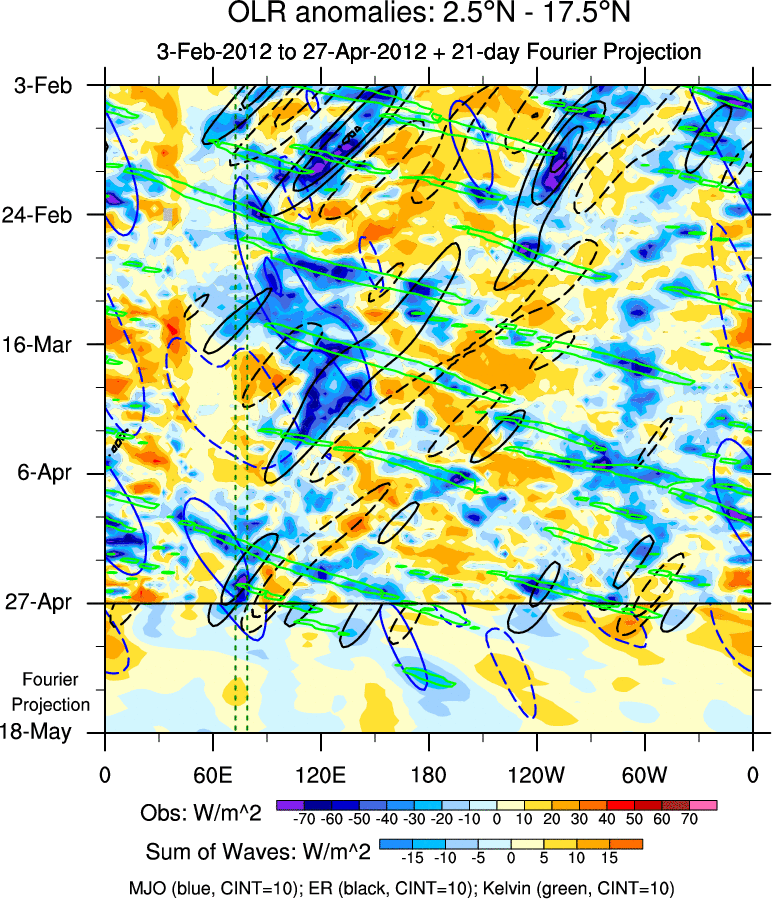 To identify tropical waves in near real-time, the OLR and UTWV data are filtered following Wheeler & Weickmann (2001 MWR). The daily anomalies are calculated using the first 3 harmonics of the seasonal cycle for 1979–2009. Missing values are then filled using linear interpolation in space and time. The most recent 365 days of anomalies are padded with 659 days of zeroes, and the result is filtered for each wave type.