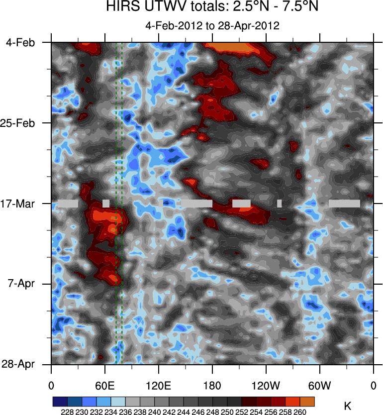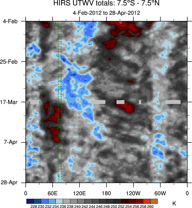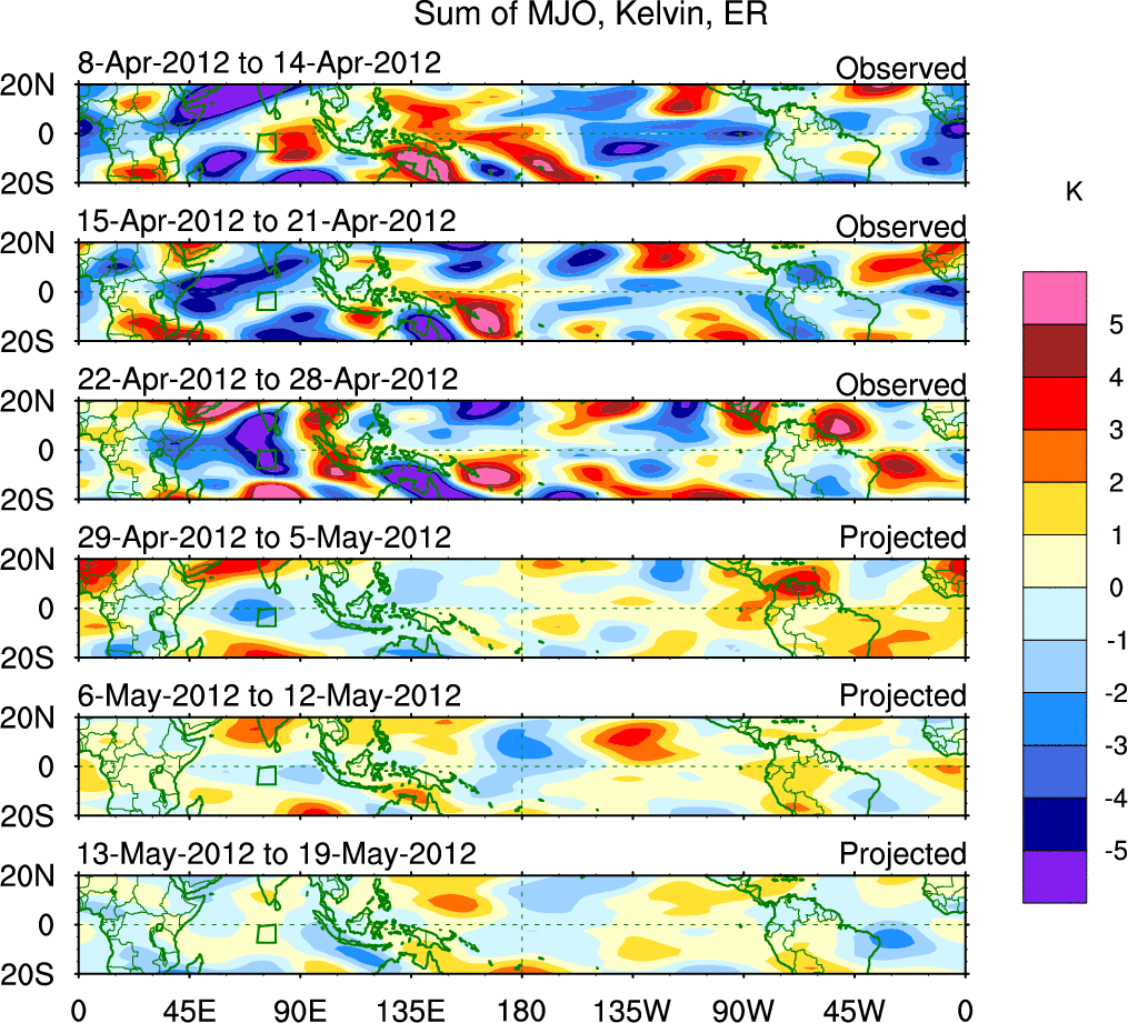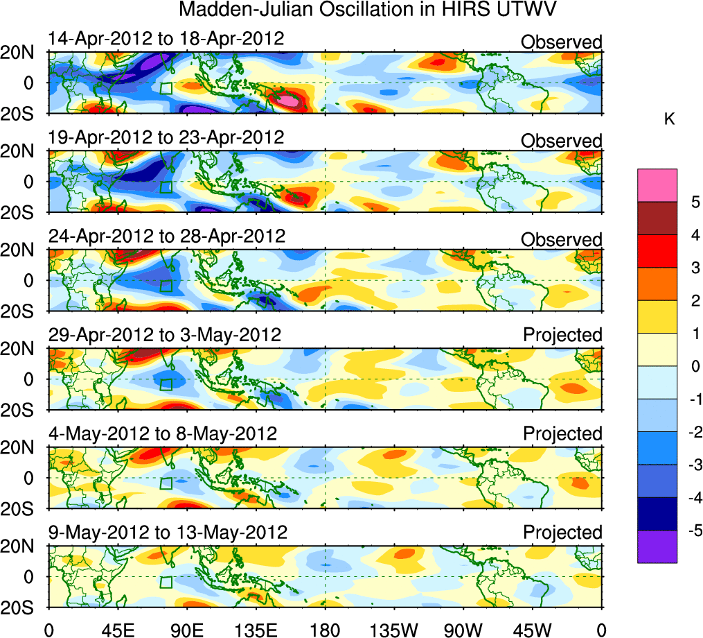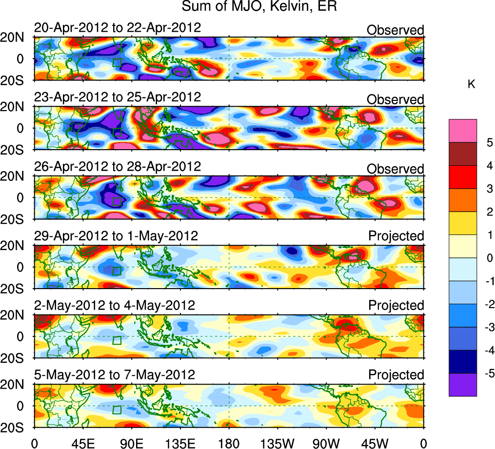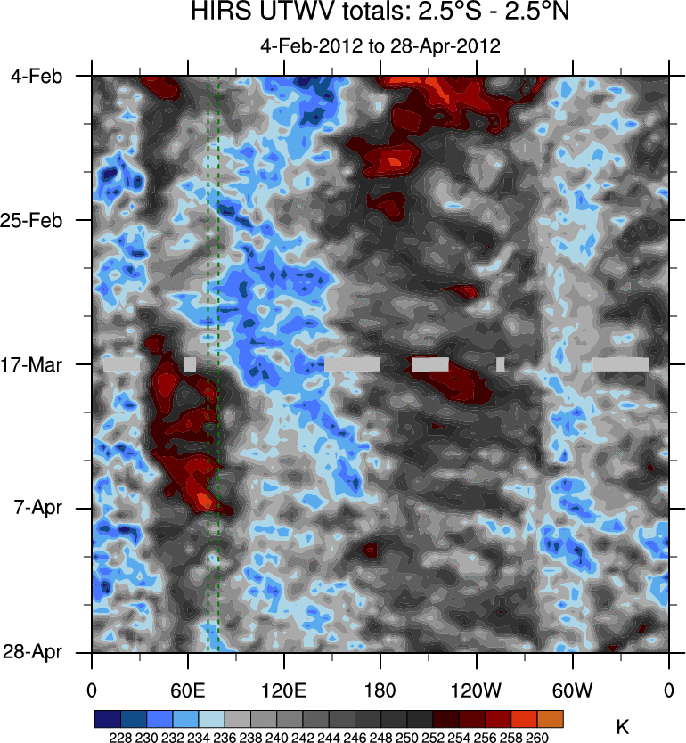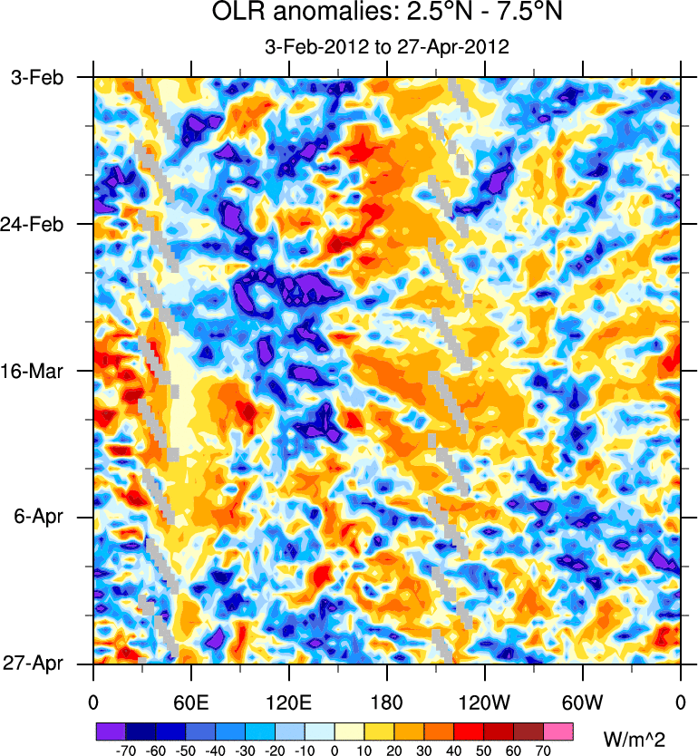 To identify tropical waves in near real-time, the OLR and UTWV data are filtered following Wheeler & Weickmann (2001 MWR). The daily anomalies are calculated using the first 3 harmonics of the seasonal cycle for 1979–2009. Missing values are then filled using linear interpolation in space and time. The most recent 365 days of anomalies are padded with 659 days of zeroes, and the result is filtered for each wave type.