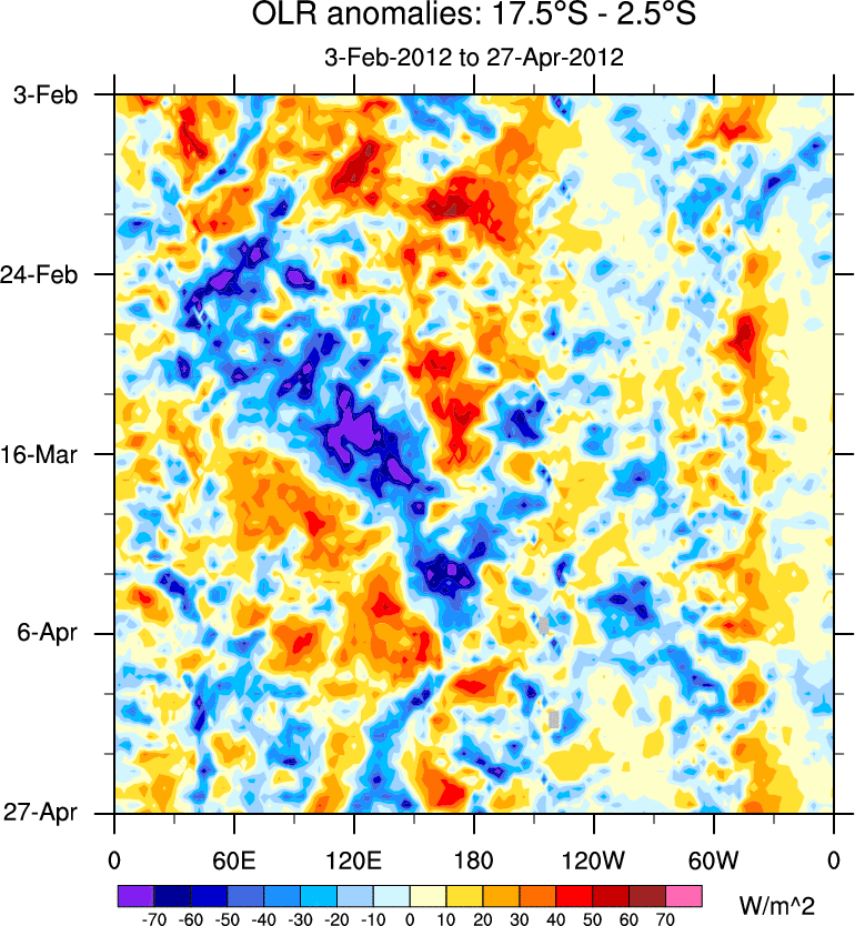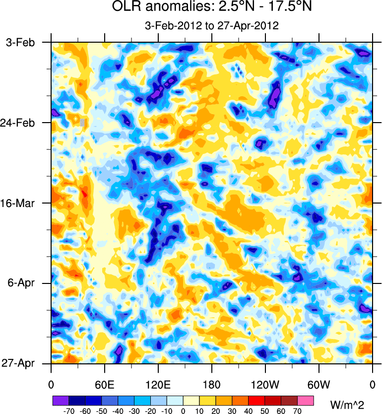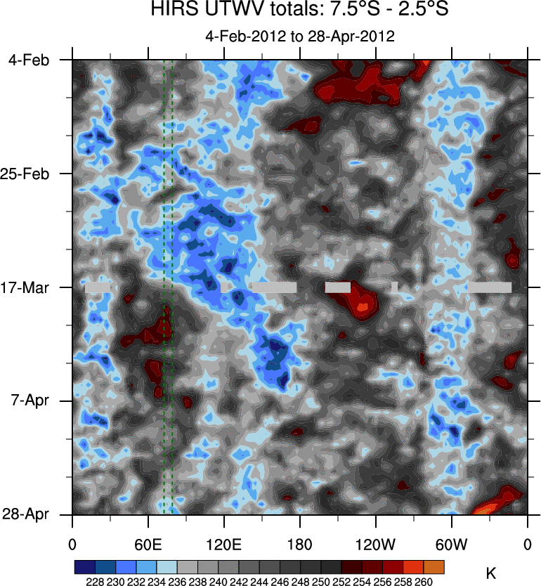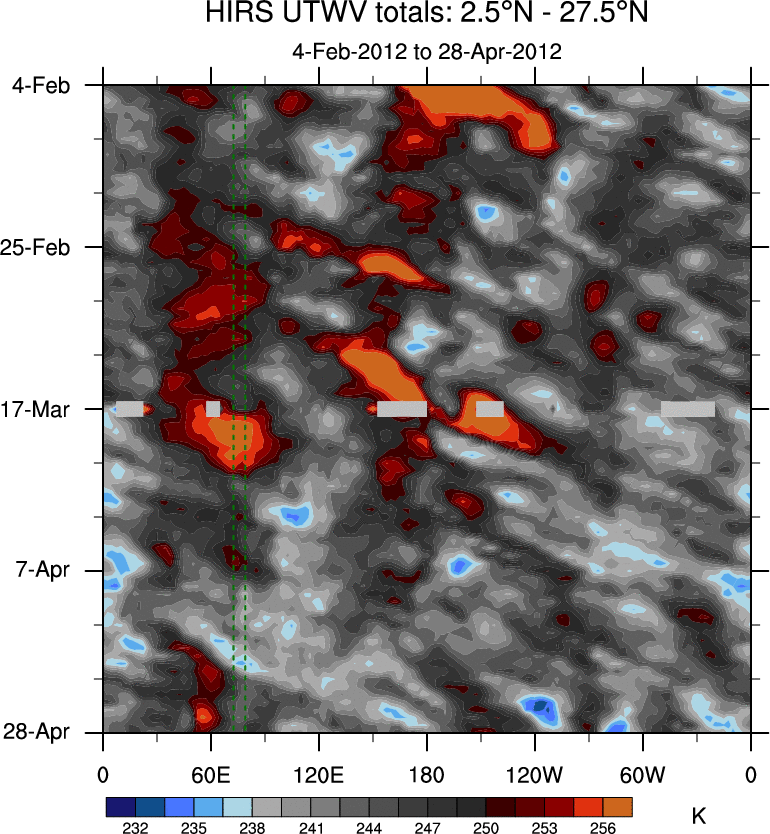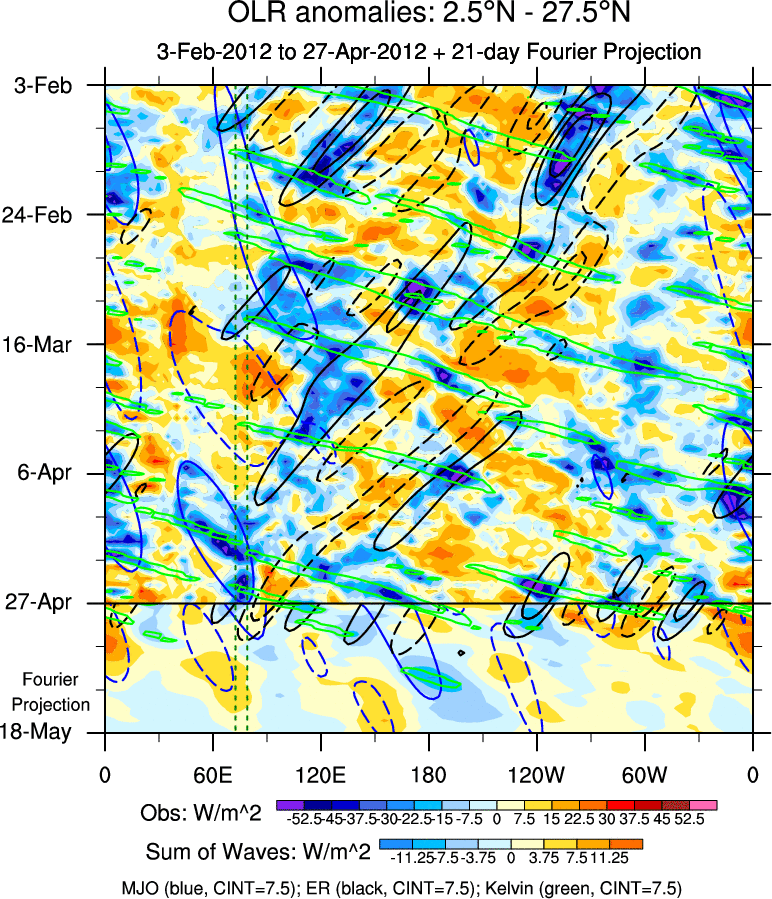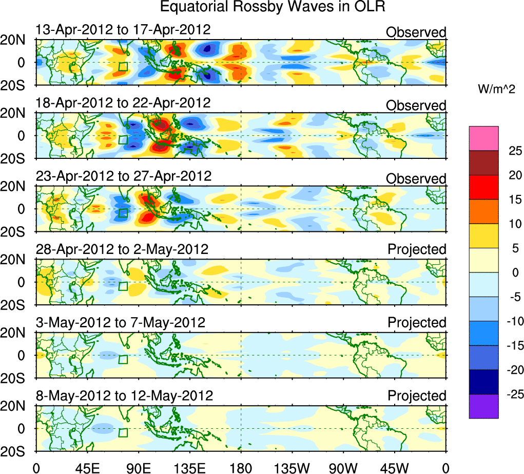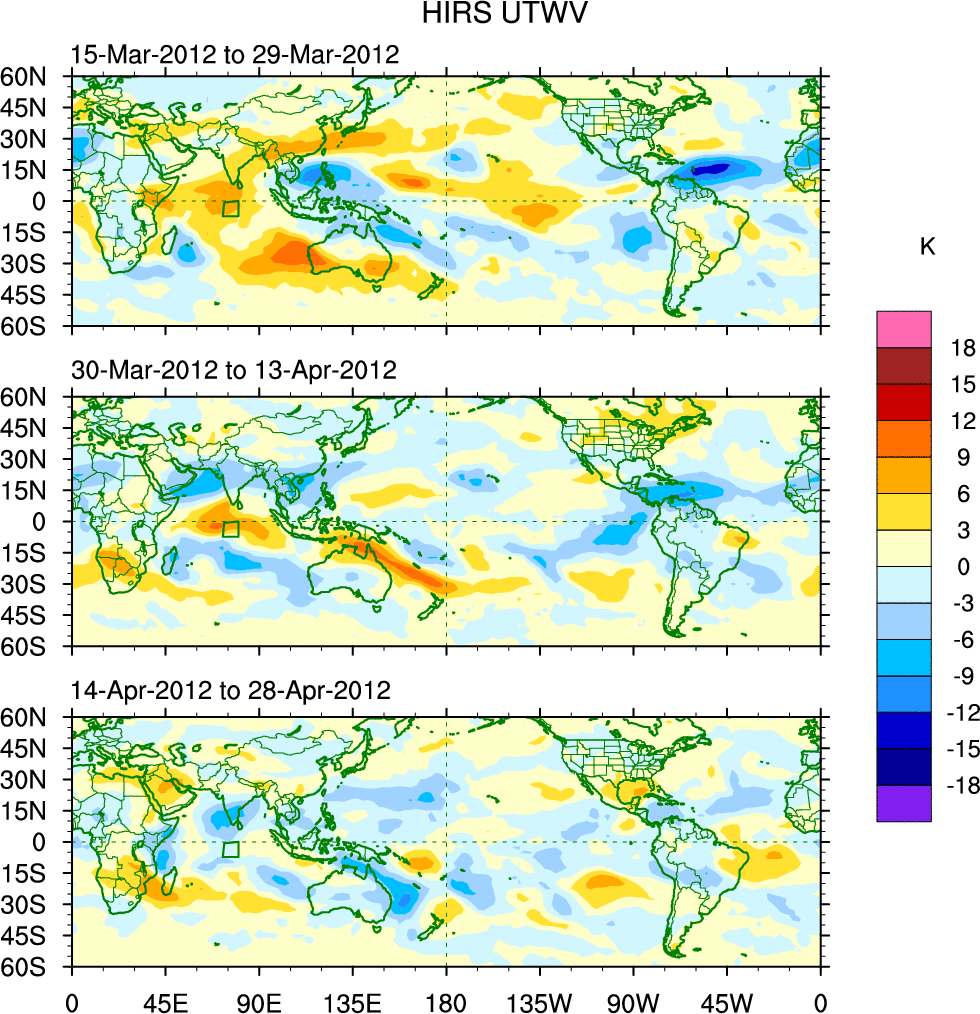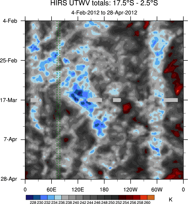 To identify tropical waves in near real-time, the OLR and UTWV data are filtered following Wheeler & Weickmann (2001 MWR). The daily anomalies are calculated using the first 3 harmonics of the seasonal cycle for 1979–2009. Missing values are then filled using linear interpolation in space and time. The most recent 365 days of anomalies are padded with 659 days of zeroes, and the result is filtered for each wave type.