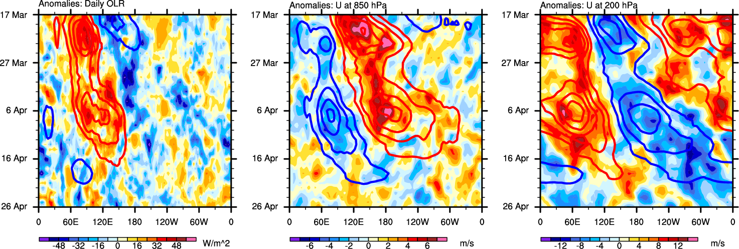 The Hovmollers show longitude-time plots for OLR, U-850, and U-200. The shading indicates the observed anomalies, while the contours are the projection of those anomalies onto the RMM EOFs.