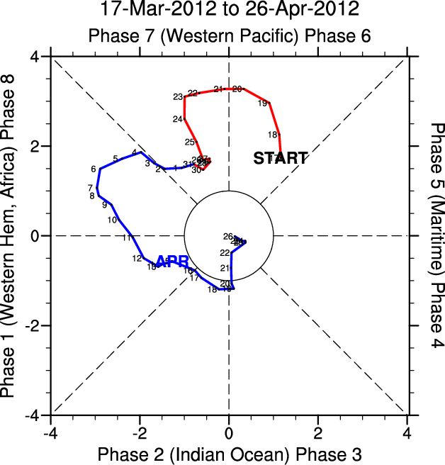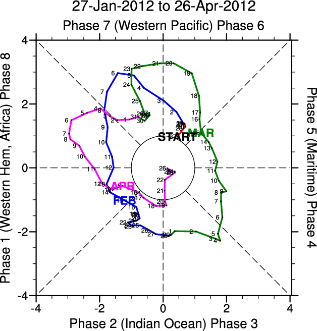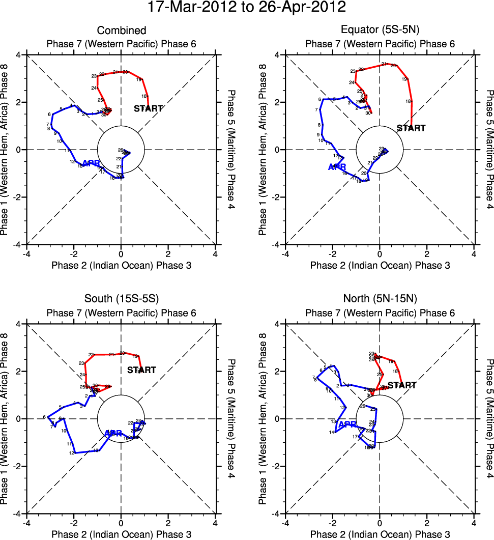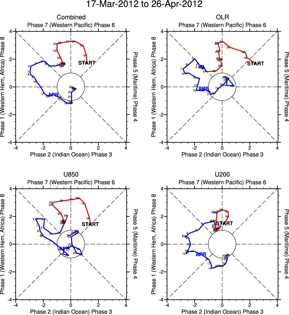 Wheeler and Hendon (2004) constructed the RMM index for monitoring the MJO. This index consists of the first two principal components (PCs) of OLR, 850-hPa zonal wind, and 200-hPa zonal wind averaged 15S-15N.