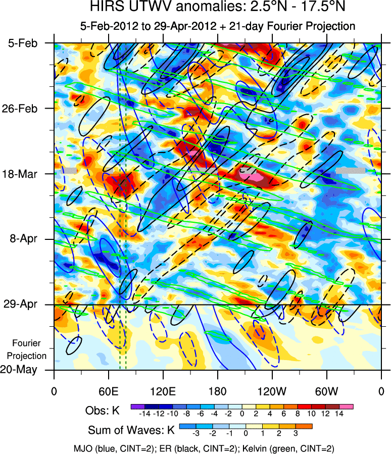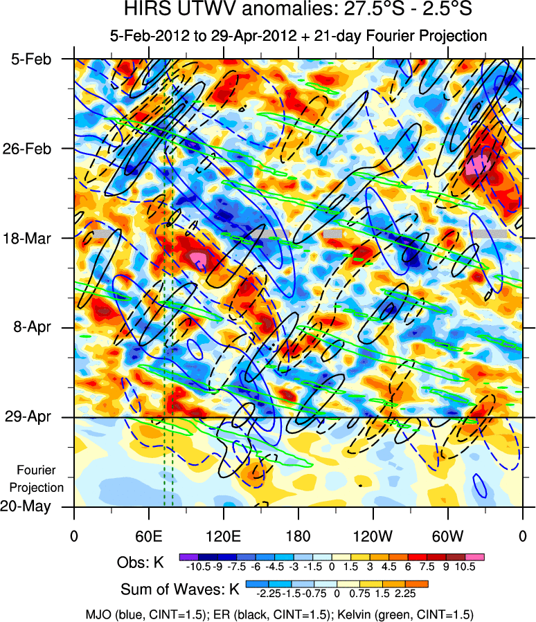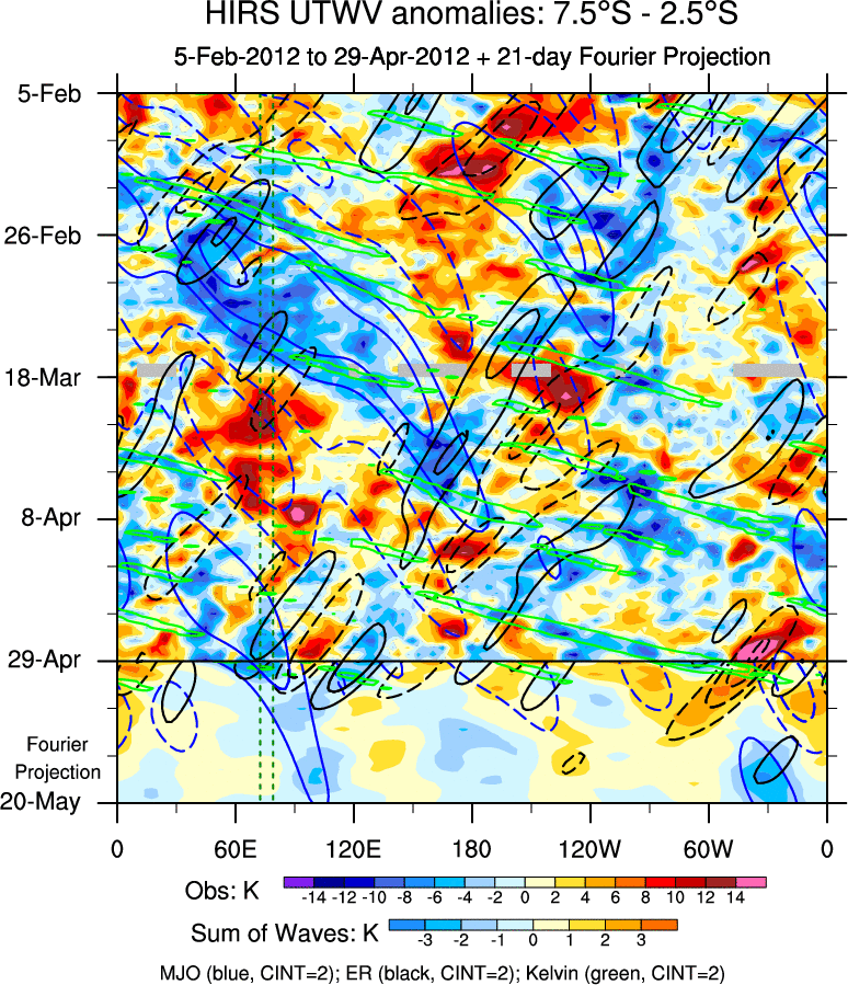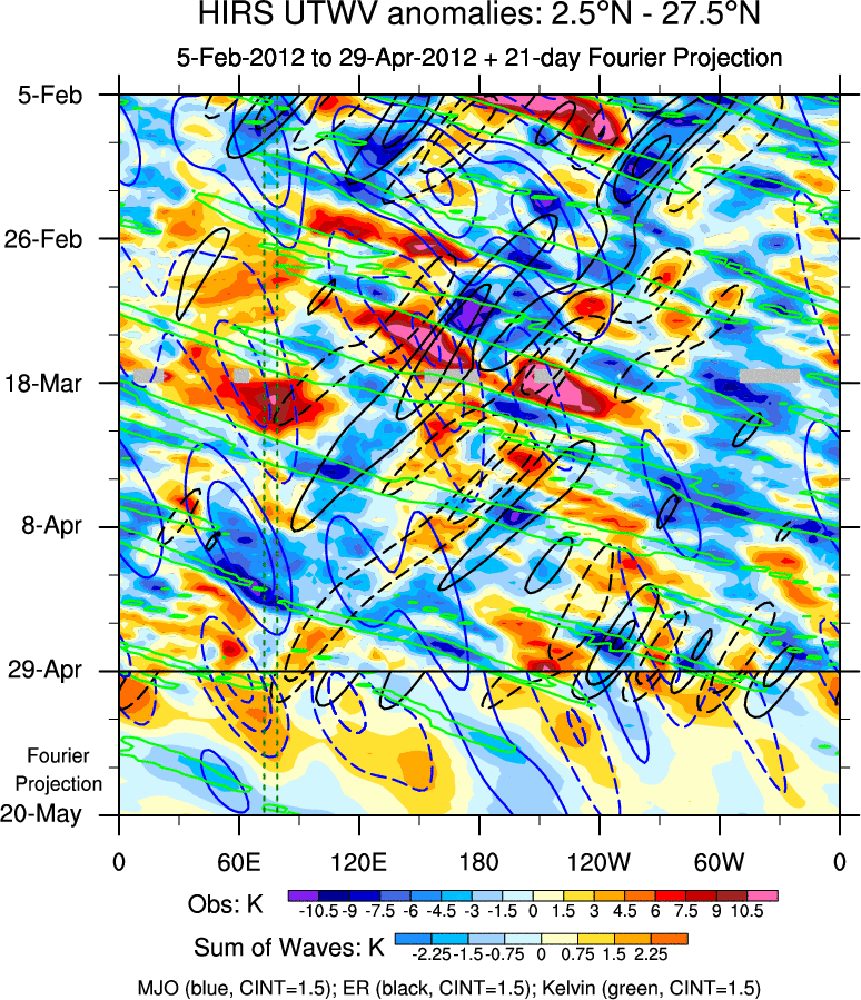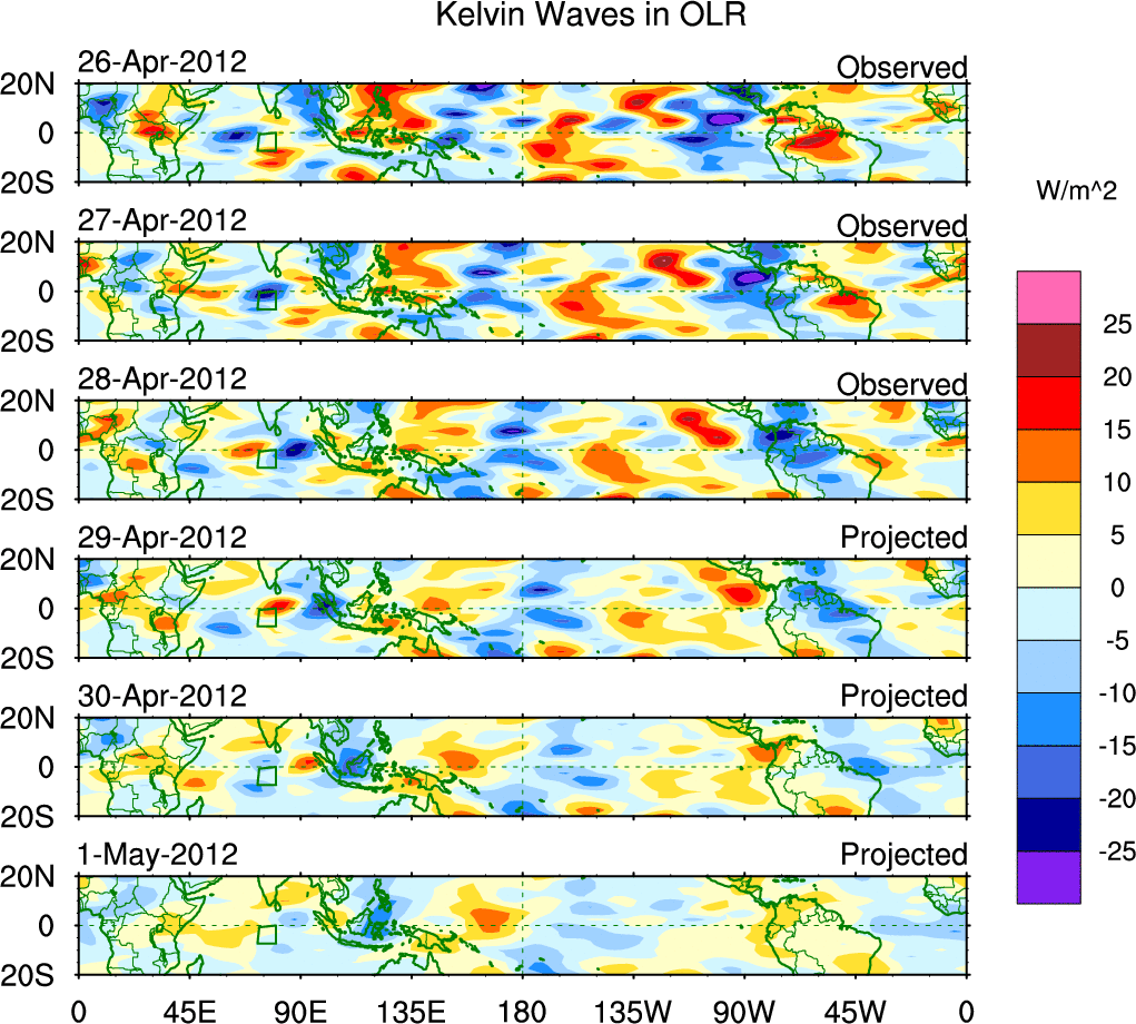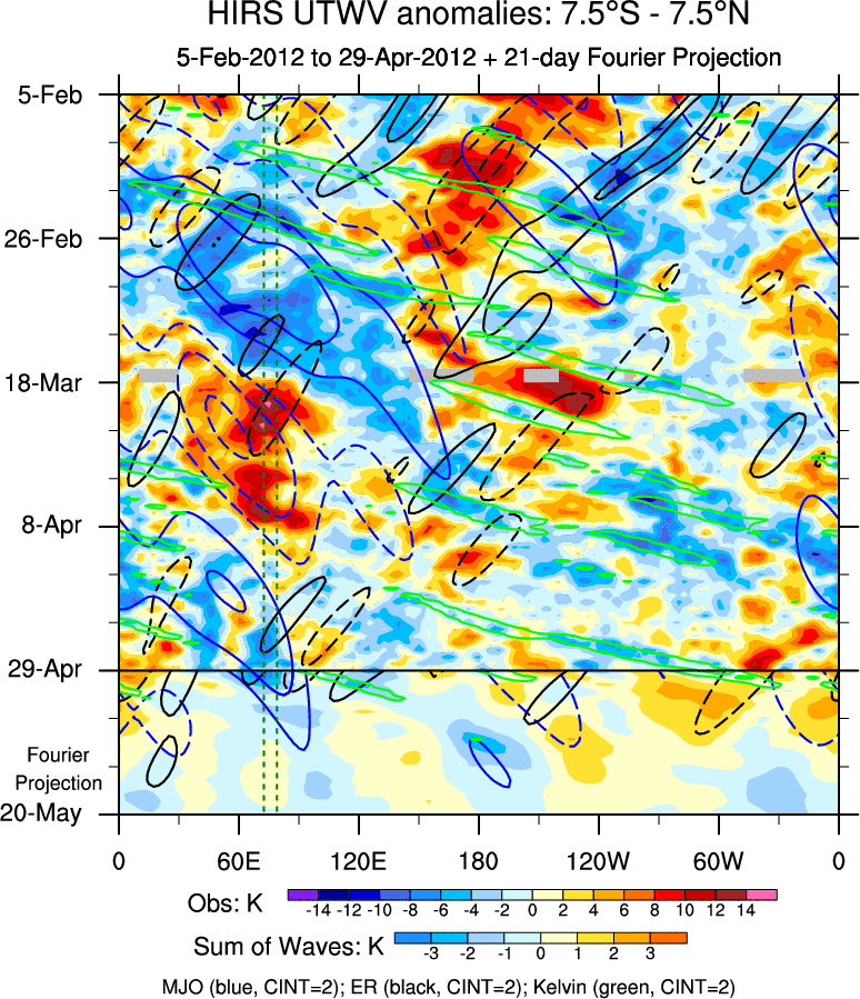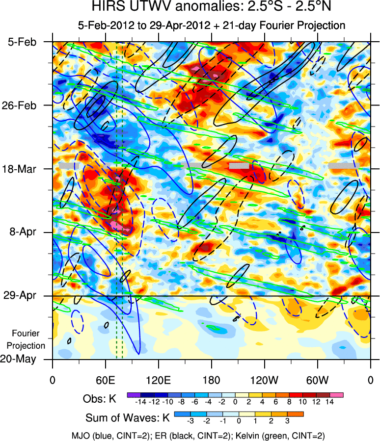 To identify tropical waves in near real-time, the OLR and UTWV data are filtered following Wheeler & Weickmann (2001 MWR). The daily anomalies are calculated using the first 3 harmonics of the seasonal cycle for 1979–2009. Missing values are then filled using linear interpolation in space and time. The most recent 365 days of anomalies are padded with 659 days of zeroes, and the result is filtered for each wave type.