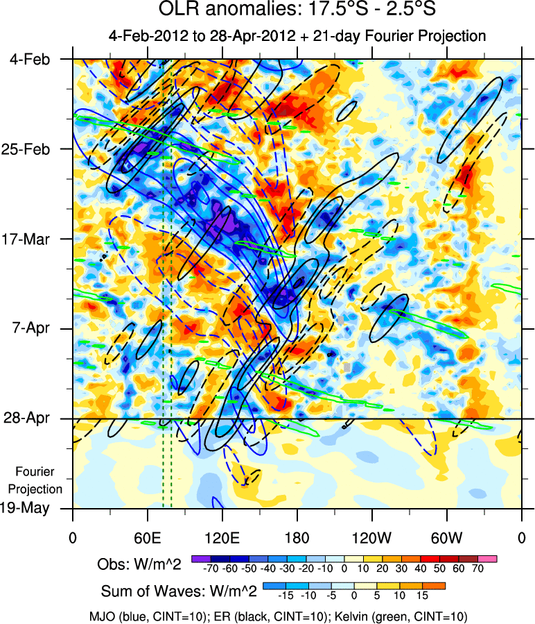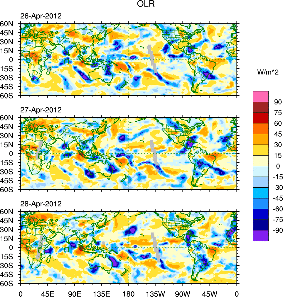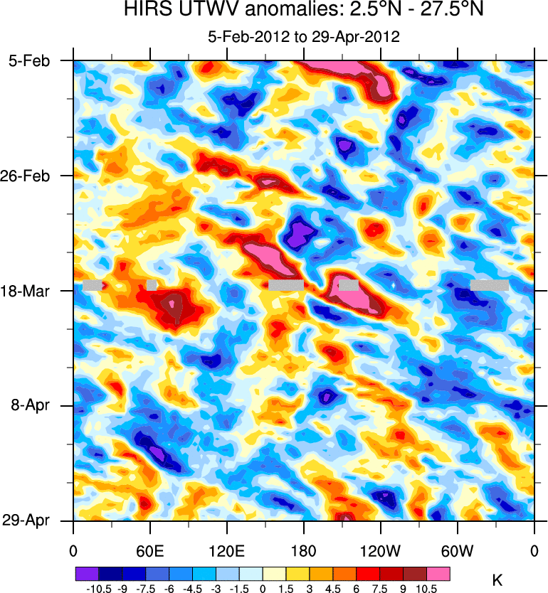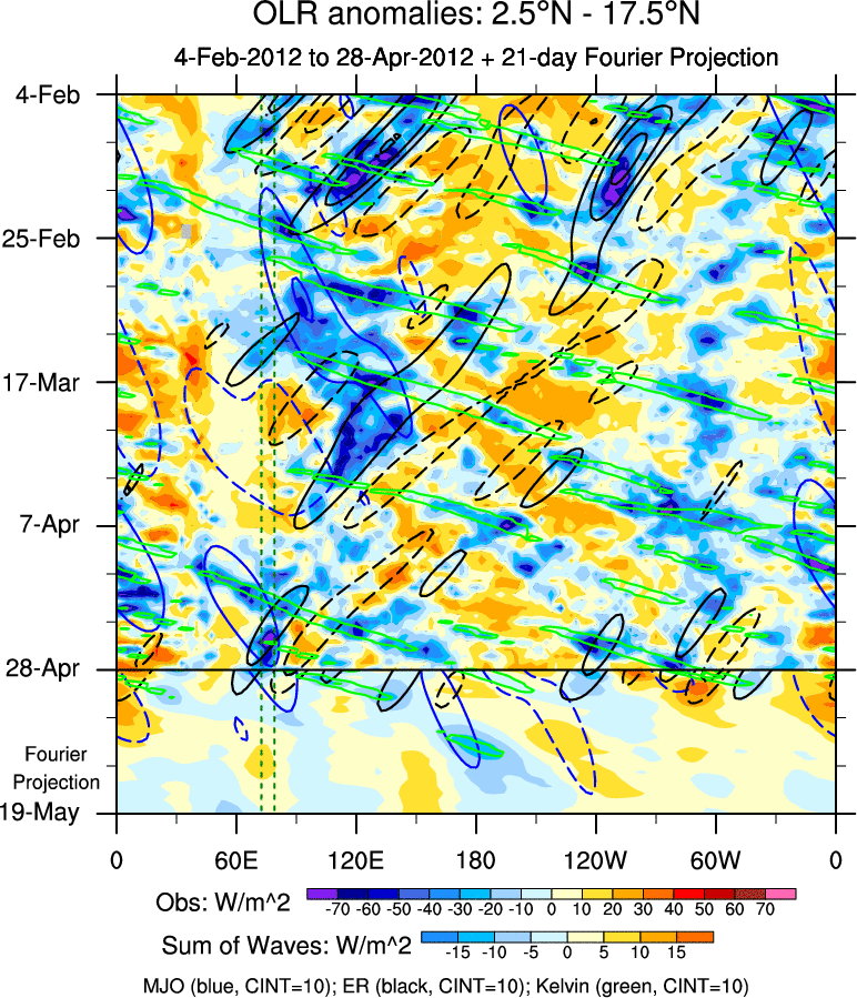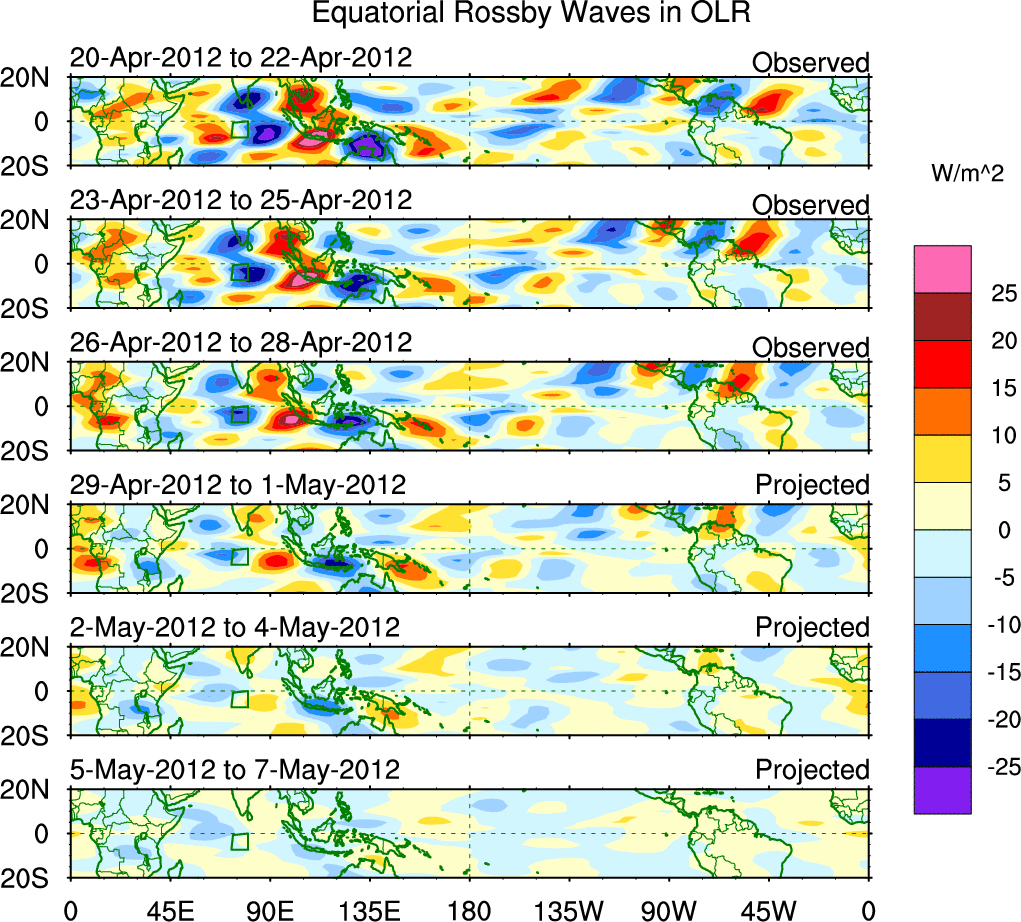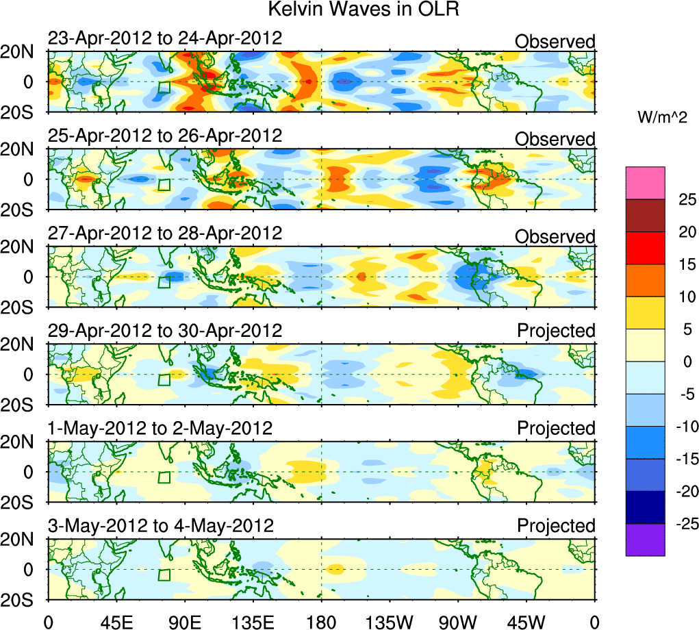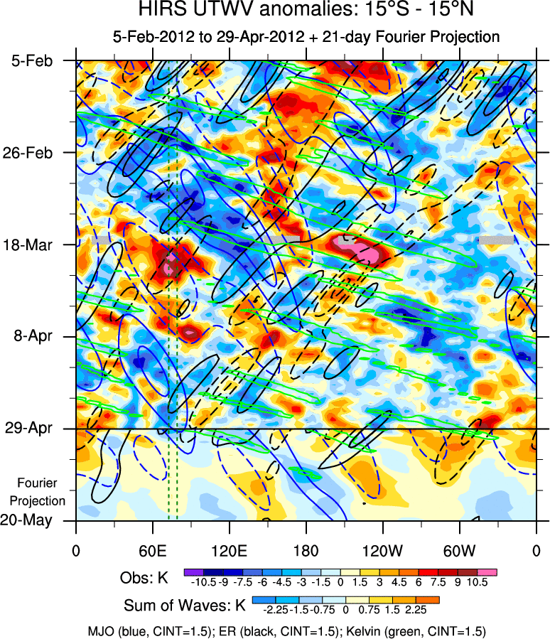 To identify tropical waves in near real-time, the OLR and UTWV data are filtered following Wheeler & Weickmann (2001 MWR). The daily anomalies are calculated using the first 3 harmonics of the seasonal cycle for 1979–2009. Missing values are then filled using linear interpolation in space and time. The most recent 365 days of anomalies are padded with 659 days of zeroes, and the result is filtered for each wave type.