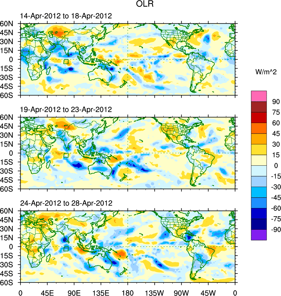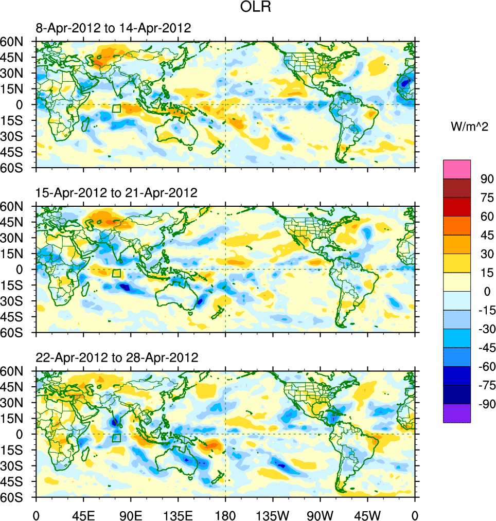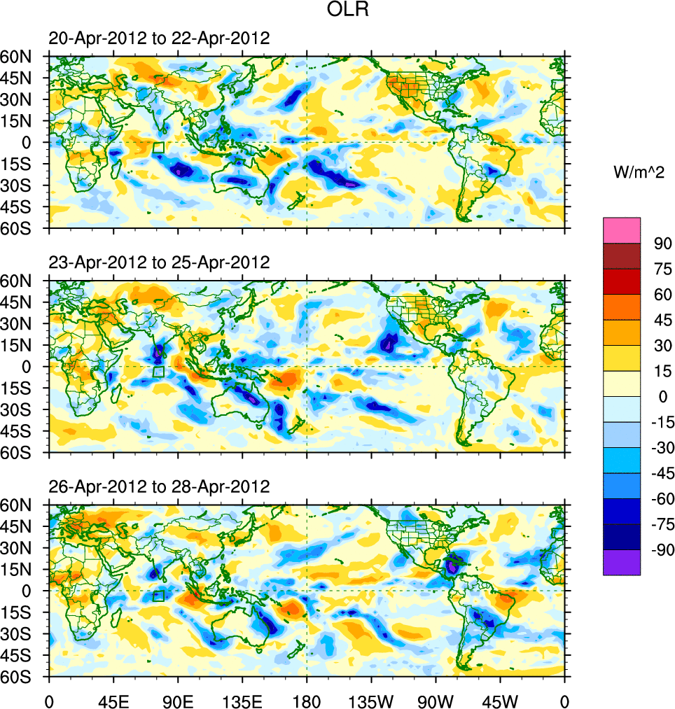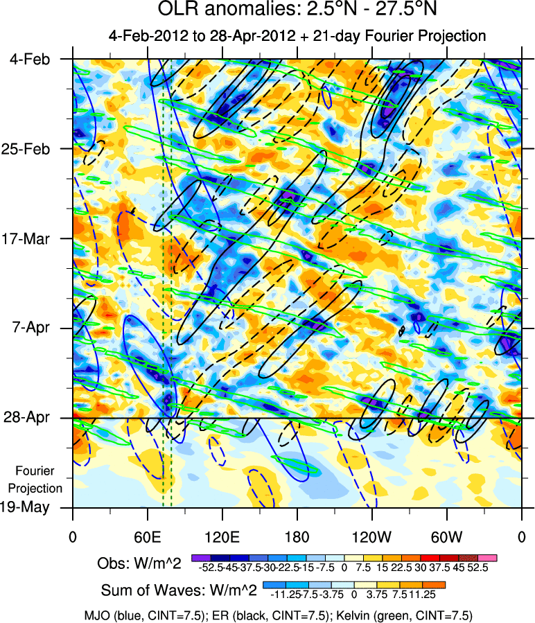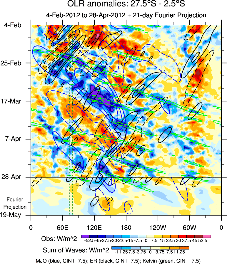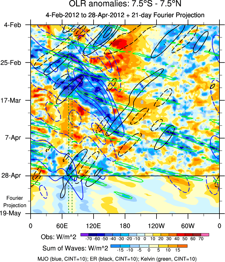To identify tropical waves in near real-time, the OLR and UTWV data are filtered following Wheeler & Weickmann (2001 MWR). The daily anomalies are calculated using the first 3 harmonics of the seasonal cycle for 1979–2009. Missing values are then filled using linear interpolation in space and time. The most recent 365 days of anomalies are padded with 659 days of zeroes, and the result is filtered for each wave type.