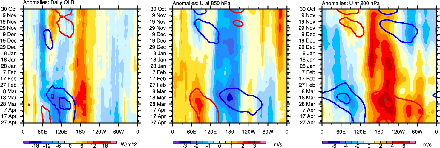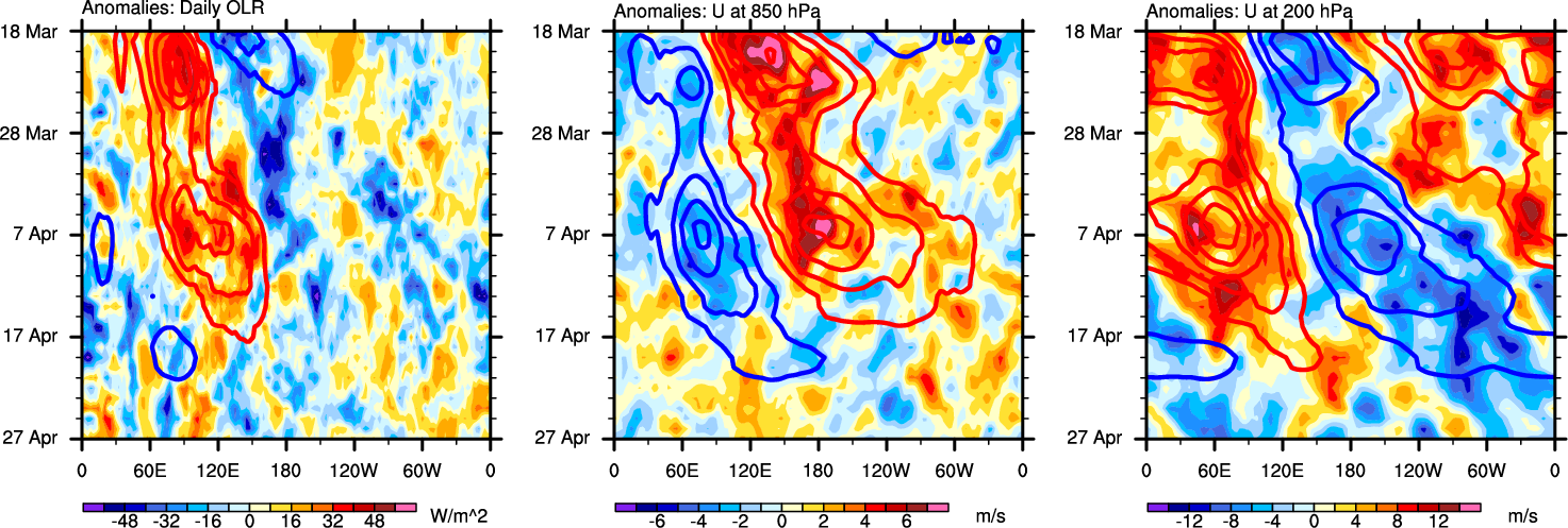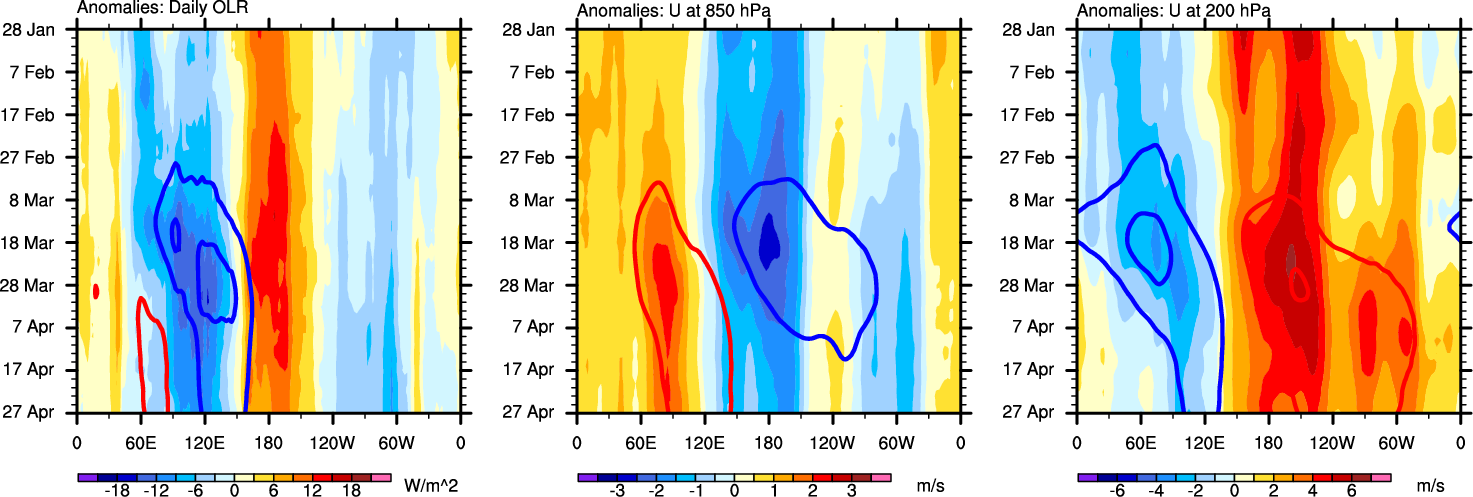 The Hovmollers show longitude-time plots for OLR, U-850, and U-200. The shading indicates the observed anomalies, while the contours are the projection of those anomalies onto the RMM EOFs.