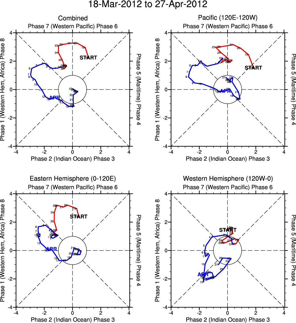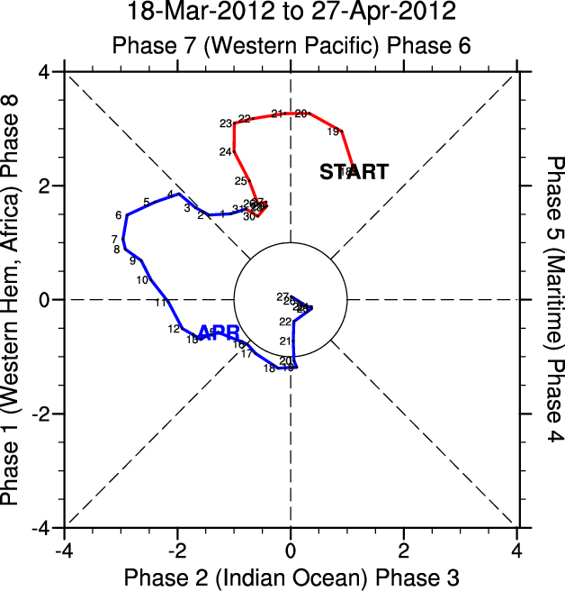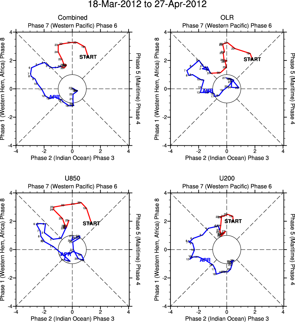 Wheeler and Hendon (2004) constructed the RMM index for monitoring the MJO. This index consists of the first two principal components (PCs) of OLR, 850-hPa zonal wind, and 200-hPa zonal wind averaged 15S-15N.