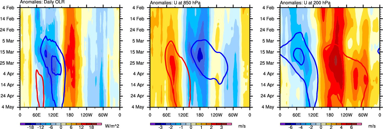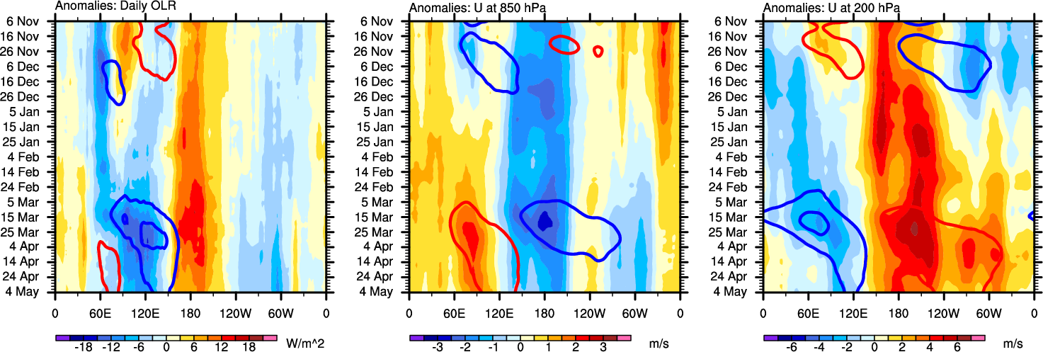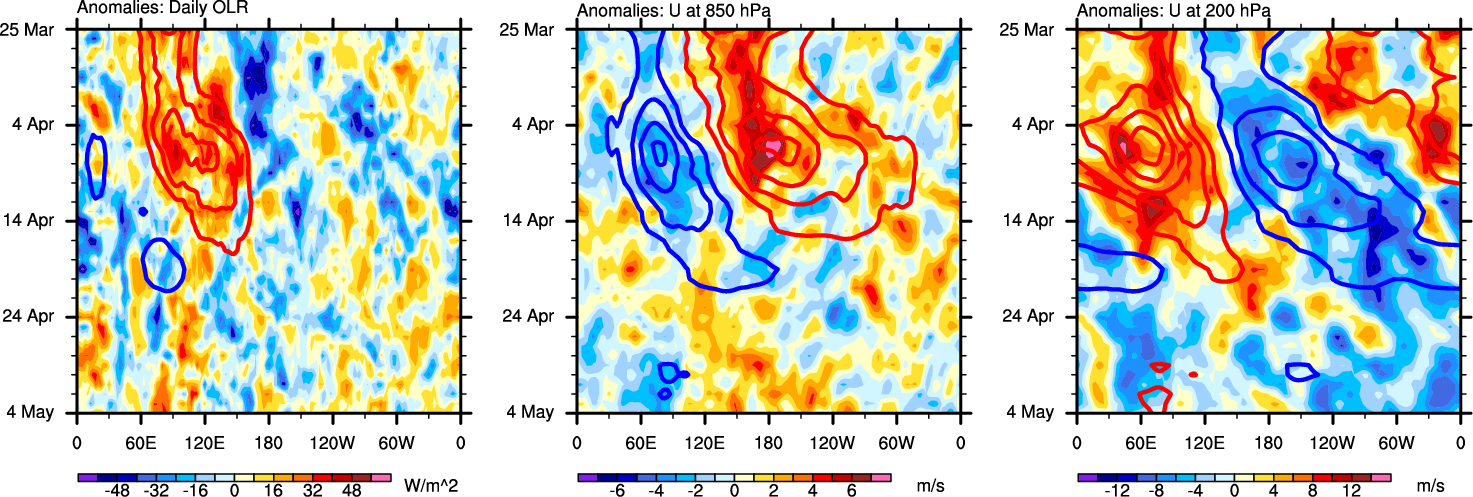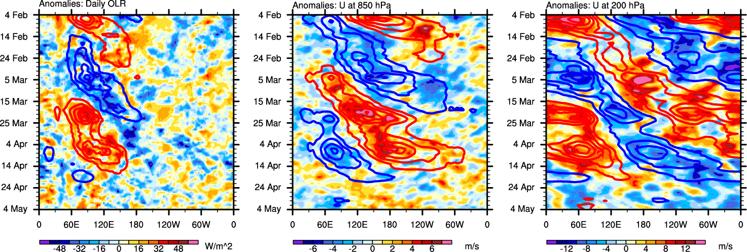 The Hovmollers show longitude-time plots for OLR, U-850, and U-200. The shading indicates the observed anomalies, while the contours are the projection of those anomalies onto the RMM EOFs.