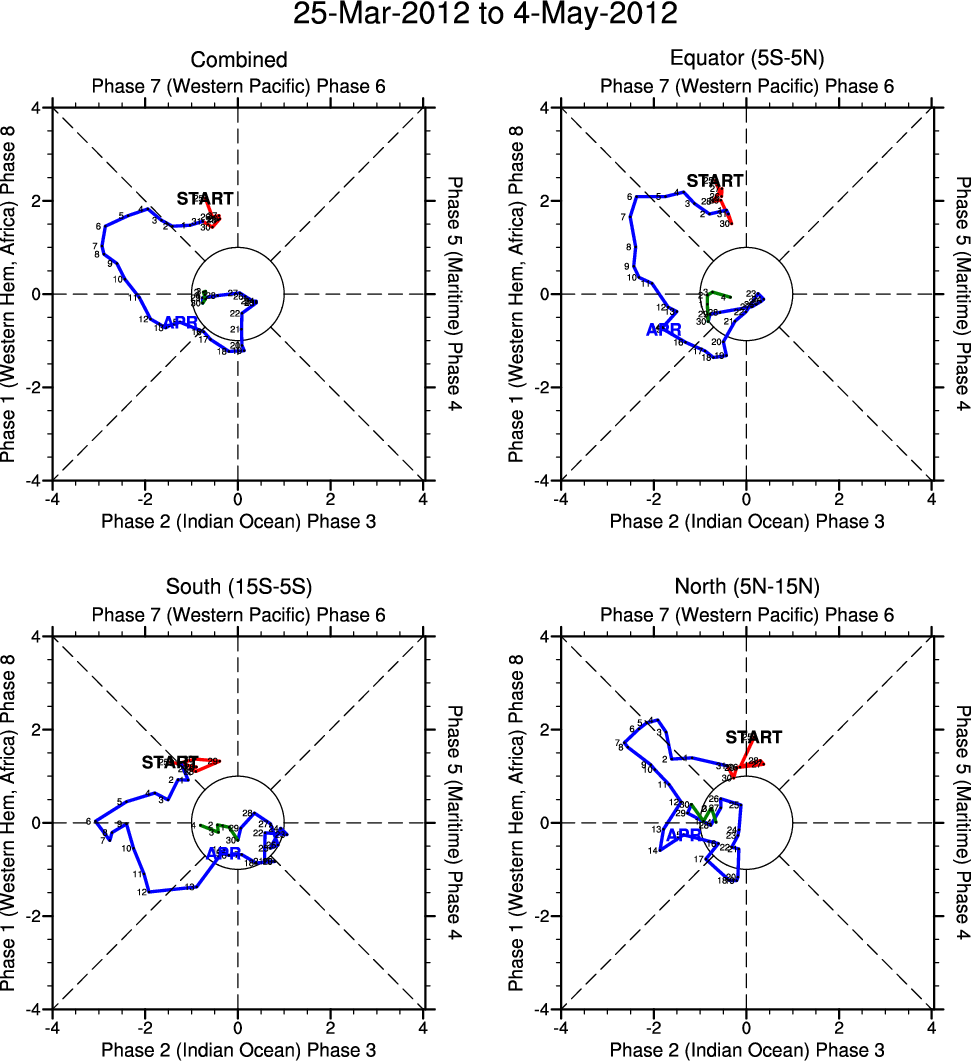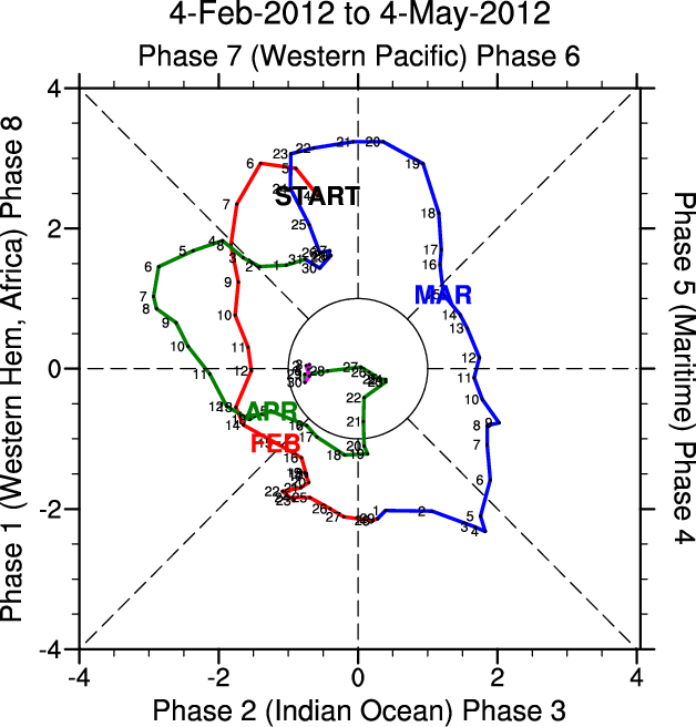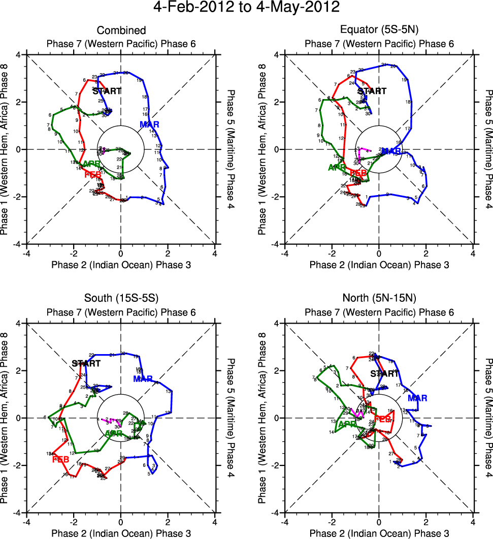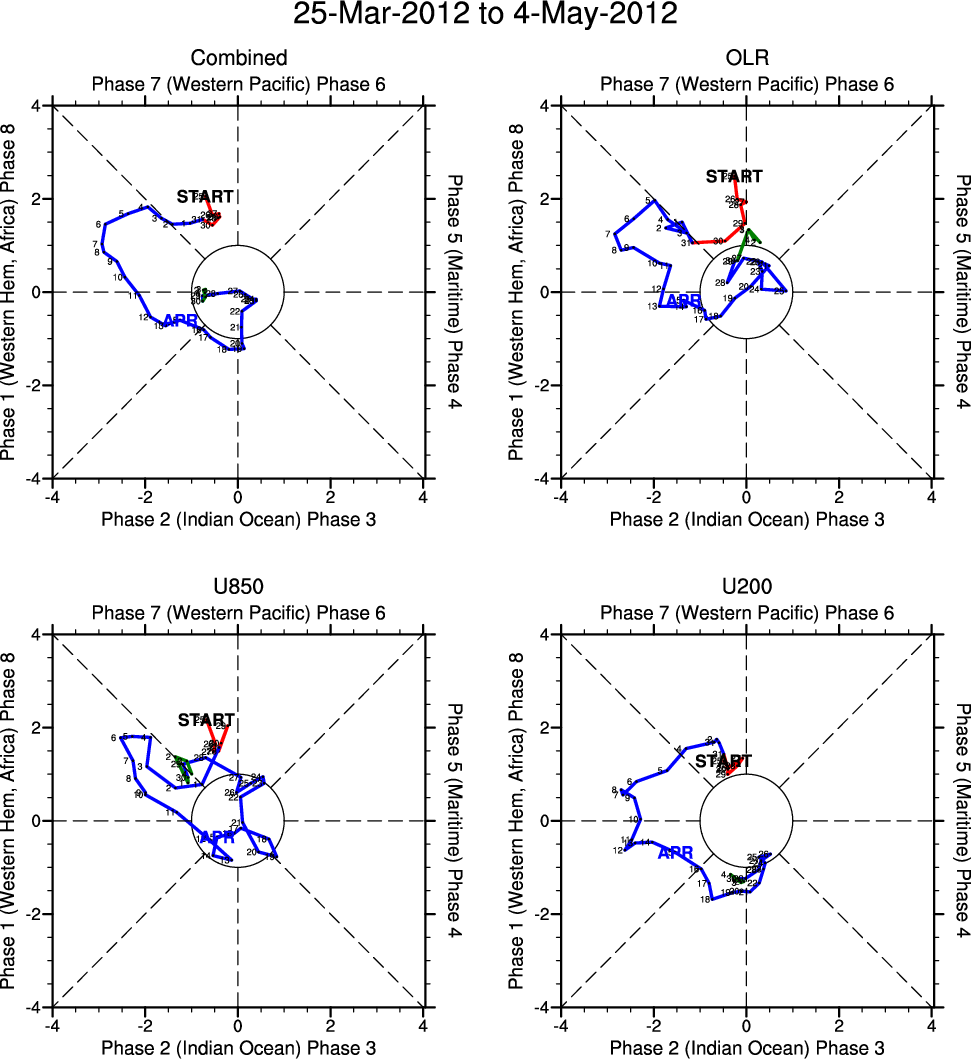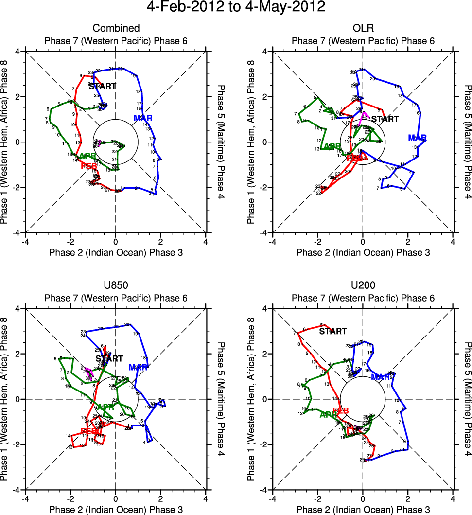 Wheeler and Hendon (2004) constructed the RMM index for monitoring the MJO. This index consists of the first two principal components (PCs) of OLR, 850-hPa zonal wind, and 200-hPa zonal wind averaged 15S-15N.