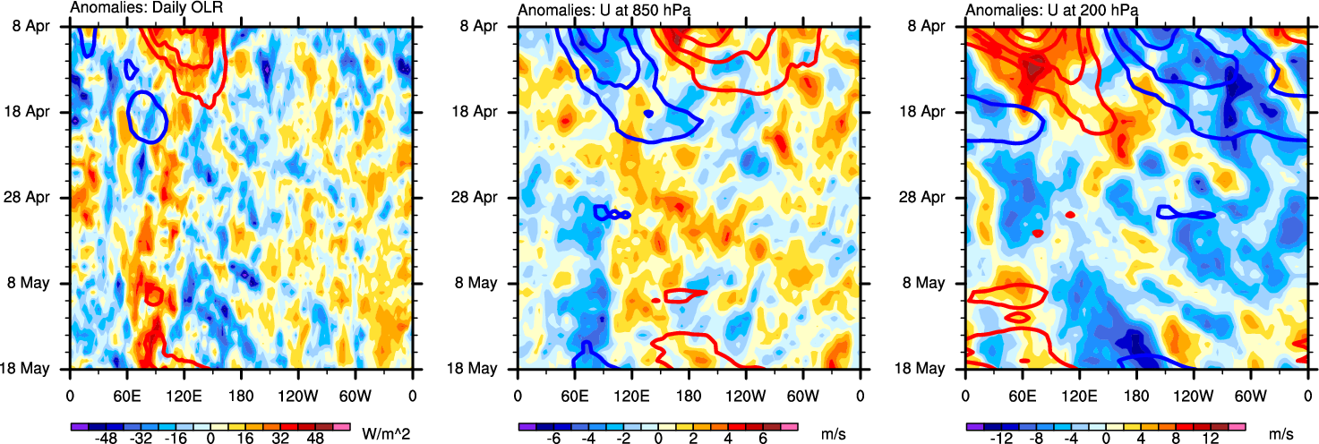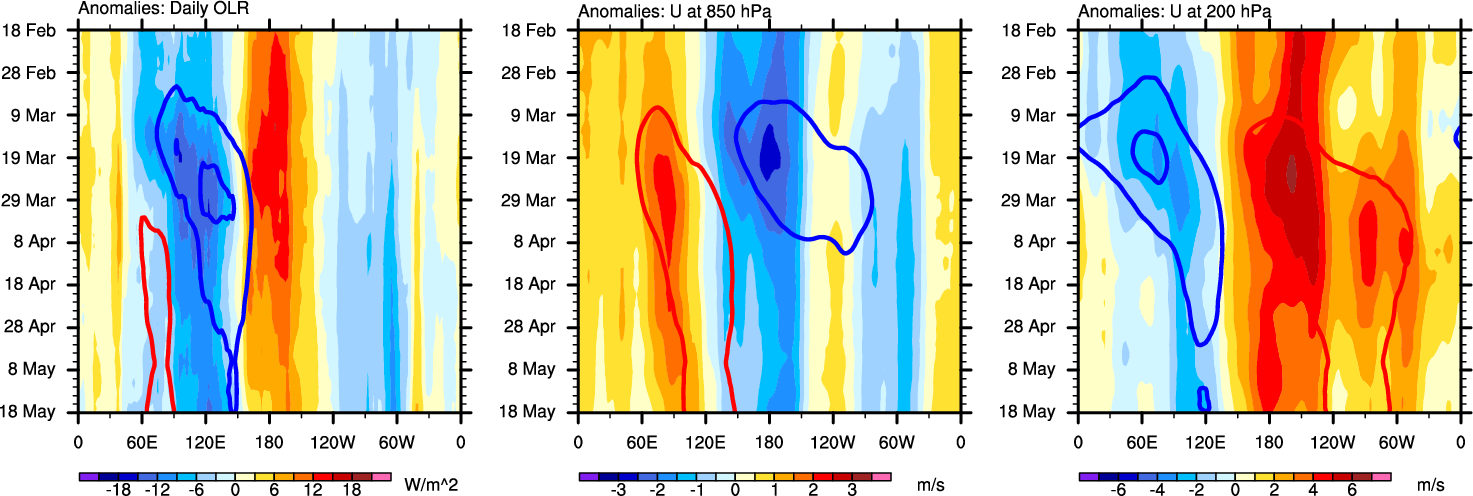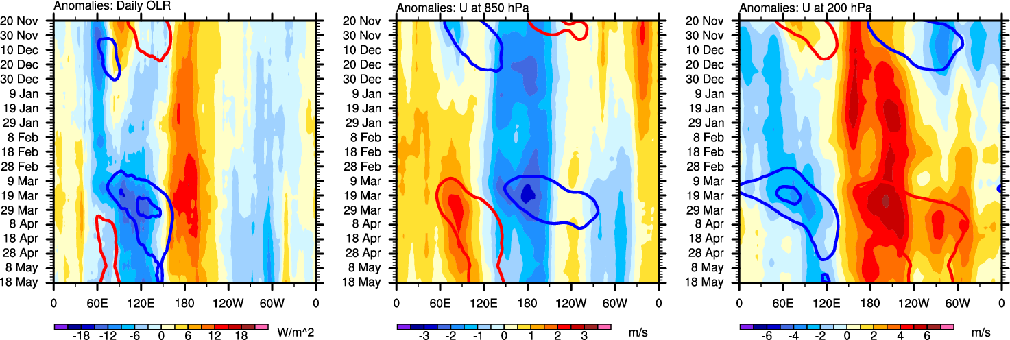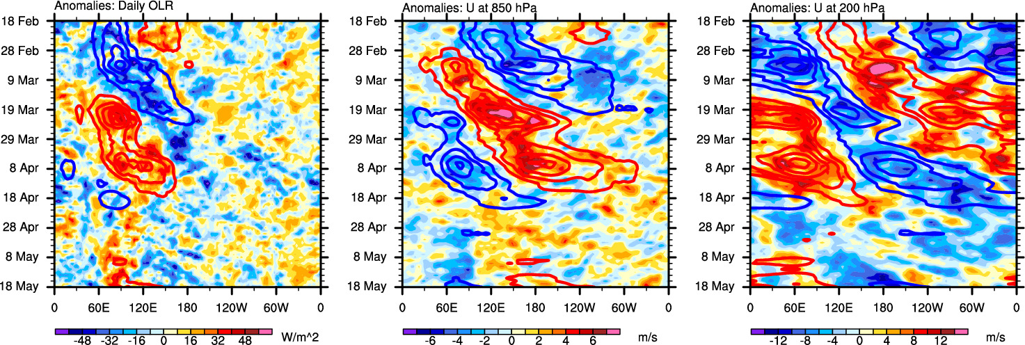 The Hovmollers show longitude-time plots for OLR, U-850, and U-200. The shading indicates the observed anomalies, while the contours are the projection of those anomalies onto the RMM EOFs.