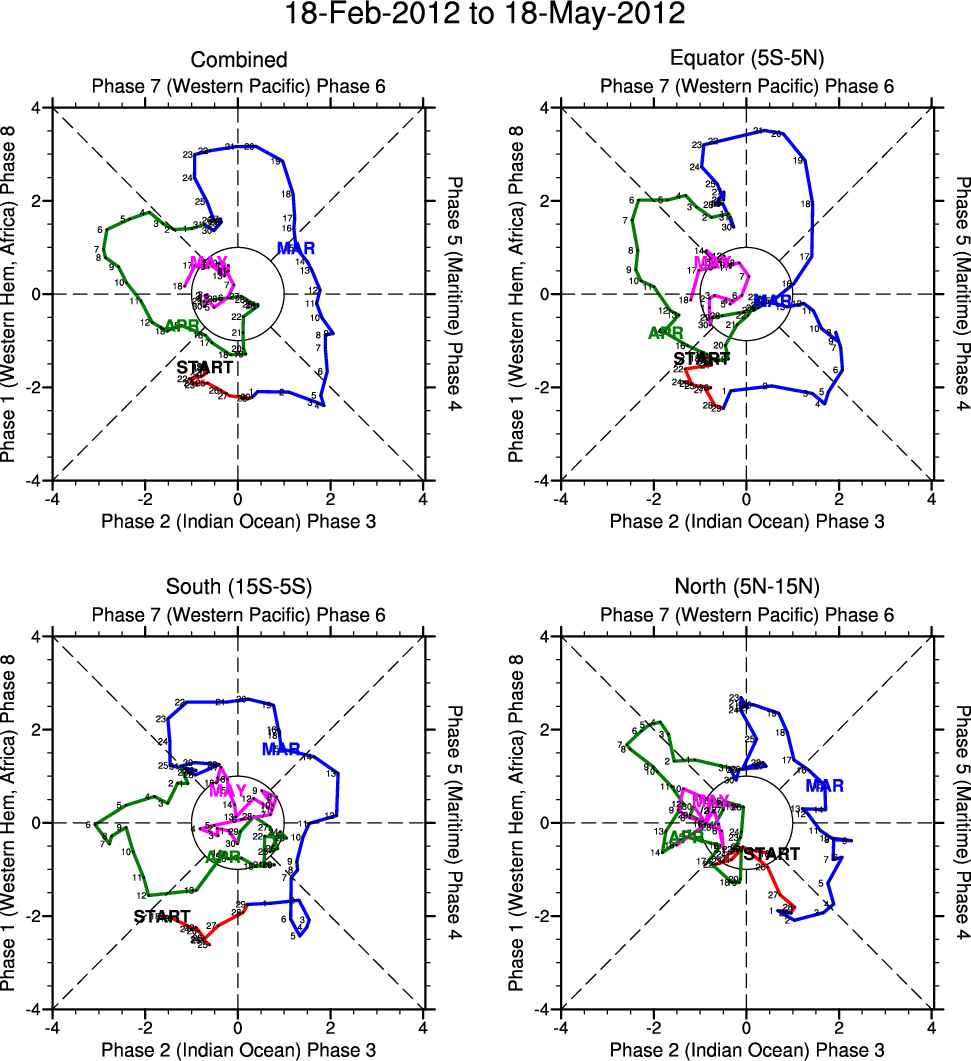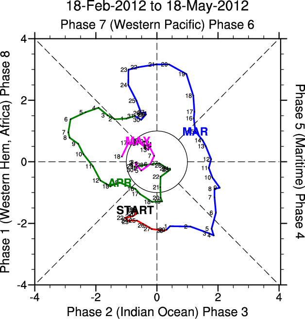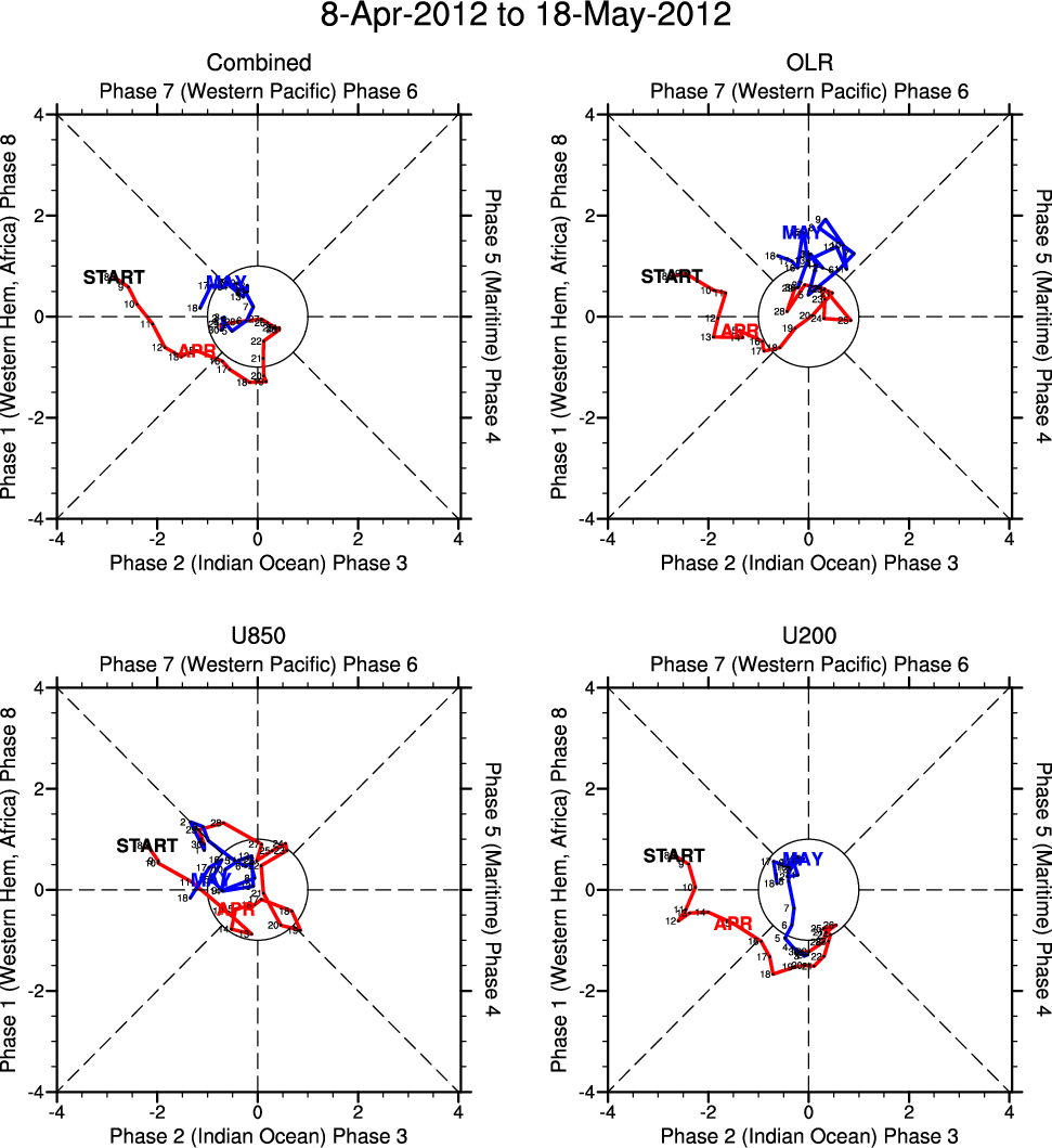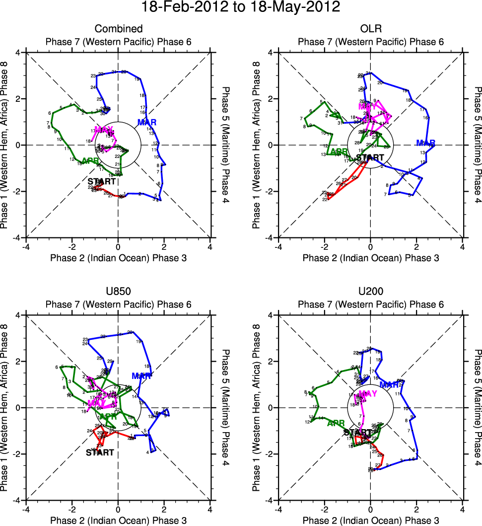 Wheeler and Hendon (2004) constructed the RMM index for monitoring the MJO. This index consists of the first two principal components (PCs) of OLR, 850-hPa zonal wind, and 200-hPa zonal wind averaged 15S-15N.