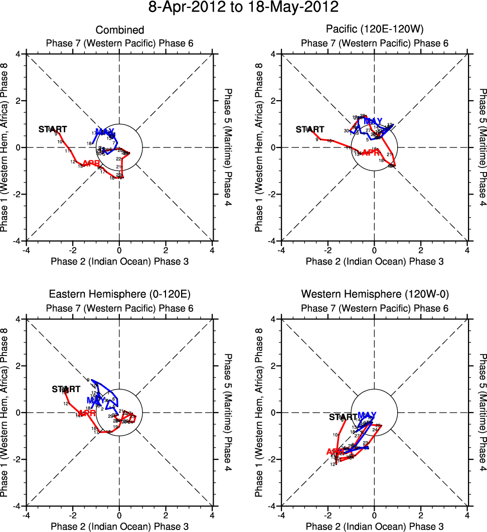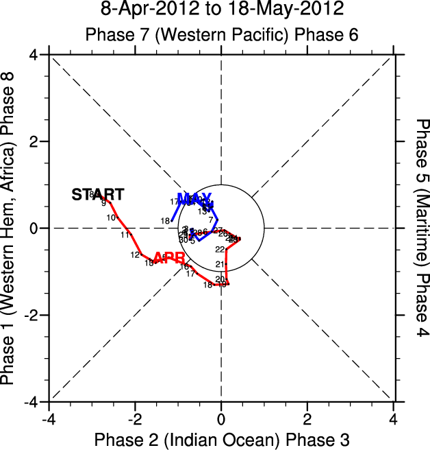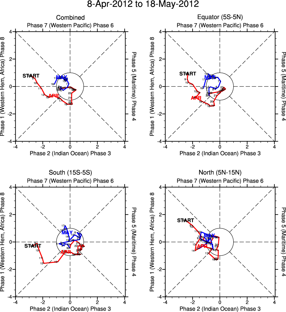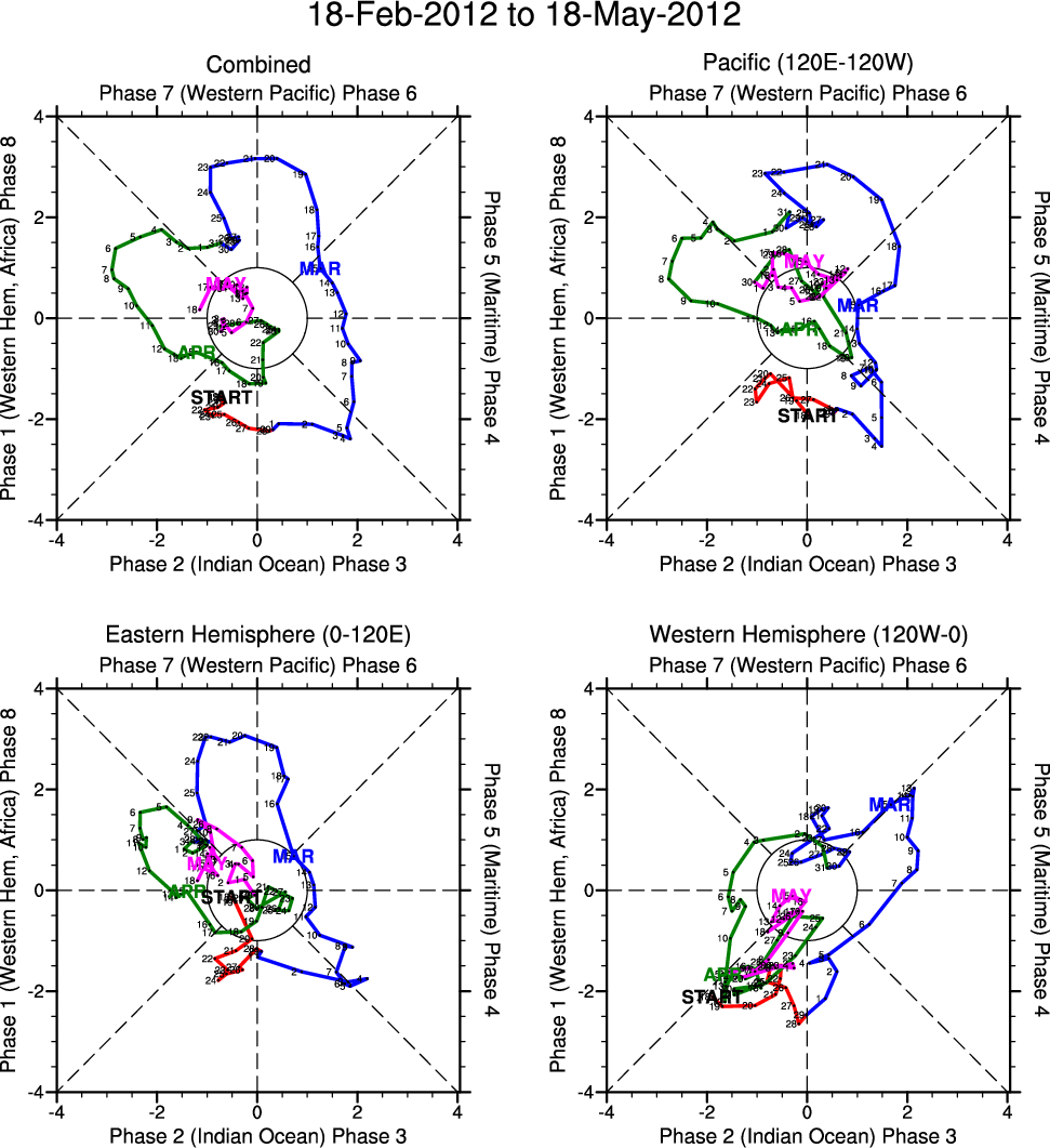 Wheeler and Hendon (2004) constructed the RMM index for monitoring the MJO. This index consists of the first two principal components (PCs) of OLR, 850-hPa zonal wind, and 200-hPa zonal wind averaged 15S-15N.