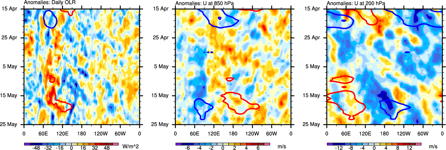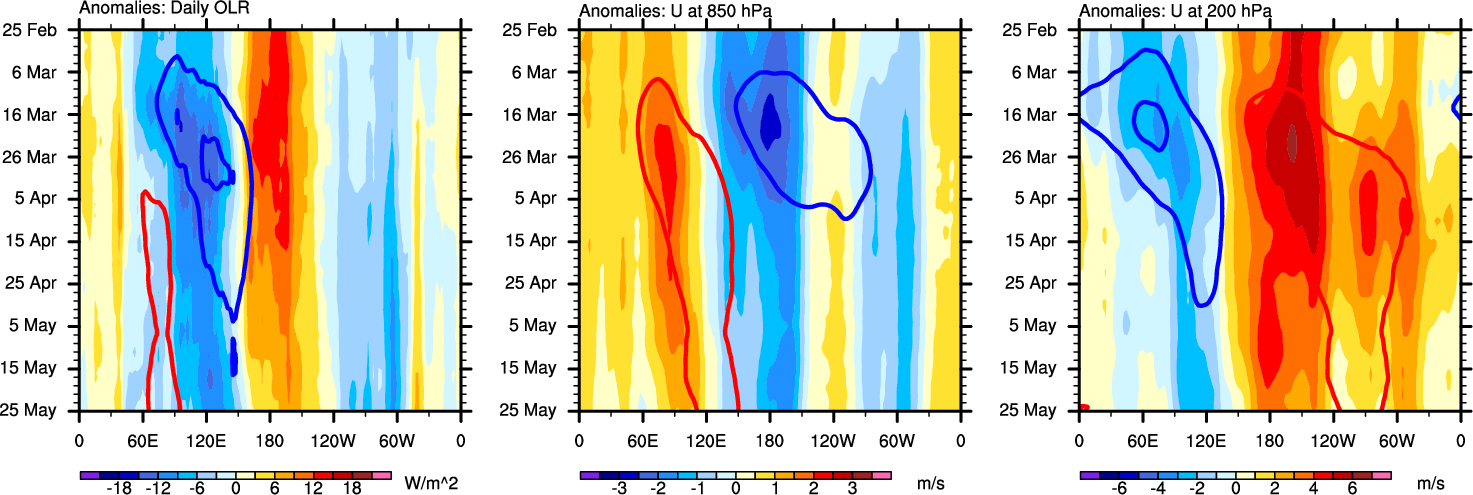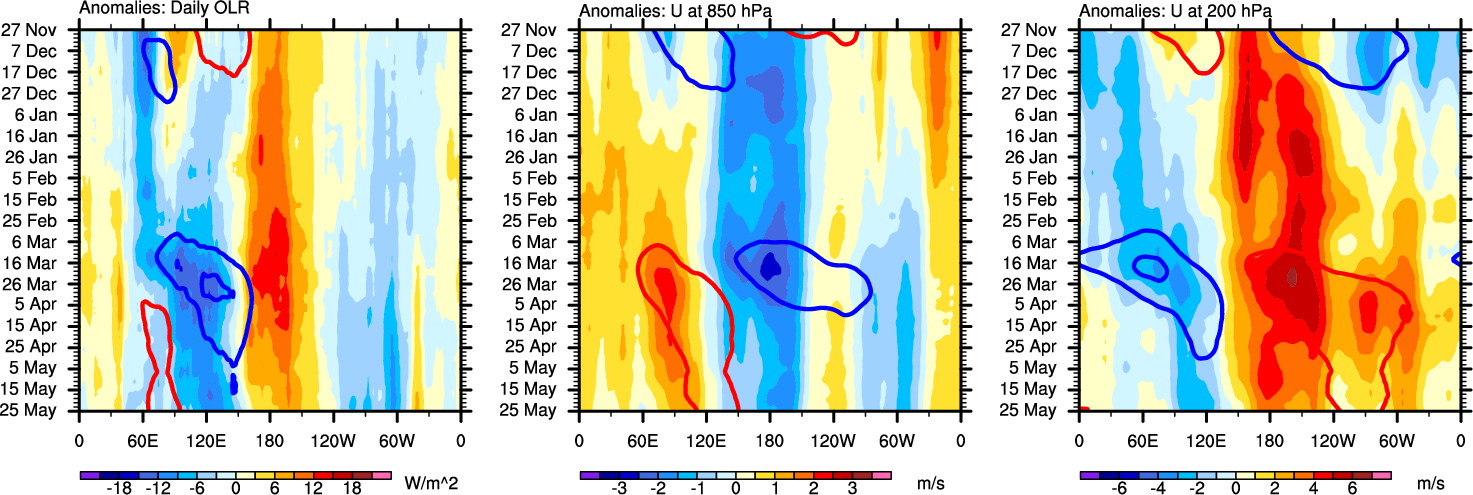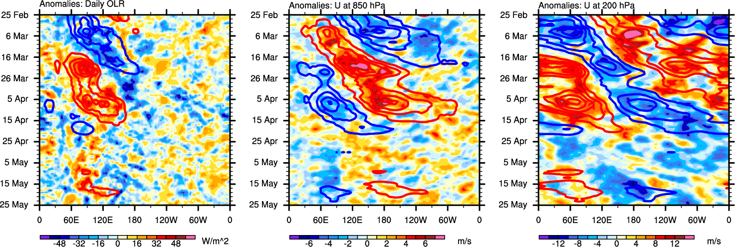 The Hovmollers show longitude-time plots for OLR, U-850, and U-200. The shading indicates the observed anomalies, while the contours are the projection of those anomalies onto the RMM EOFs.
