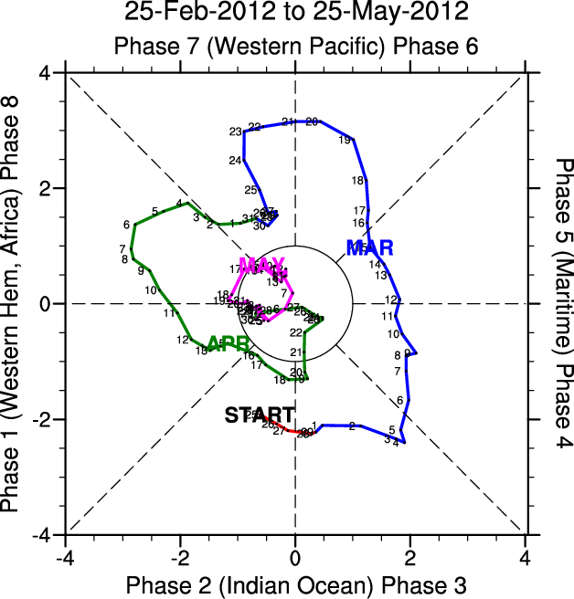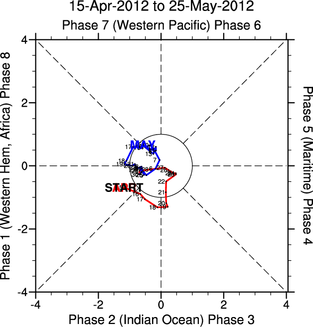Wheeler and Hendon (2004) constructed the RMM index for monitoring the MJO. This index consists of the first two principal components (PCs) of OLR, 850-hPa zonal wind, and 200-hPa zonal wind averaged 15S-15N.