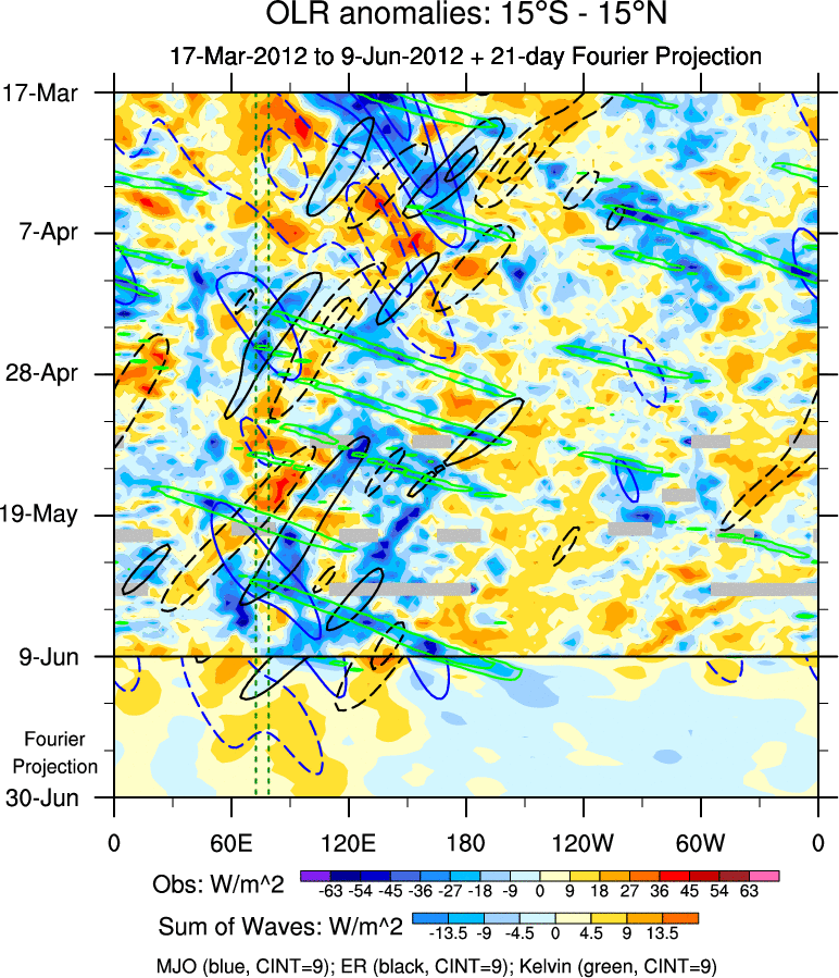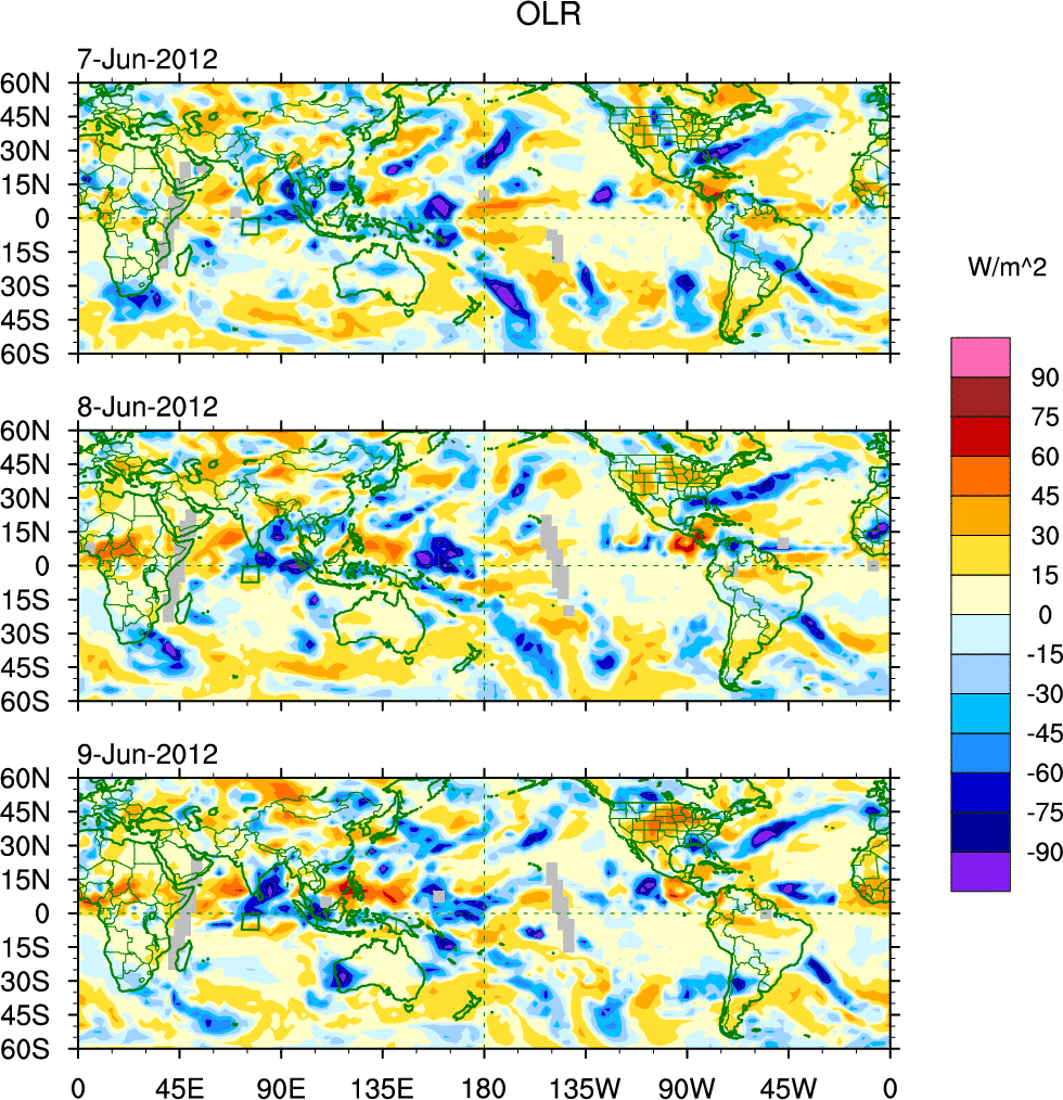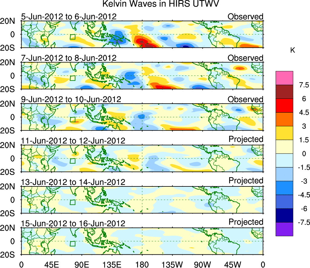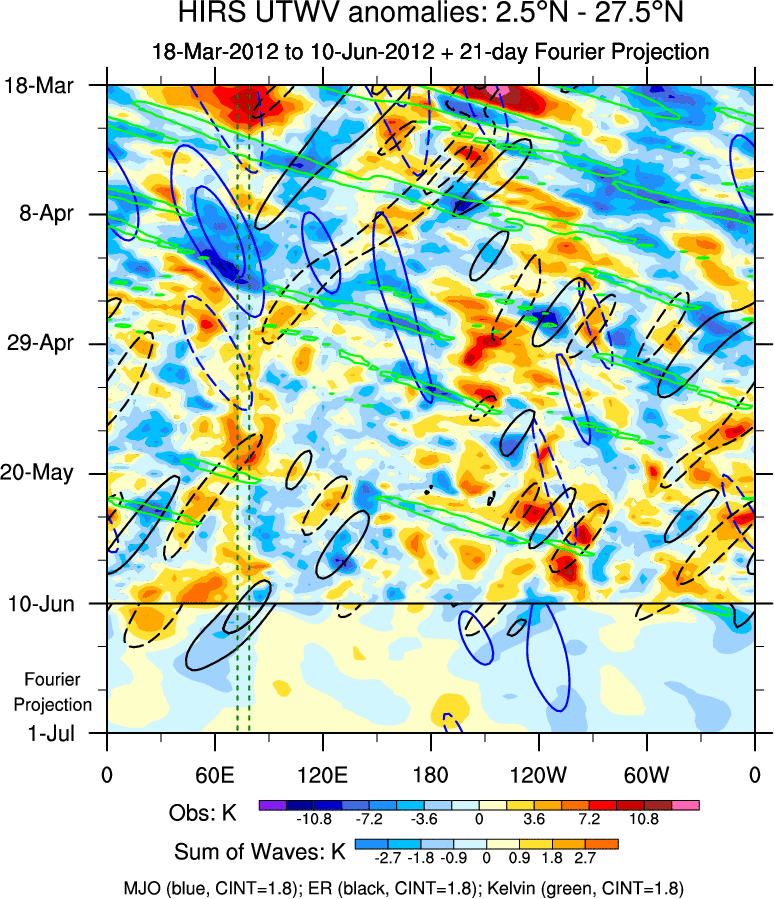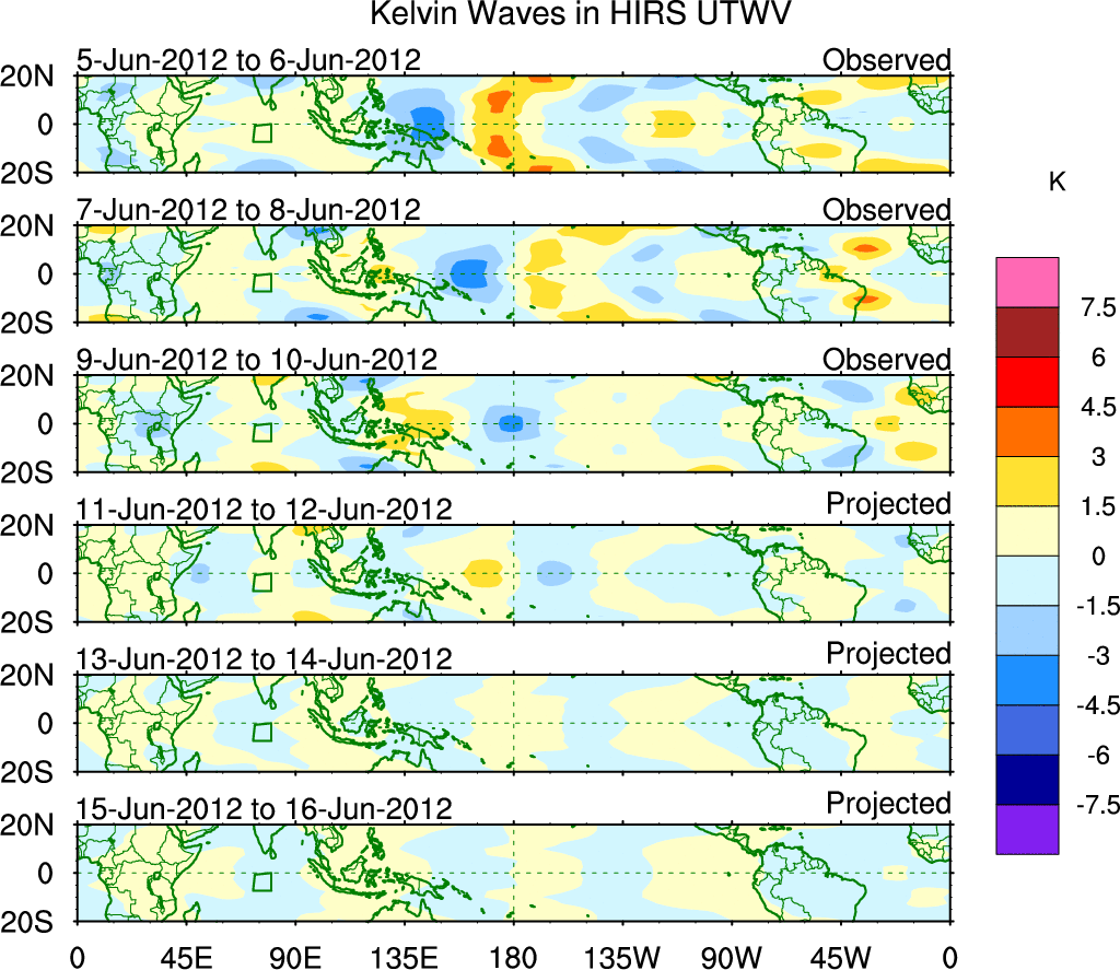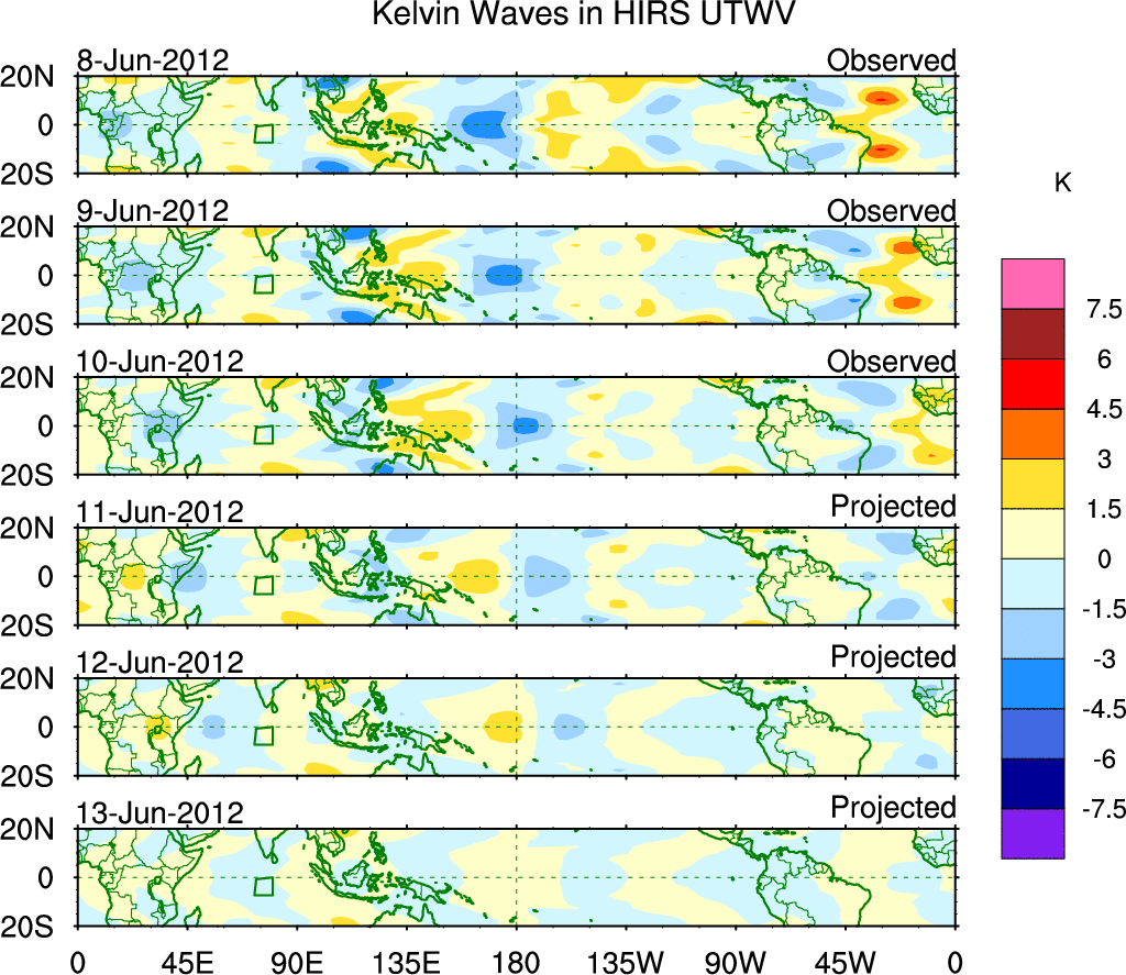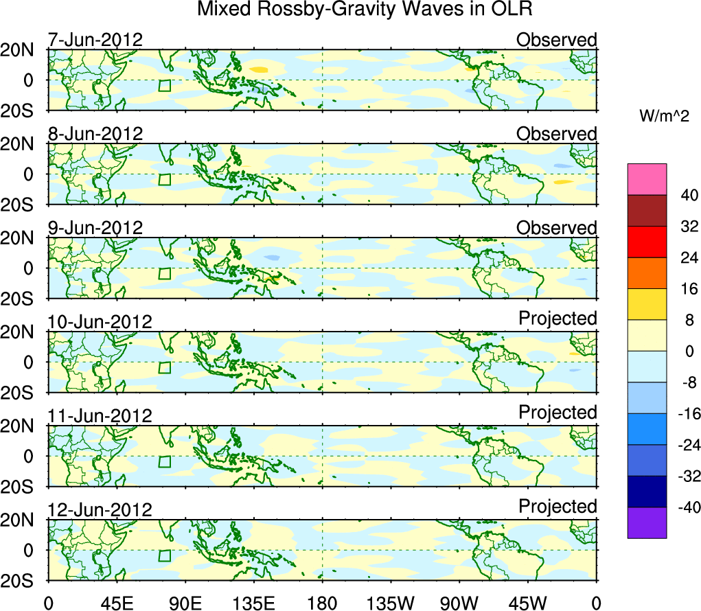 To identify tropical waves in near real-time, the OLR and UTWV data are filtered following Wheeler & Weickmann (2001 MWR). The daily anomalies are calculated using the first 3 harmonics of the seasonal cycle for 1979–2009. Missing values are then filled using linear interpolation in space and time. The most recent 365 days of anomalies are padded with 659 days of zeroes, and the result is filtered for each wave type.