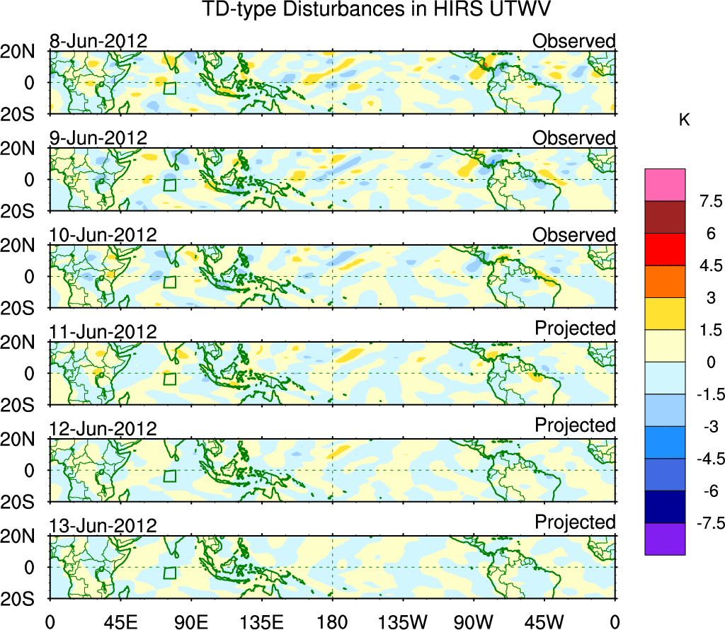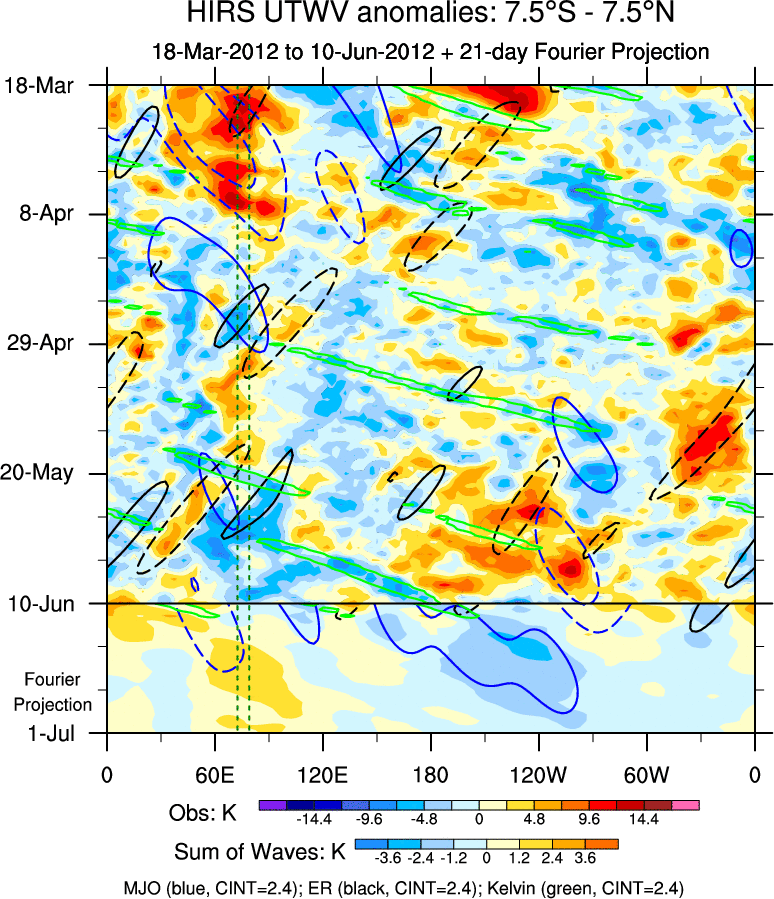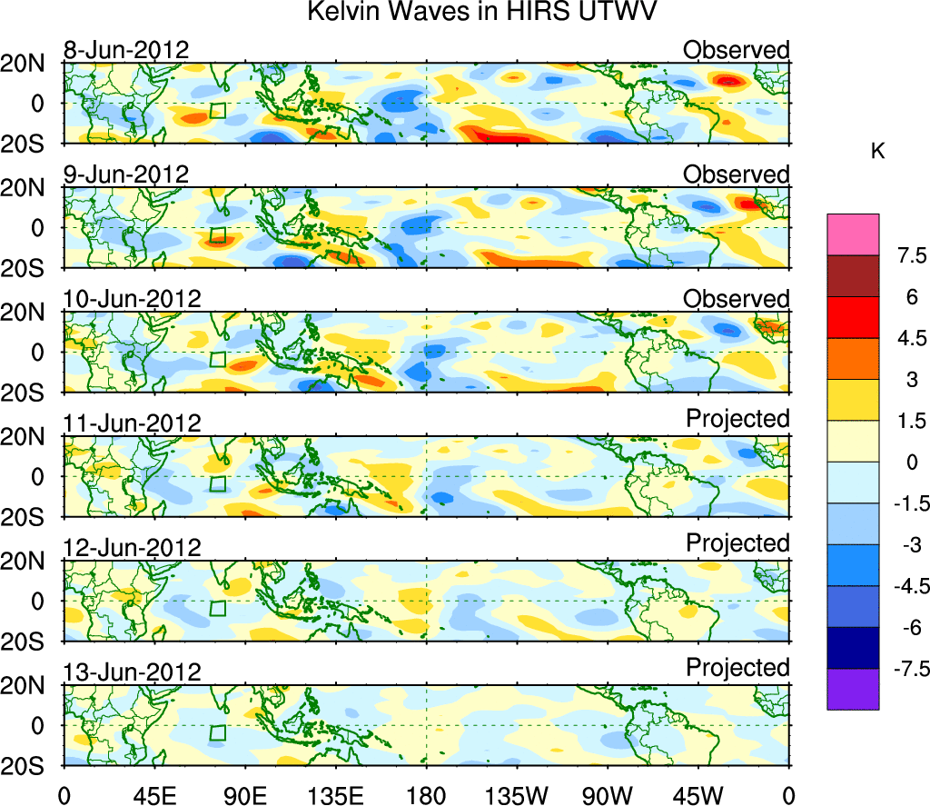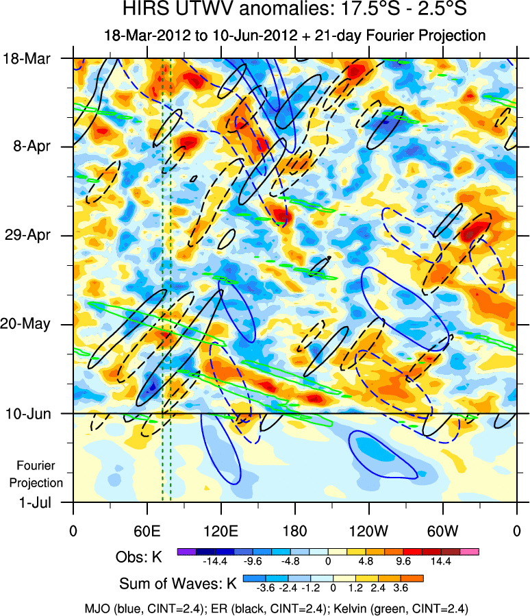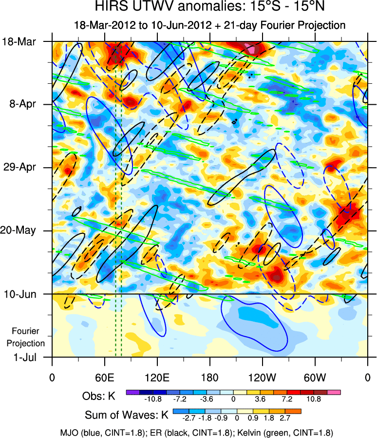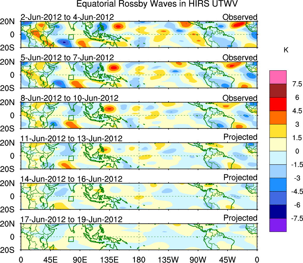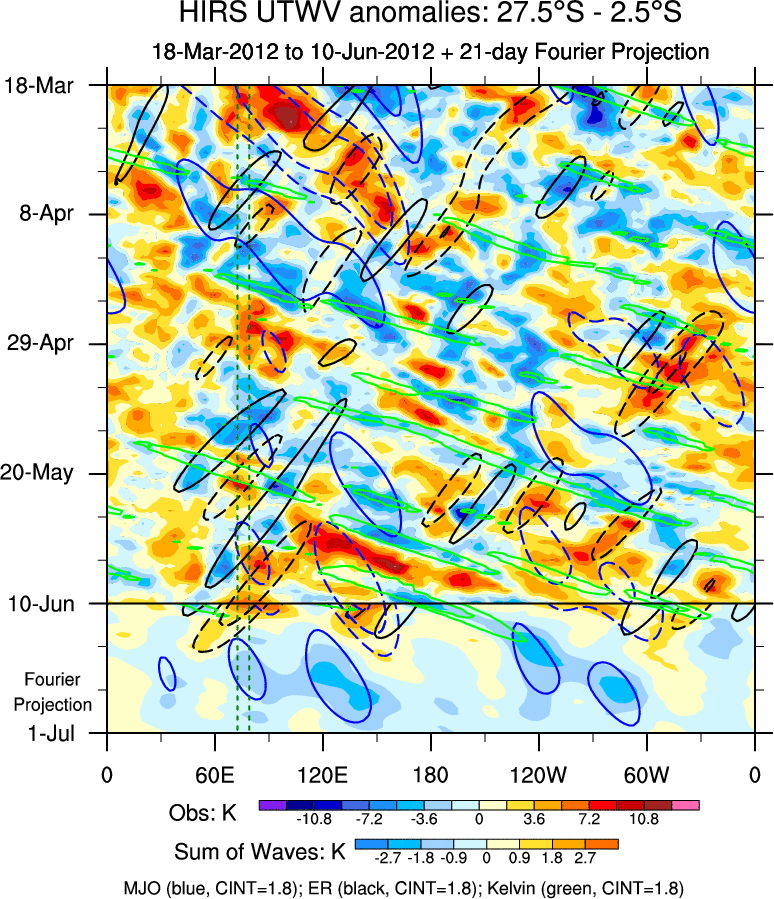 To identify tropical waves in near real-time, the OLR and UTWV data are filtered following Wheeler & Weickmann (2001 MWR). The daily anomalies are calculated using the first 3 harmonics of the seasonal cycle for 1979–2009. Missing values are then filled using linear interpolation in space and time. The most recent 365 days of anomalies are padded with 659 days of zeroes, and the result is filtered for each wave type.