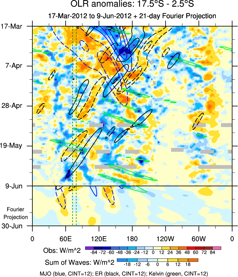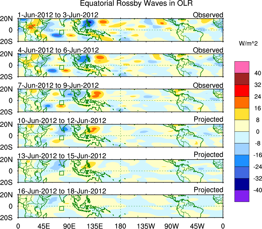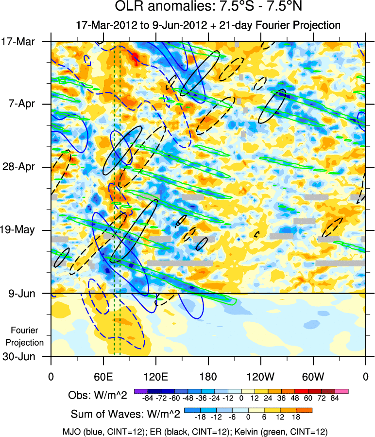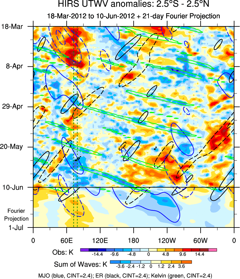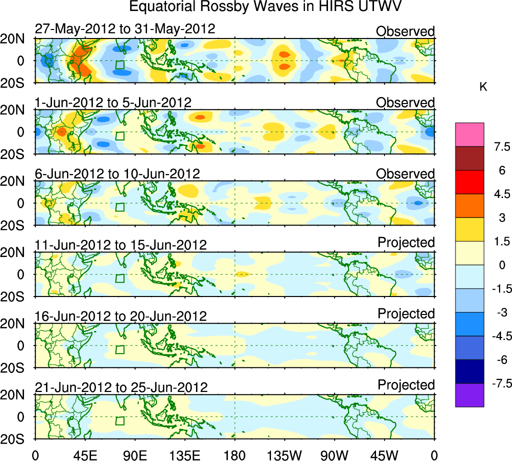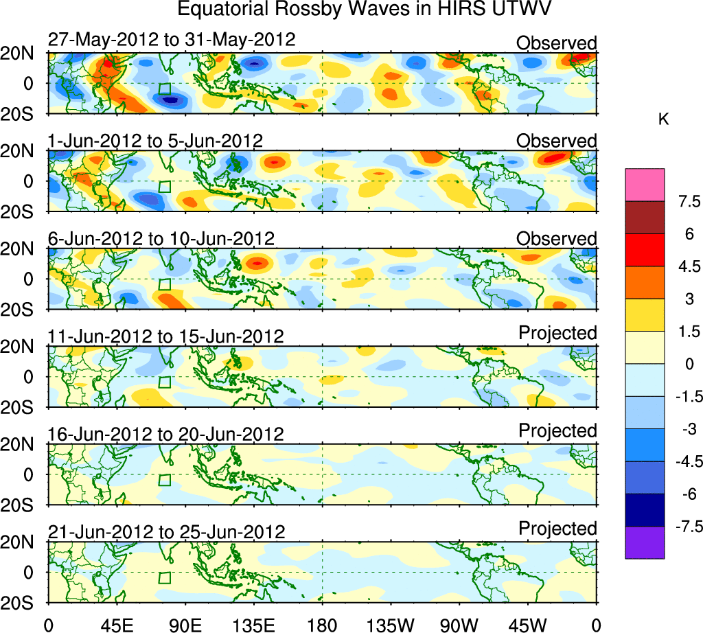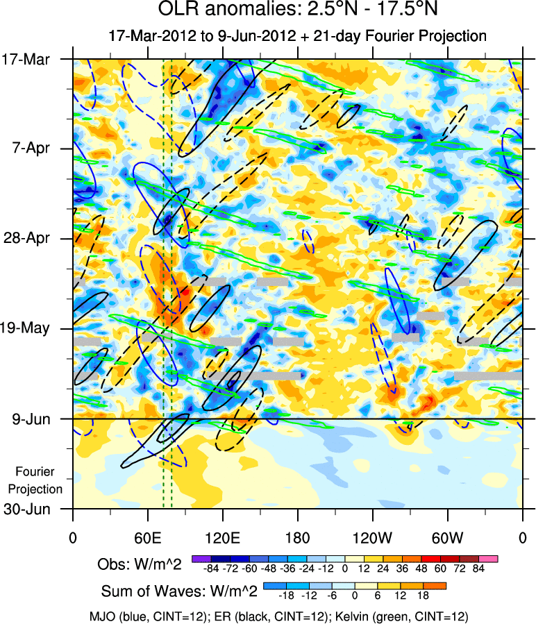 To identify tropical waves in near real-time, the OLR and UTWV data are filtered following Wheeler & Weickmann (2001 MWR). The daily anomalies are calculated using the first 3 harmonics of the seasonal cycle for 1979–2009. Missing values are then filled using linear interpolation in space and time. The most recent 365 days of anomalies are padded with 659 days of zeroes, and the result is filtered for each wave type.