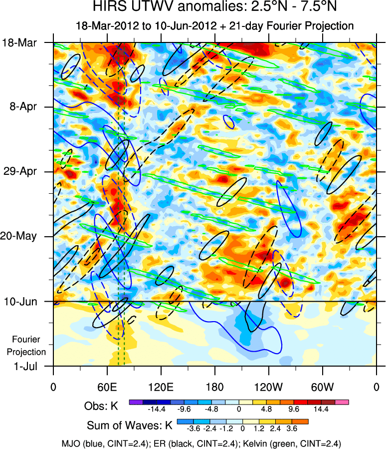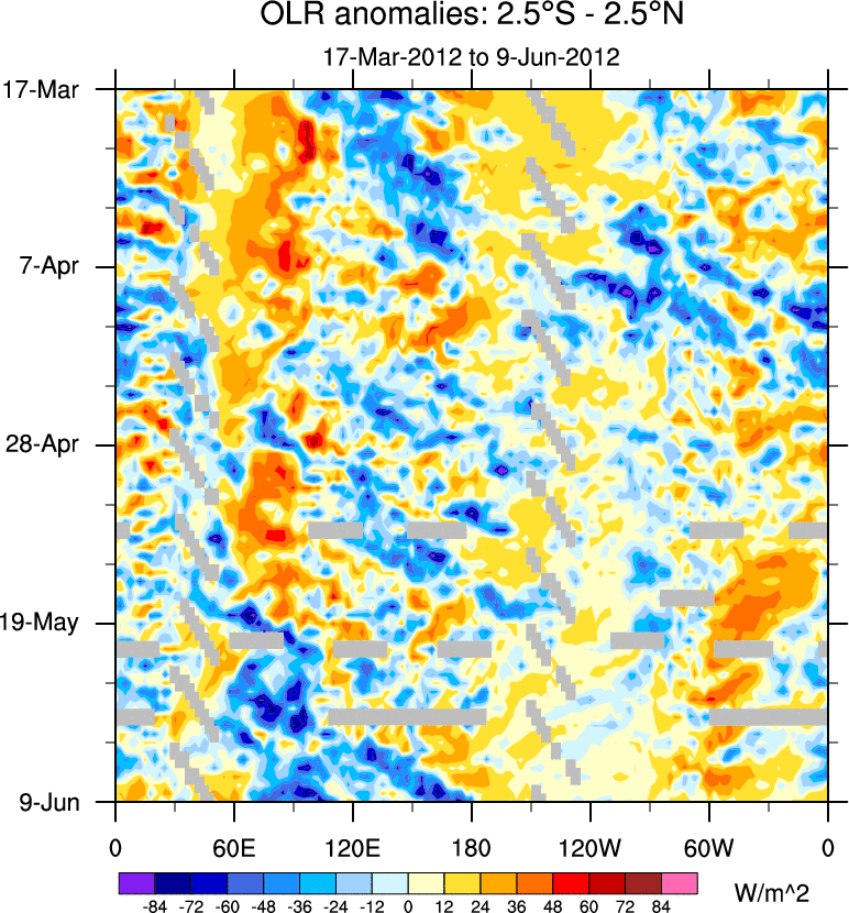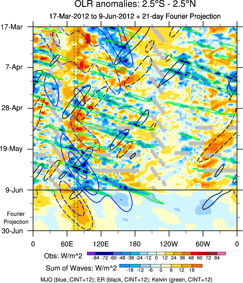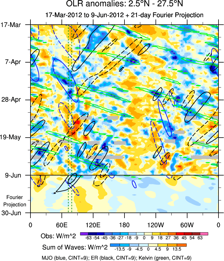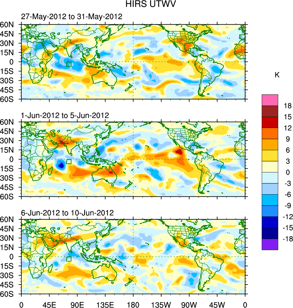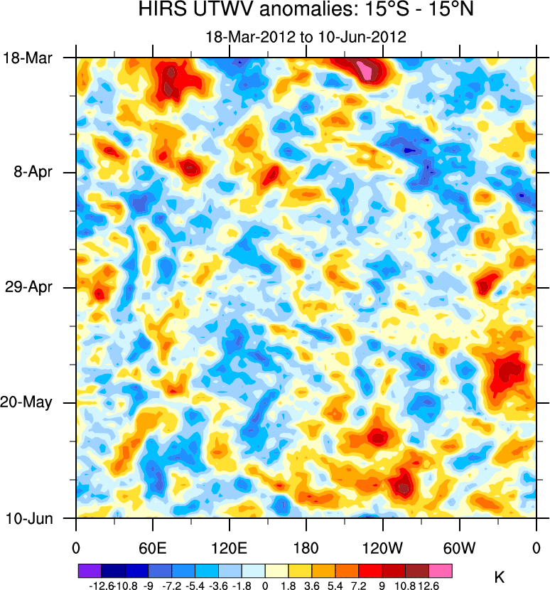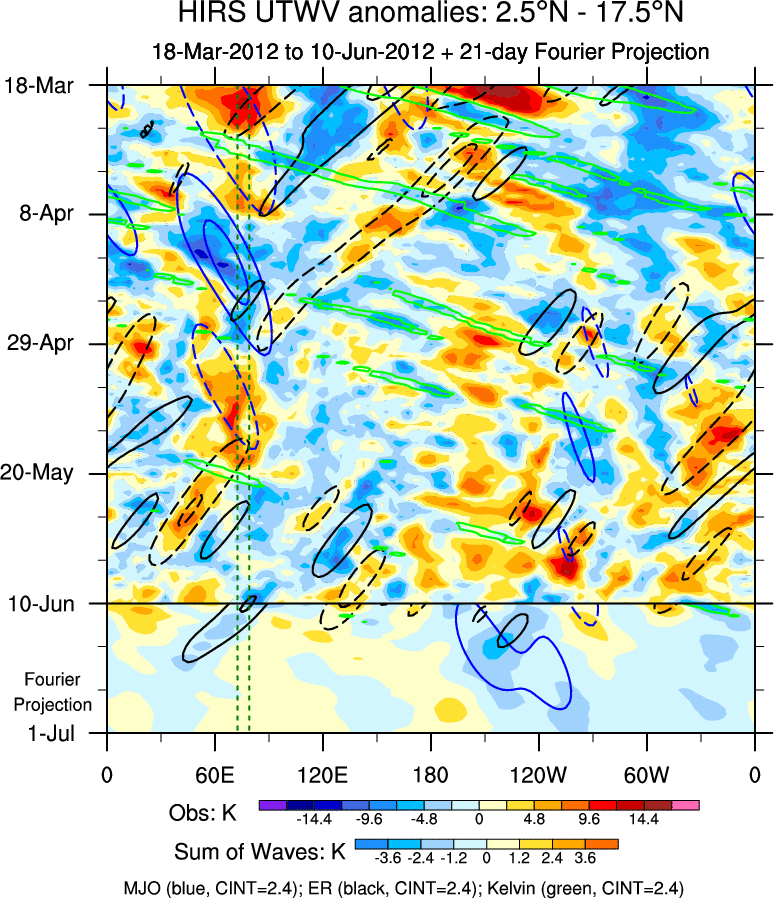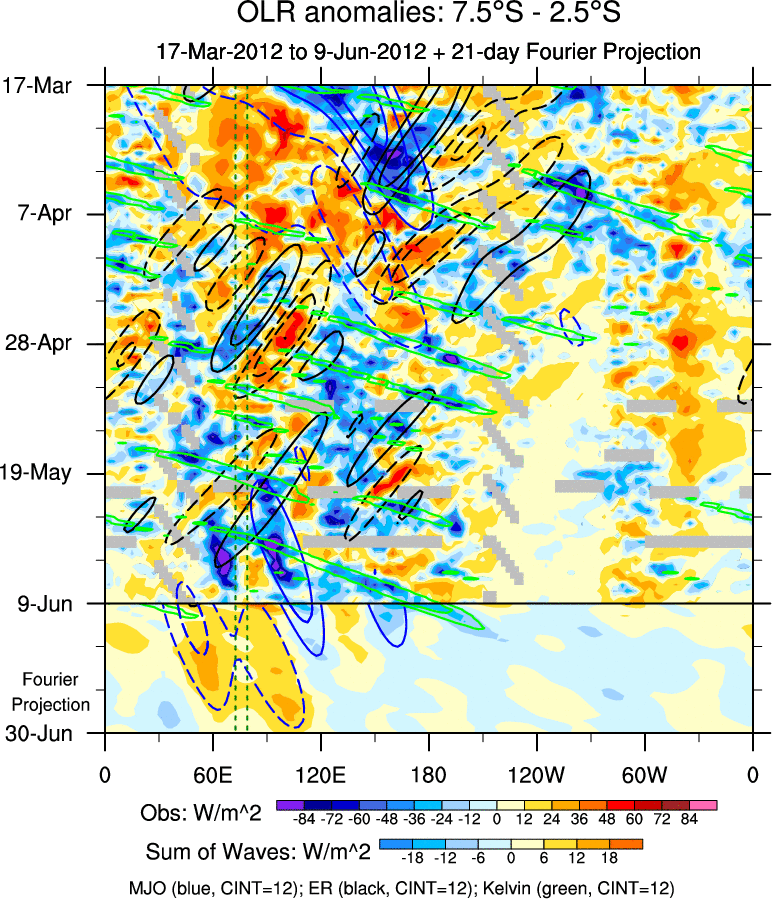 To identify tropical waves in near real-time, the OLR and UTWV data are filtered following Wheeler & Weickmann (2001 MWR). The daily anomalies are calculated using the first 3 harmonics of the seasonal cycle for 1979–2009. Missing values are then filled using linear interpolation in space and time. The most recent 365 days of anomalies are padded with 659 days of zeroes, and the result is filtered for each wave type.