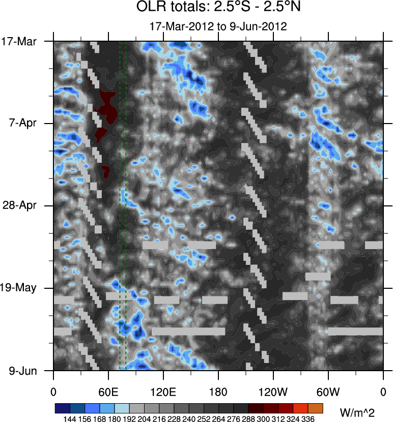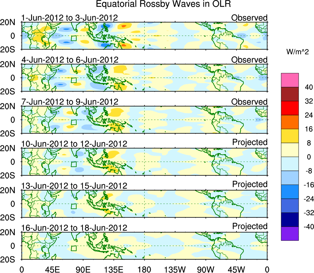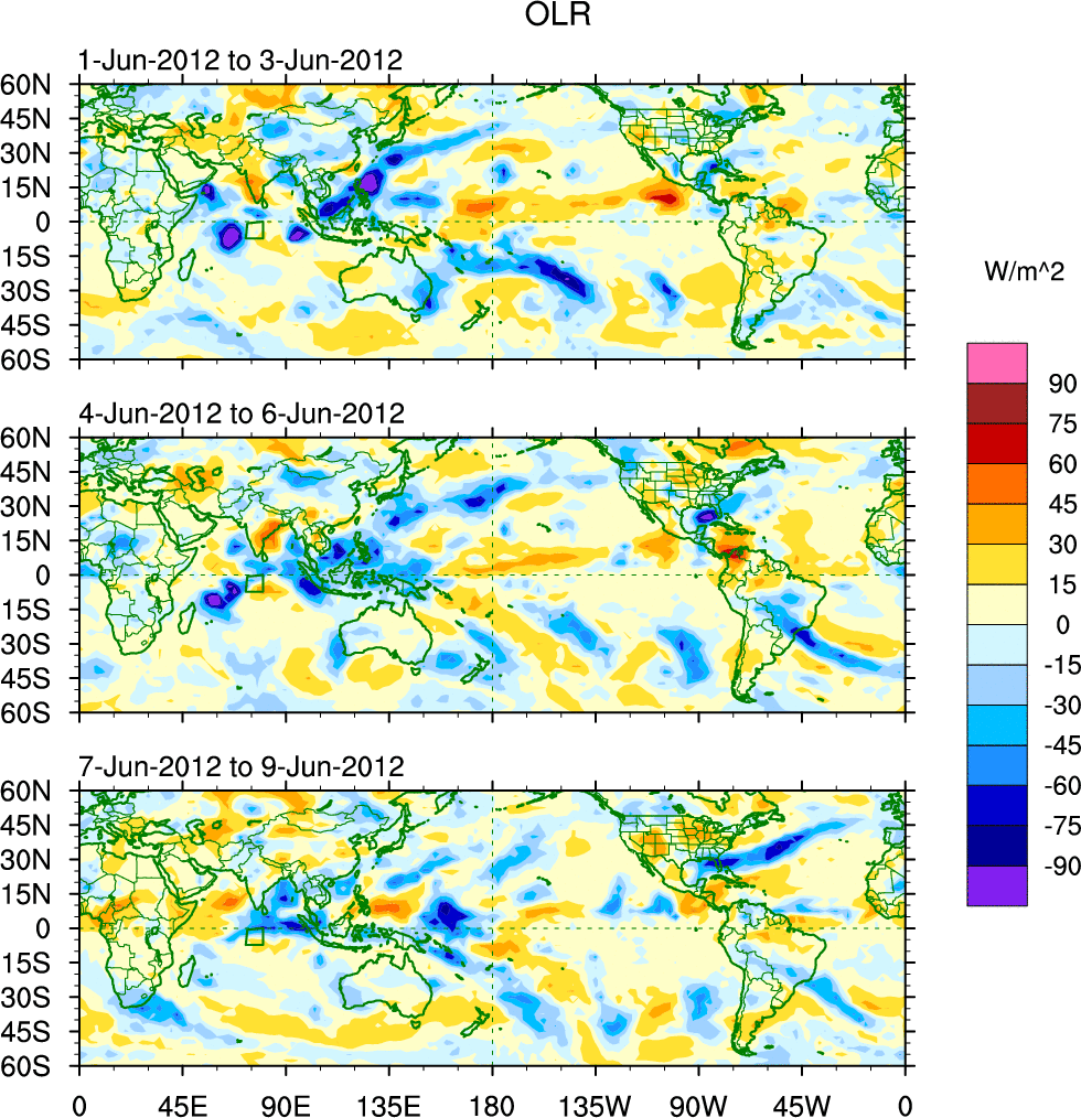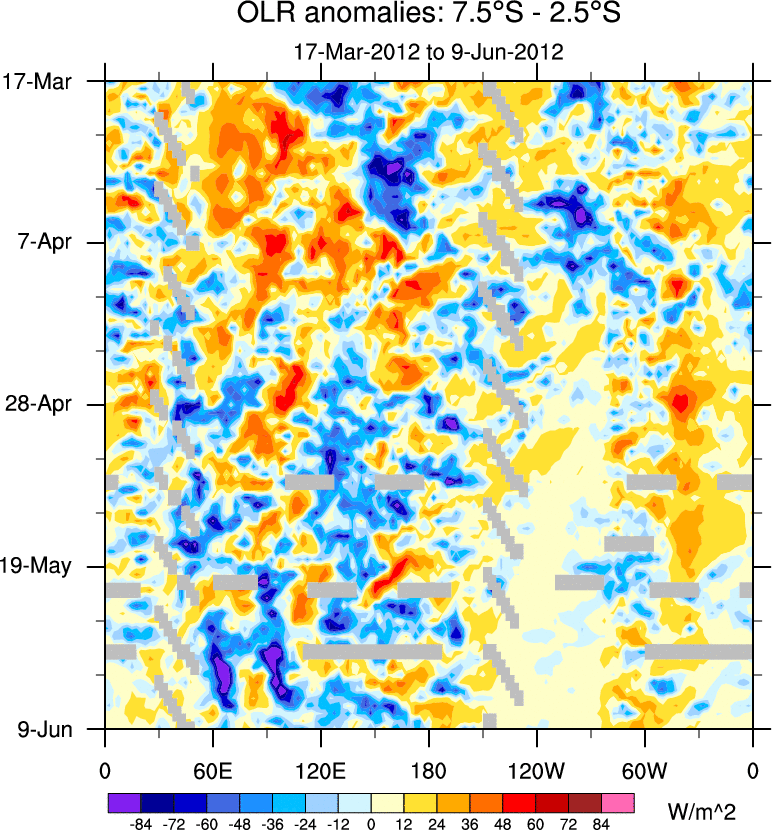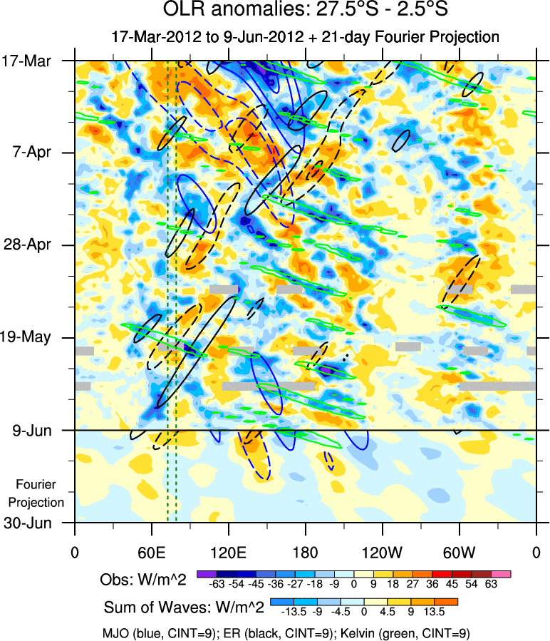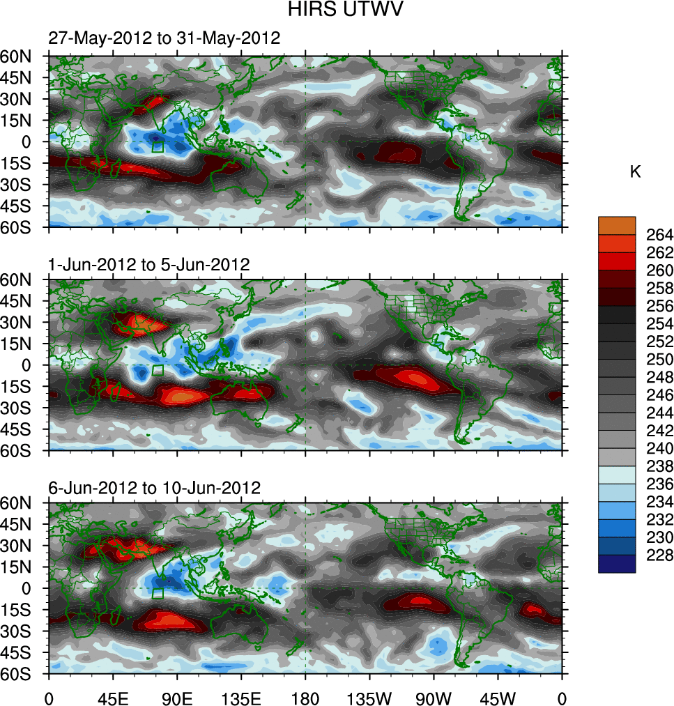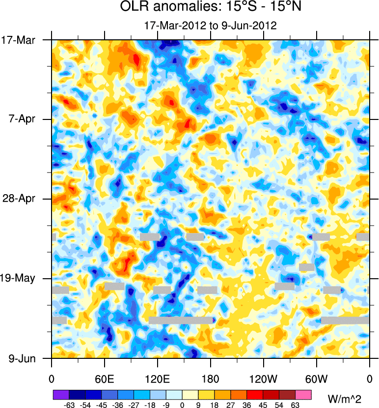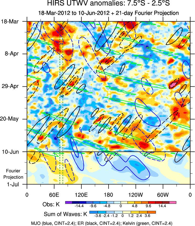 To identify tropical waves in near real-time, the OLR and UTWV data are filtered following Wheeler & Weickmann (2001 MWR). The daily anomalies are calculated using the first 3 harmonics of the seasonal cycle for 1979–2009. Missing values are then filled using linear interpolation in space and time. The most recent 365 days of anomalies are padded with 659 days of zeroes, and the result is filtered for each wave type.