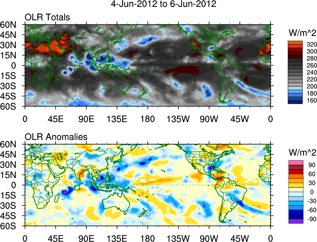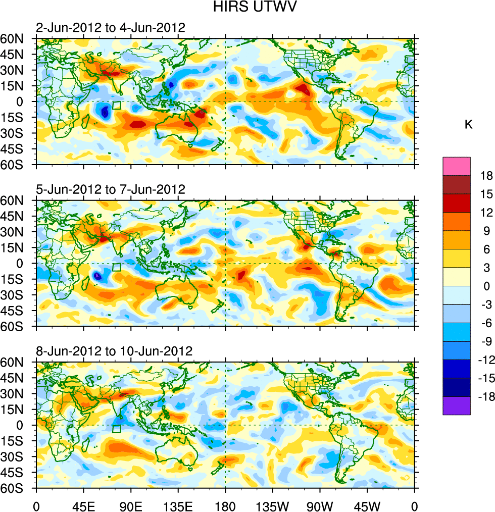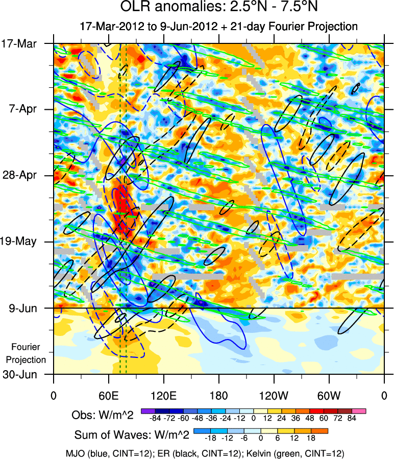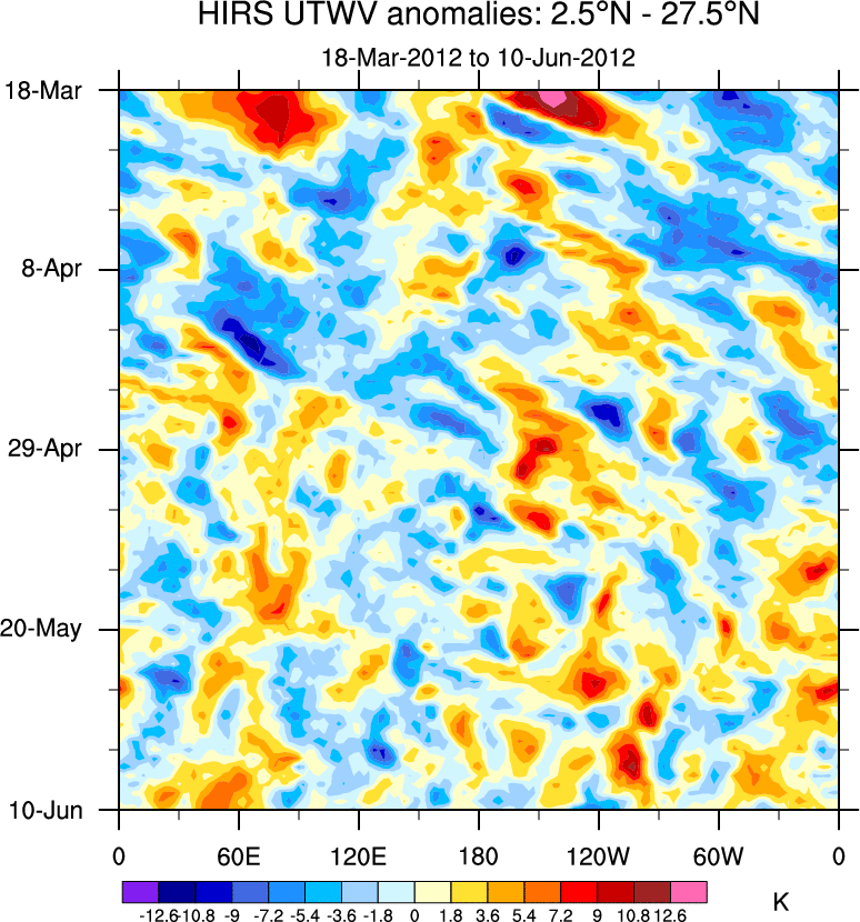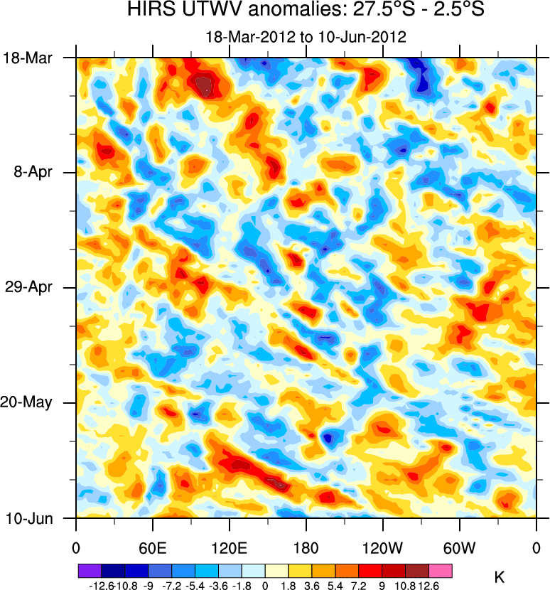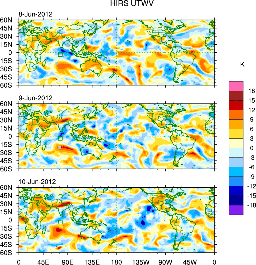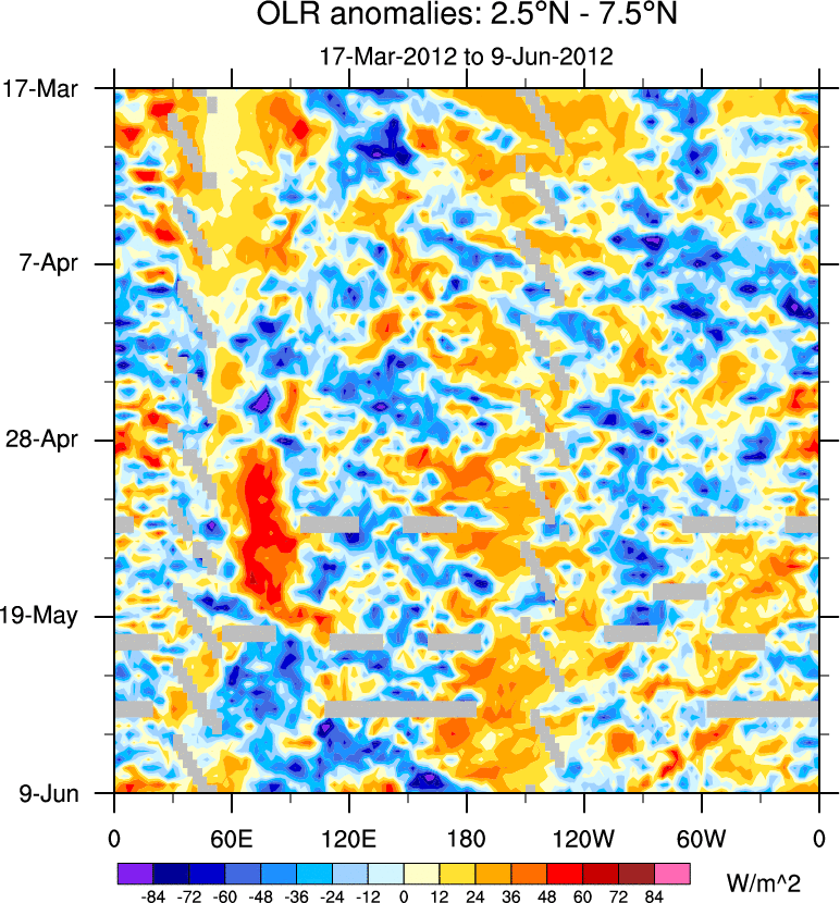 To identify tropical waves in near real-time, the OLR and UTWV data are filtered following Wheeler & Weickmann (2001 MWR). The daily anomalies are calculated using the first 3 harmonics of the seasonal cycle for 1979–2009. Missing values are then filled using linear interpolation in space and time. The most recent 365 days of anomalies are padded with 659 days of zeroes, and the result is filtered for each wave type.