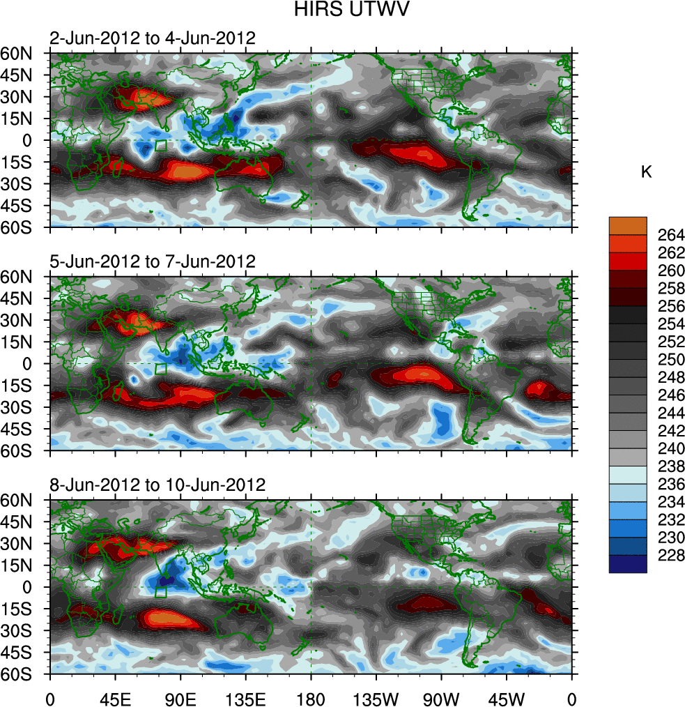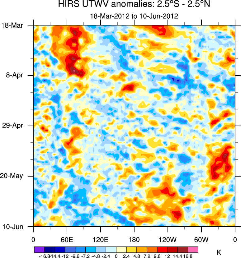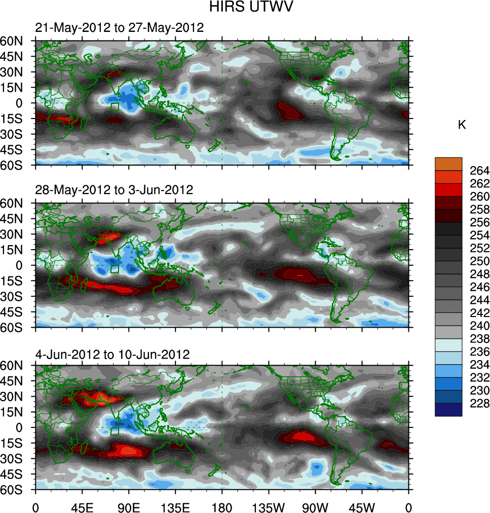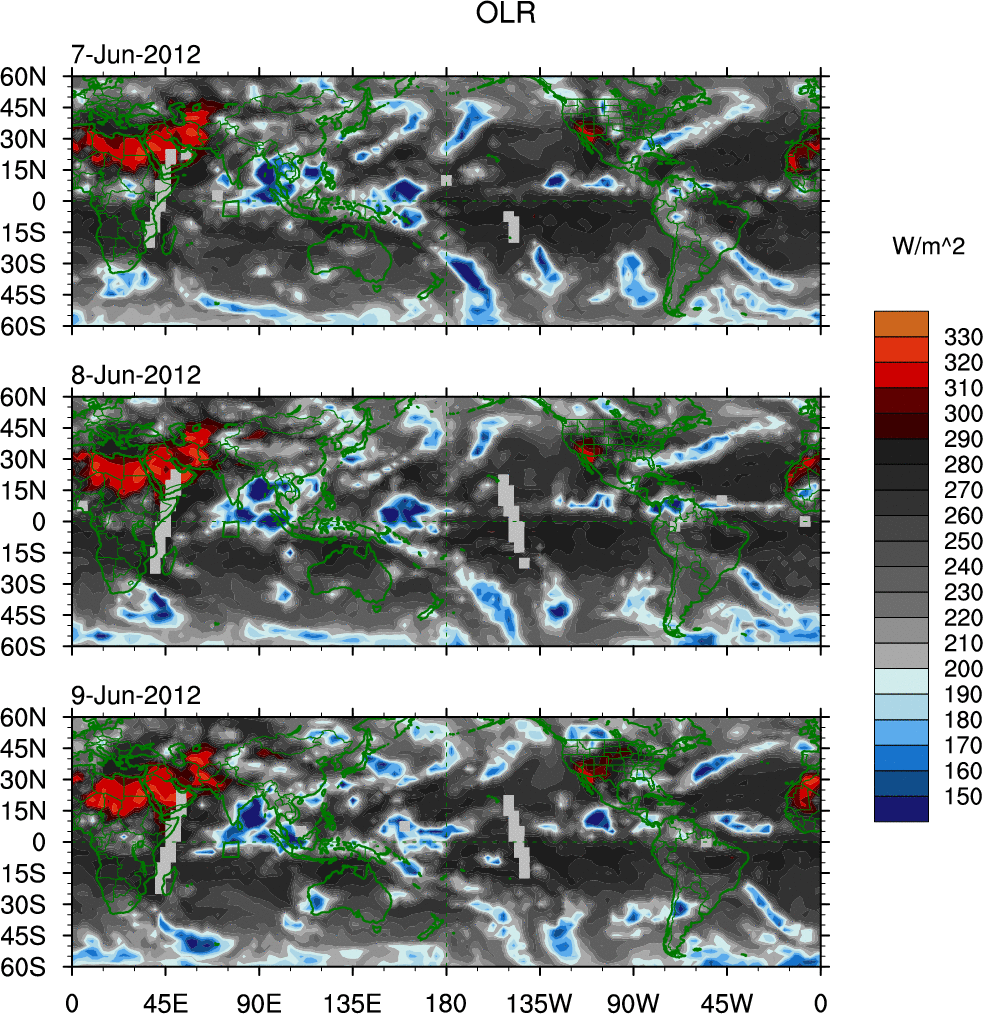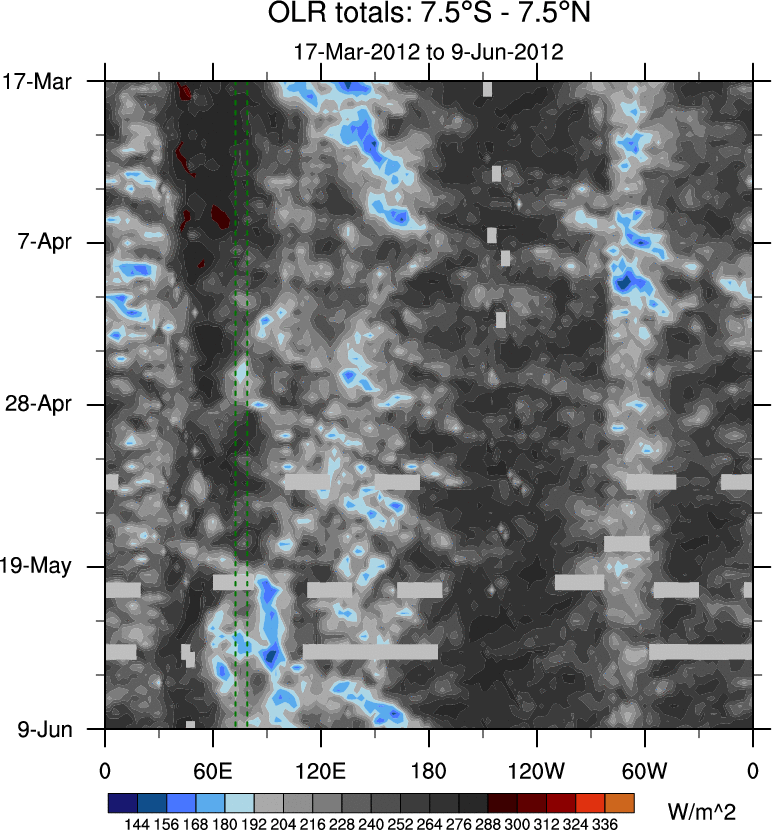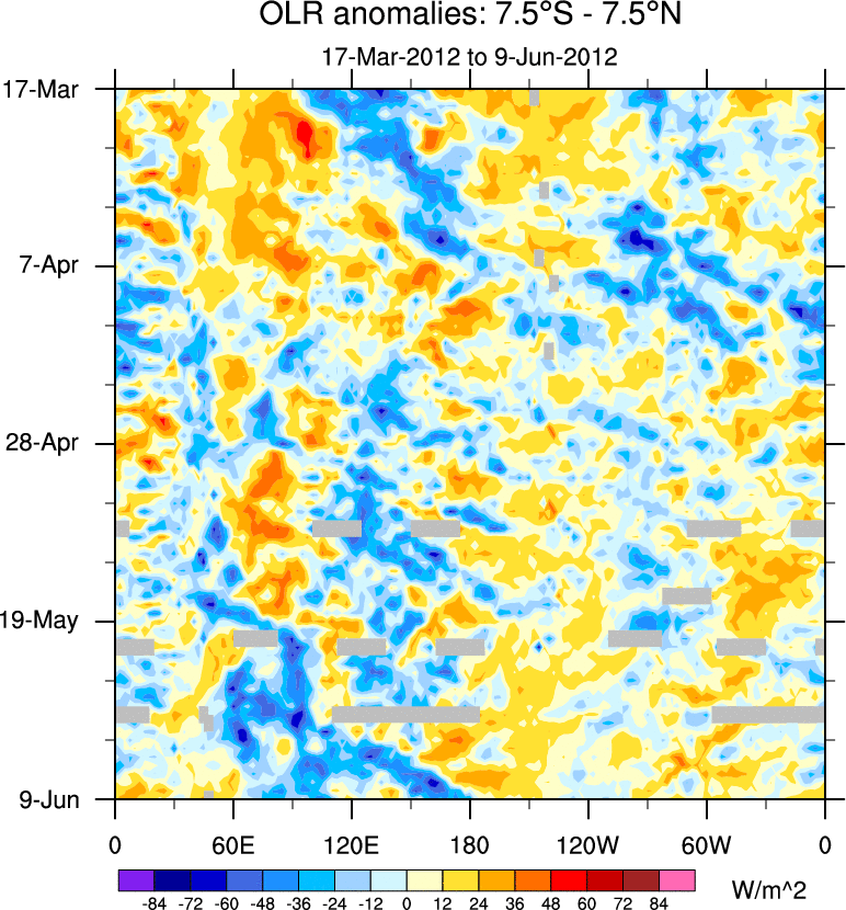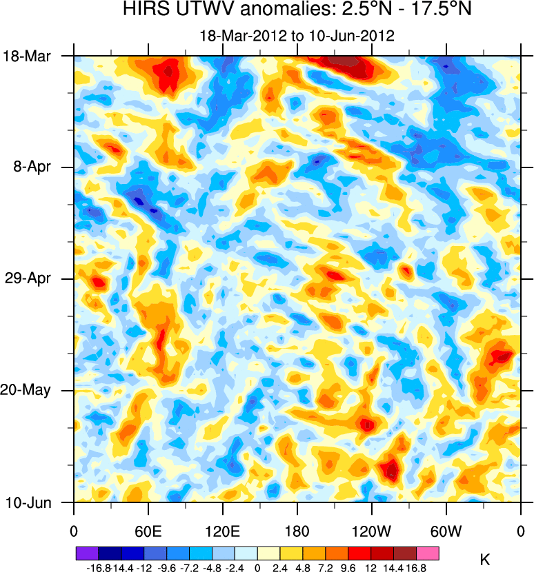 To identify tropical waves in near real-time, the OLR and UTWV data are filtered following Wheeler & Weickmann (2001 MWR). The daily anomalies are calculated using the first 3 harmonics of the seasonal cycle for 1979–2009. Missing values are then filled using linear interpolation in space and time. The most recent 365 days of anomalies are padded with 659 days of zeroes, and the result is filtered for each wave type.