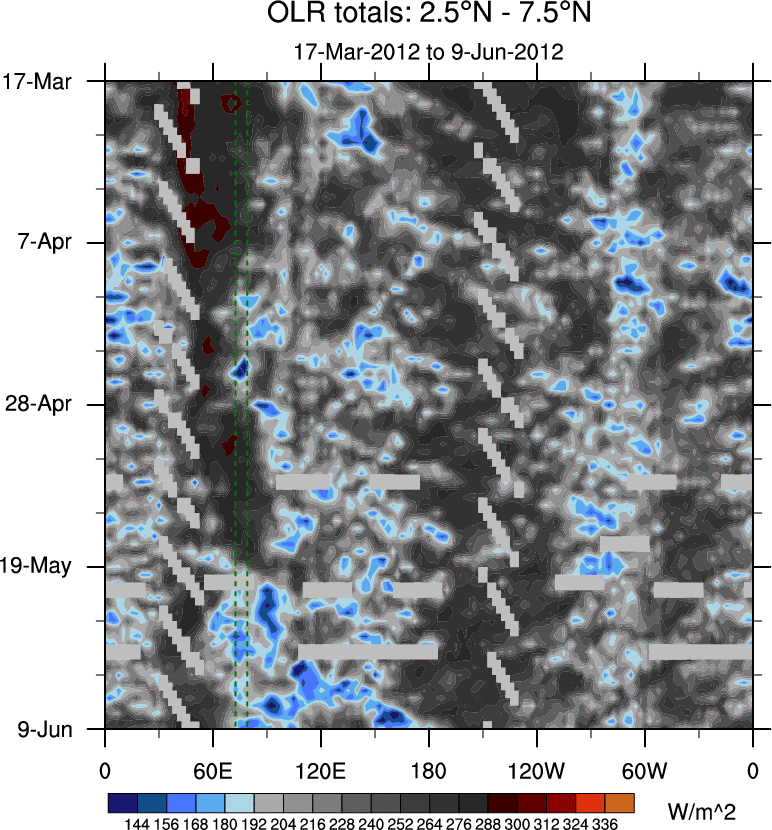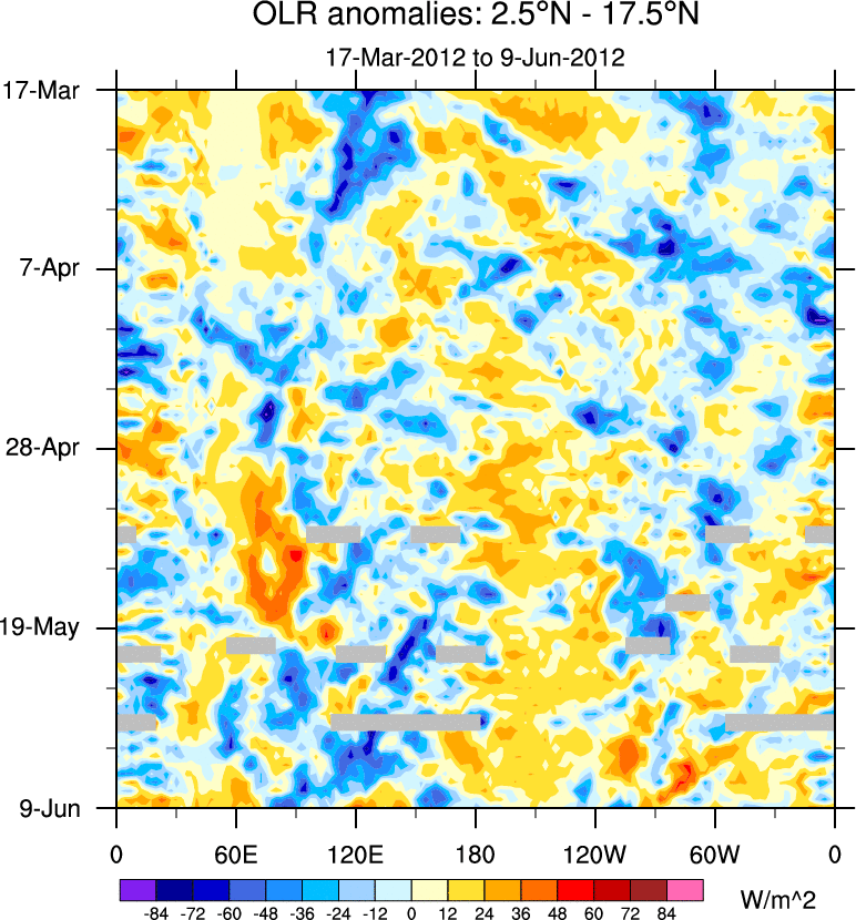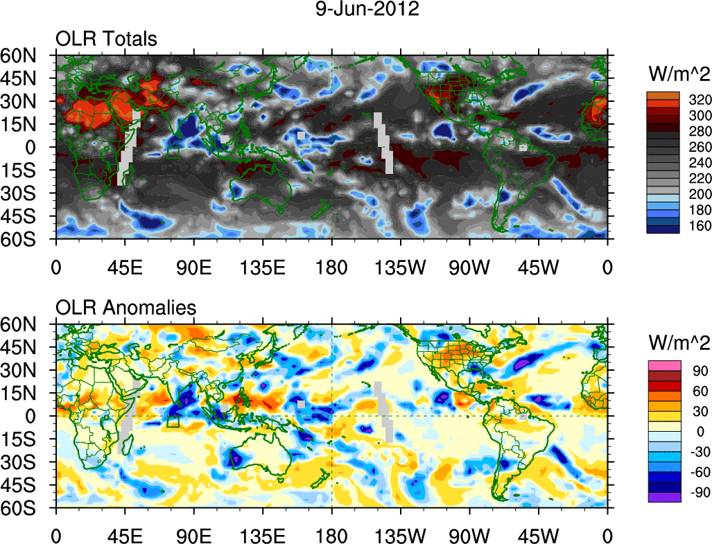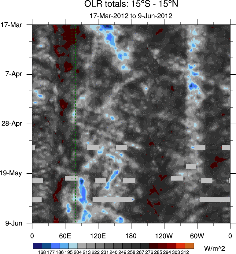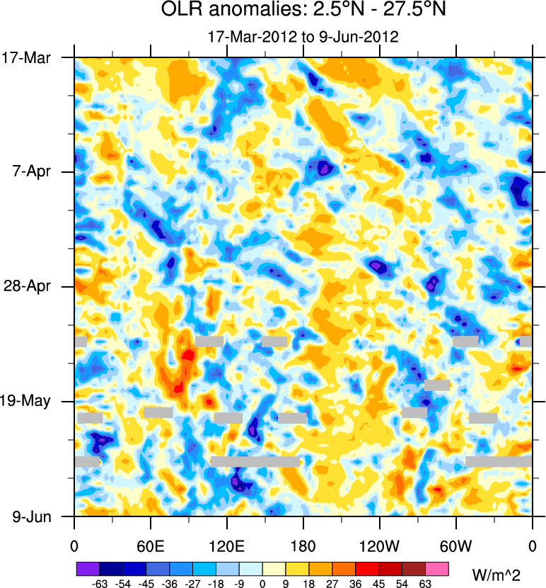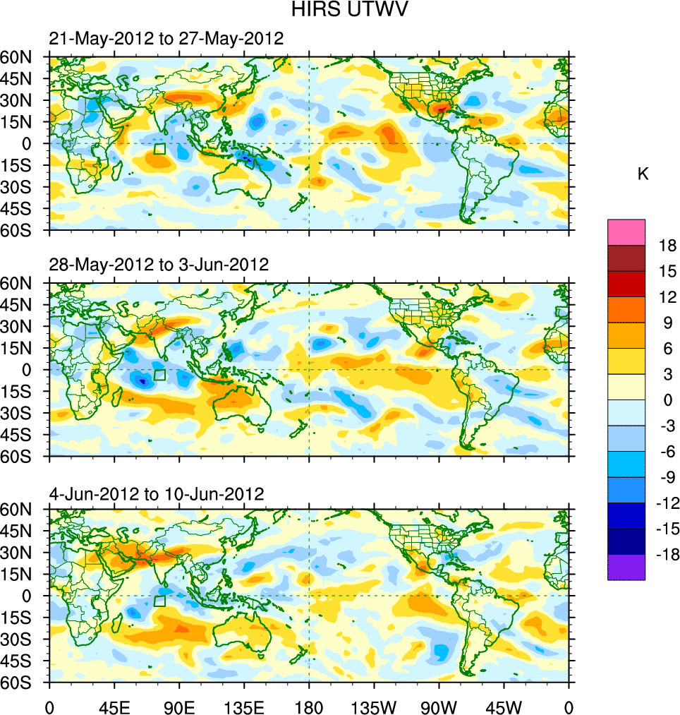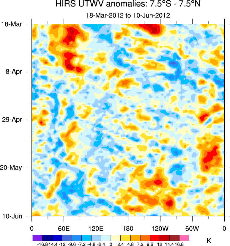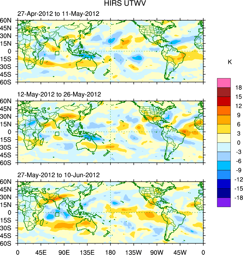To identify tropical waves in near real-time, the OLR and UTWV data are filtered following Wheeler & Weickmann (2001 MWR). The daily anomalies are calculated using the first 3 harmonics of the seasonal cycle for 1979–2009. Missing values are then filled using linear interpolation in space and time. The most recent 365 days of anomalies are padded with 659 days of zeroes, and the result is filtered for each wave type.