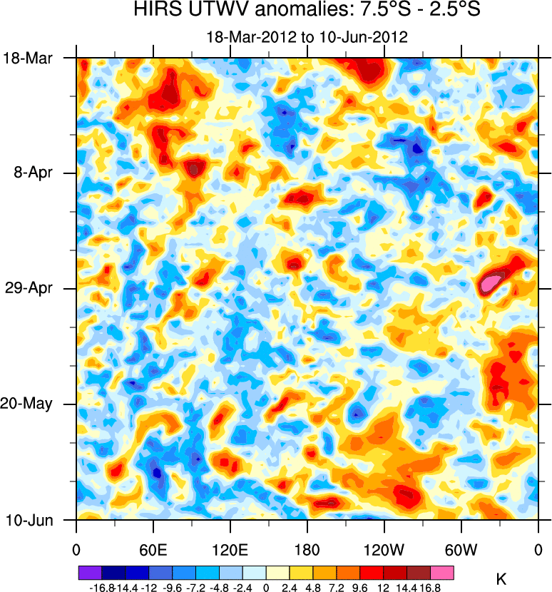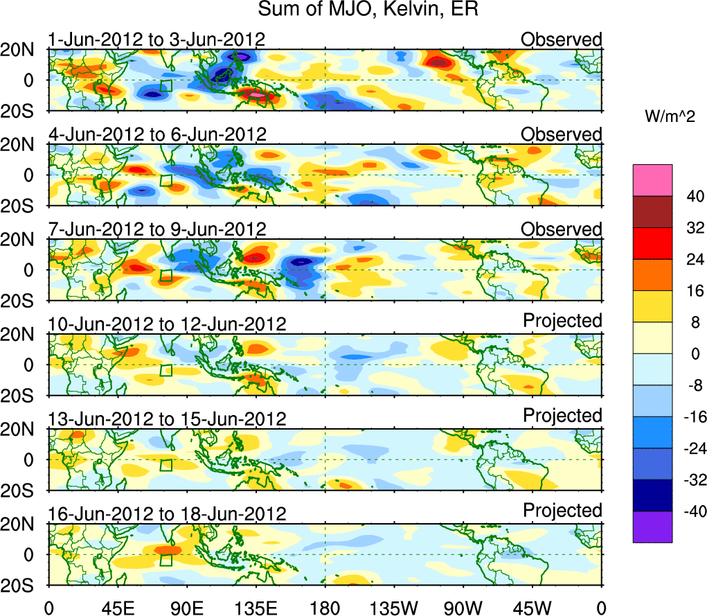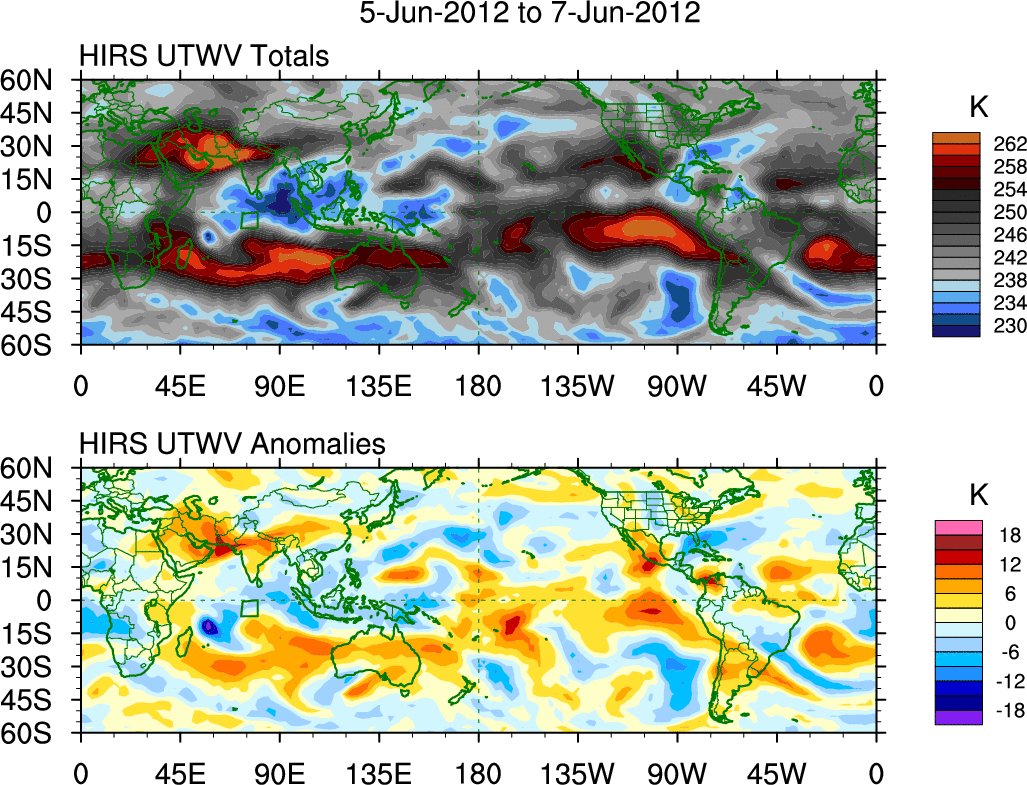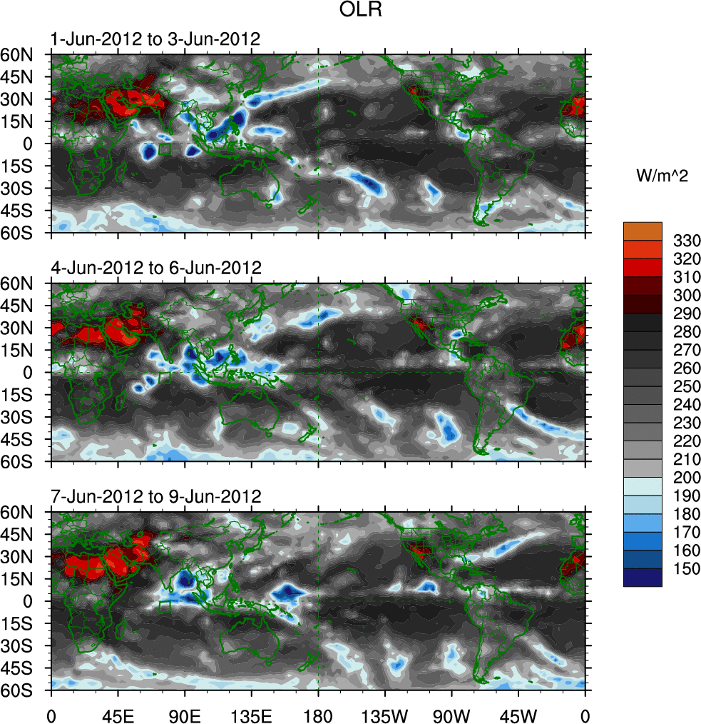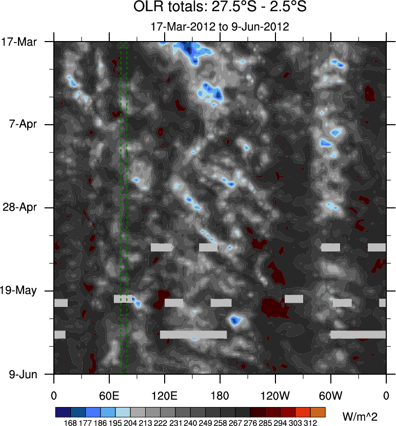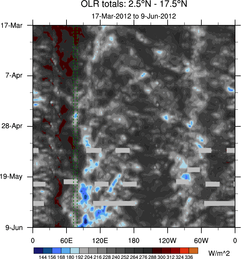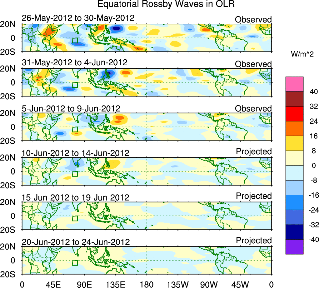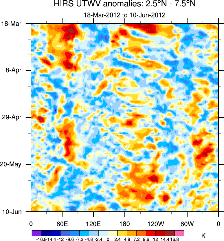 To identify tropical waves in near real-time, the OLR and UTWV data are filtered following Wheeler & Weickmann (2001 MWR). The daily anomalies are calculated using the first 3 harmonics of the seasonal cycle for 1979–2009. Missing values are then filled using linear interpolation in space and time. The most recent 365 days of anomalies are padded with 659 days of zeroes, and the result is filtered for each wave type.