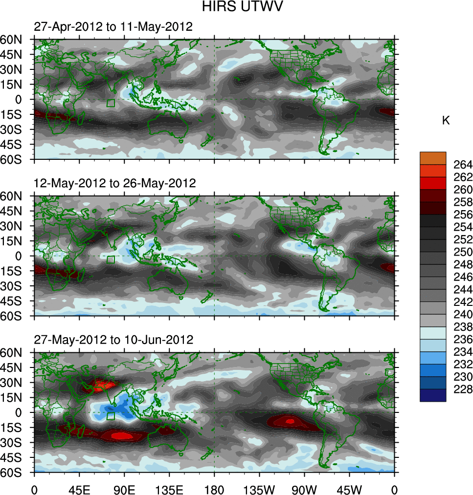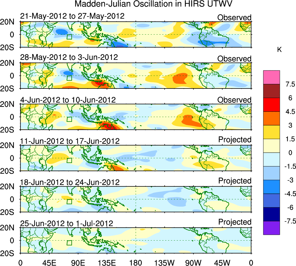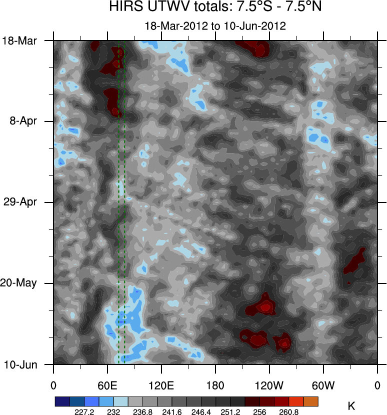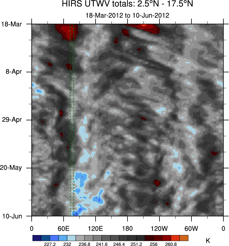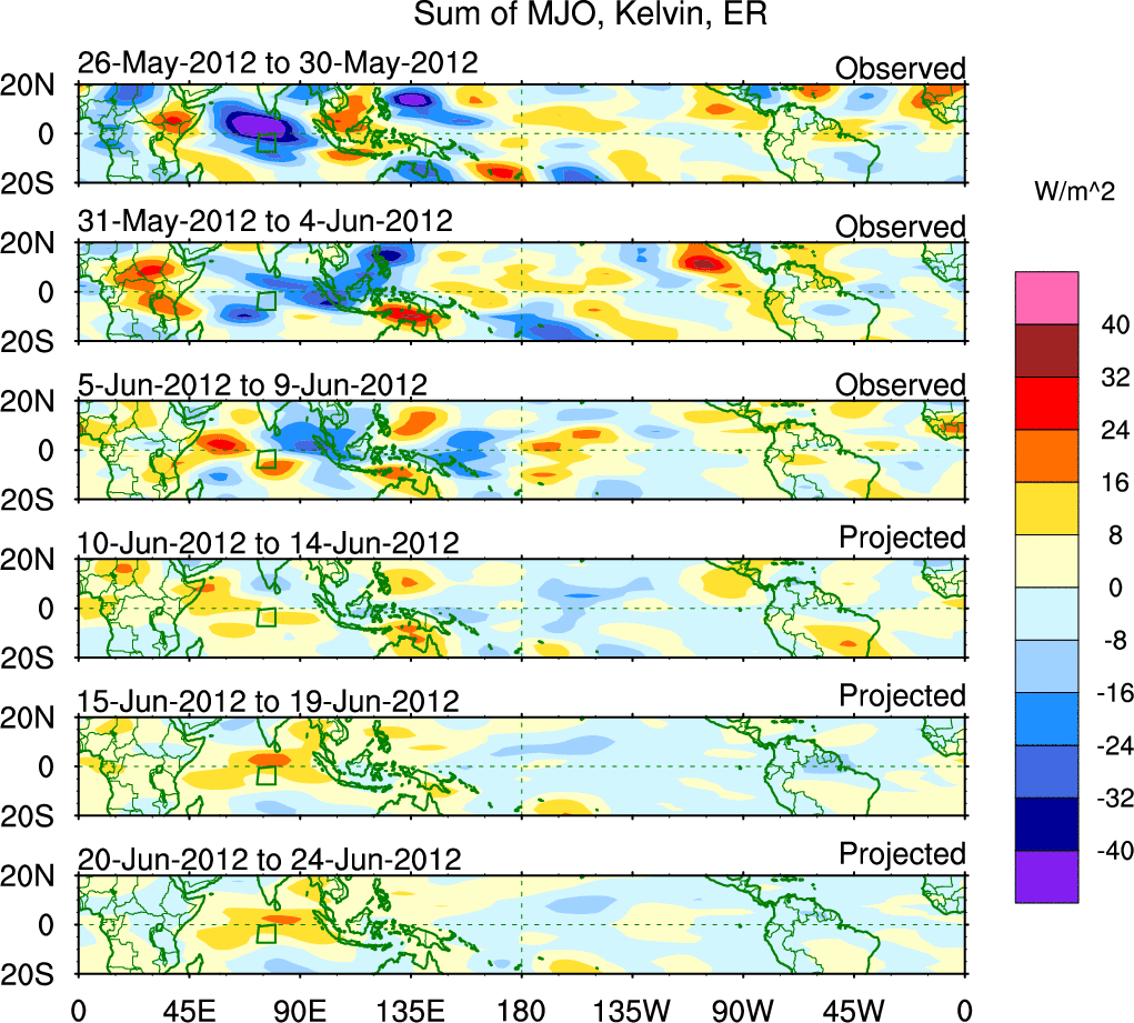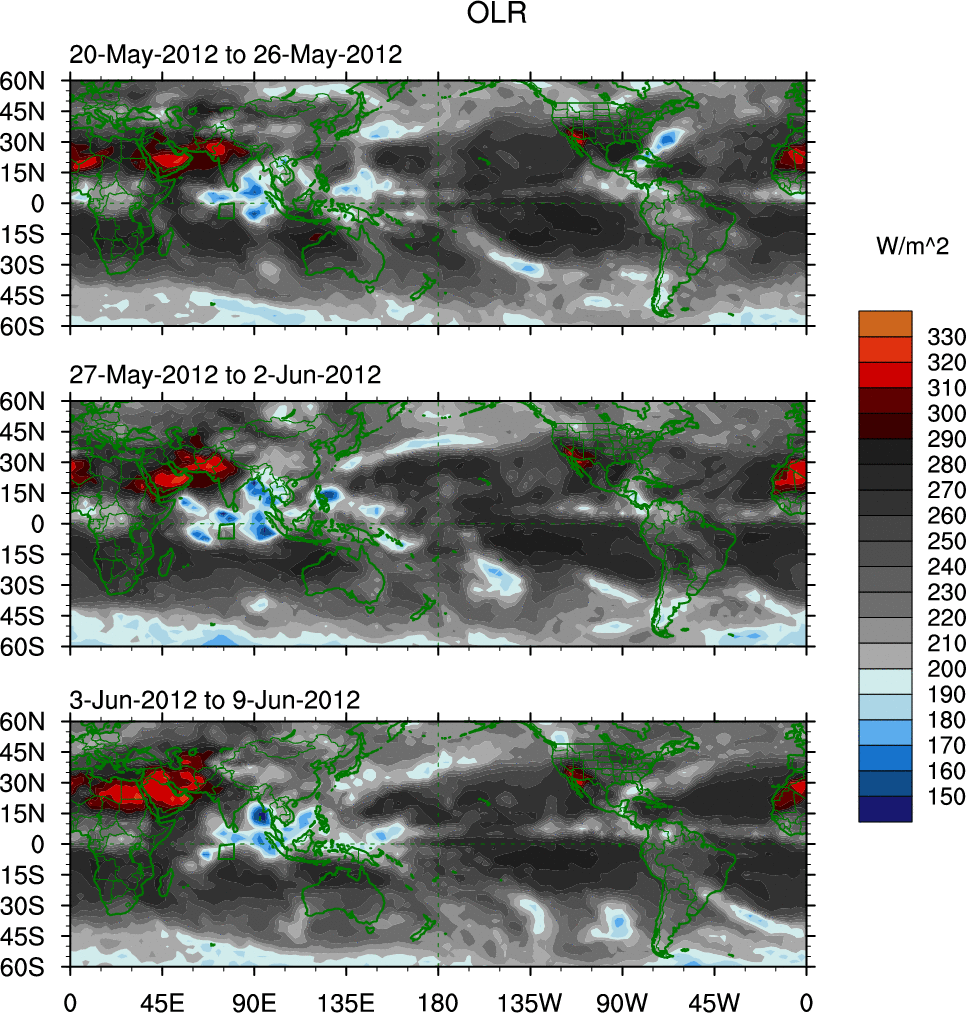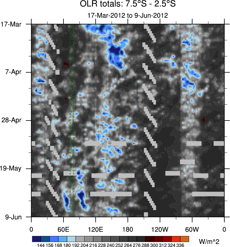 To identify tropical waves in near real-time, the OLR and UTWV data are filtered following Wheeler & Weickmann (2001 MWR). The daily anomalies are calculated using the first 3 harmonics of the seasonal cycle for 1979–2009. Missing values are then filled using linear interpolation in space and time. The most recent 365 days of anomalies are padded with 659 days of zeroes, and the result is filtered for each wave type.