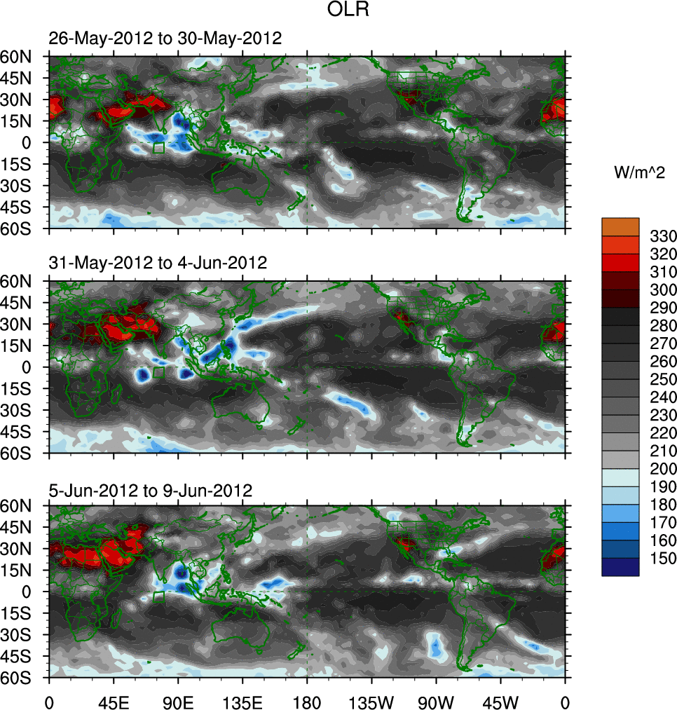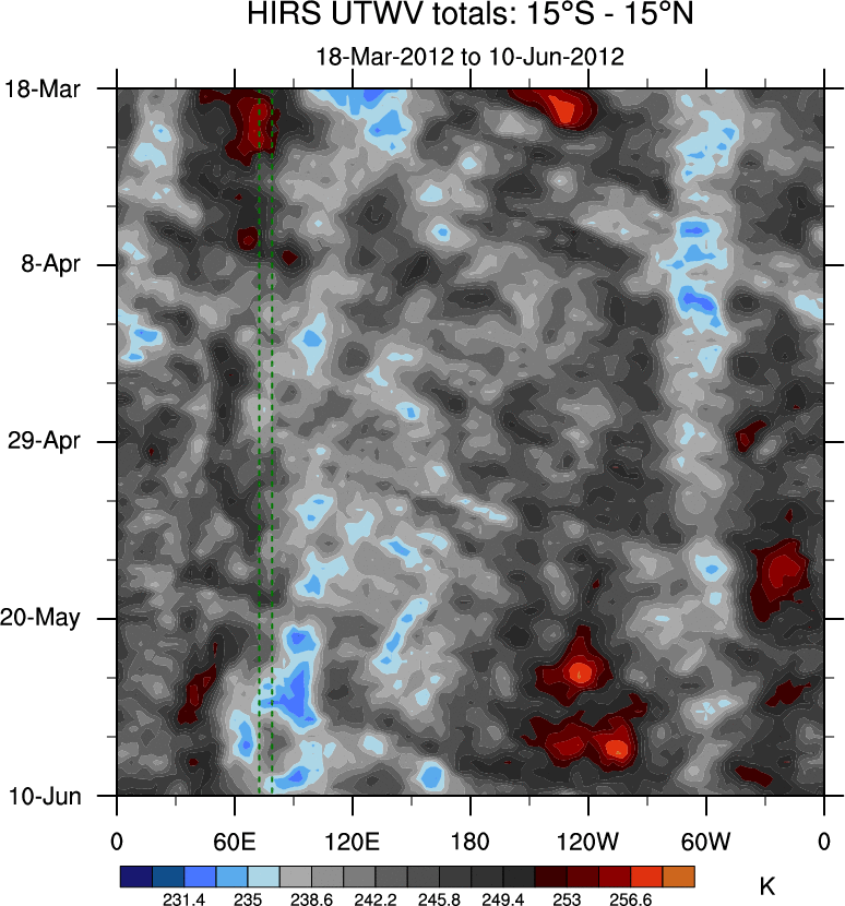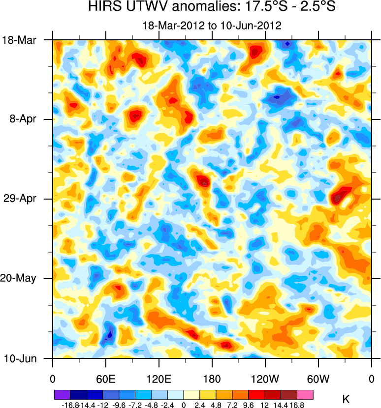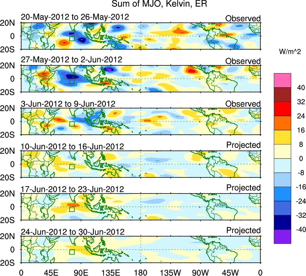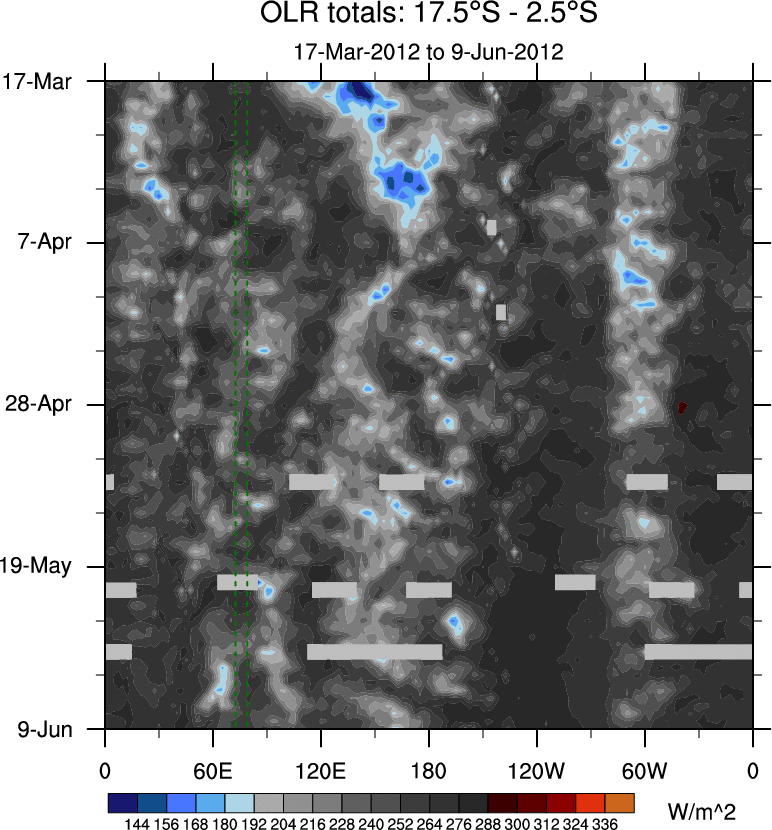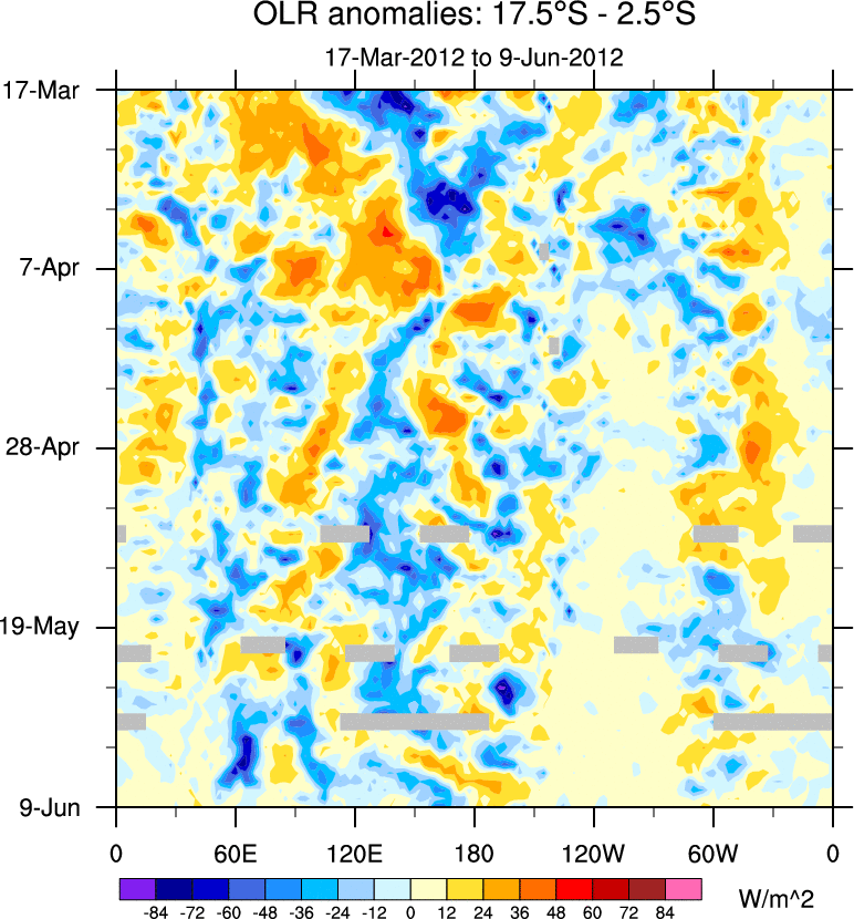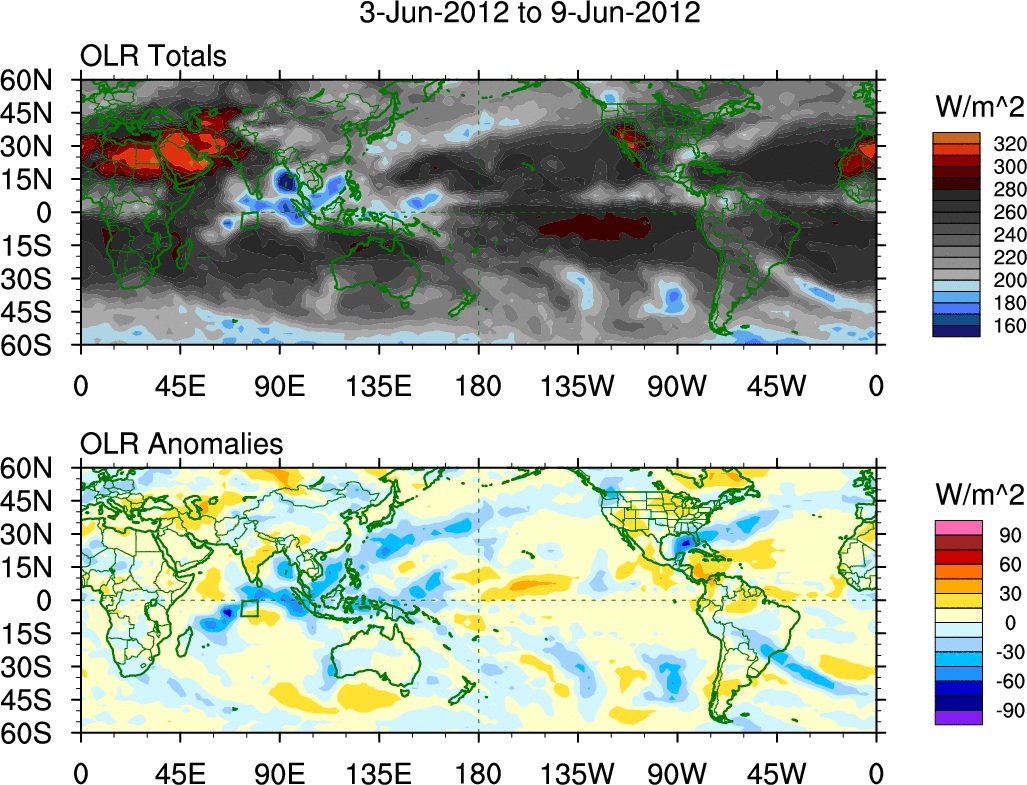 To identify tropical waves in near real-time, the OLR and UTWV data are filtered following Wheeler & Weickmann (2001 MWR). The daily anomalies are calculated using the first 3 harmonics of the seasonal cycle for 1979–2009. Missing values are then filled using linear interpolation in space and time. The most recent 365 days of anomalies are padded with 659 days of zeroes, and the result is filtered for each wave type.