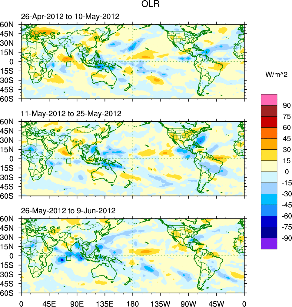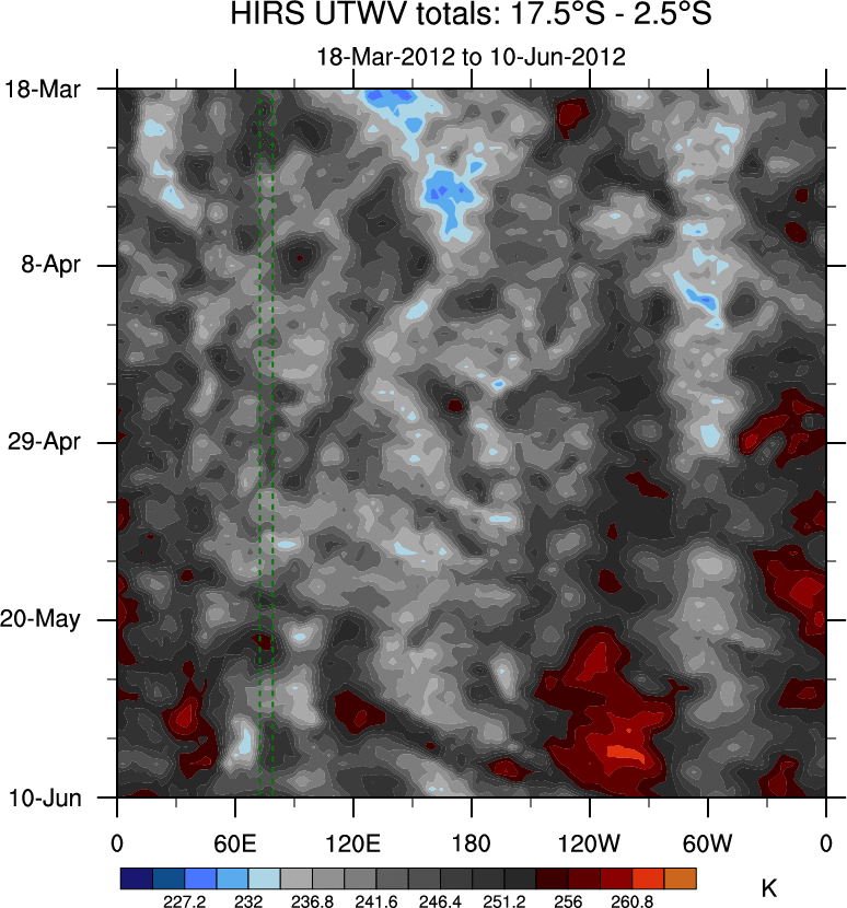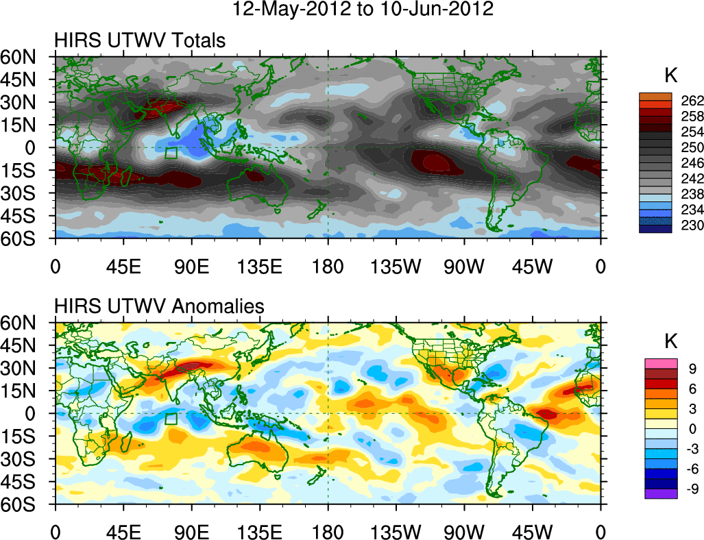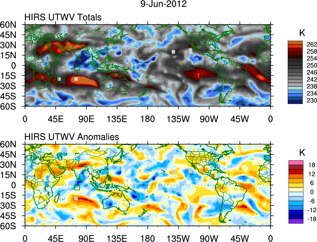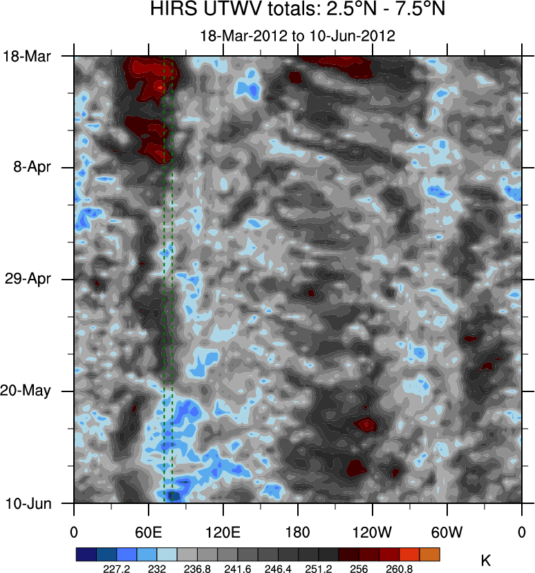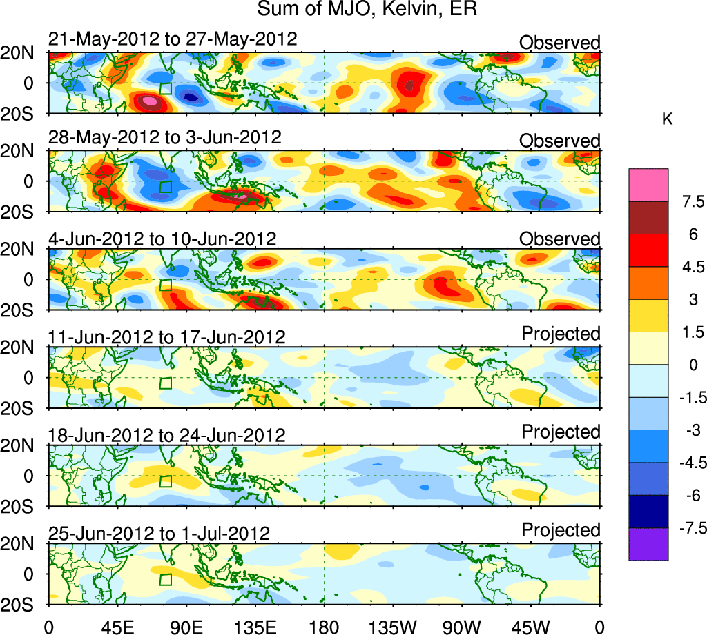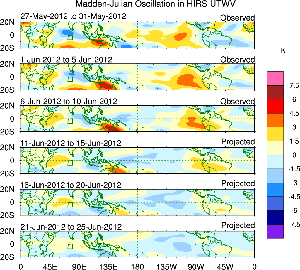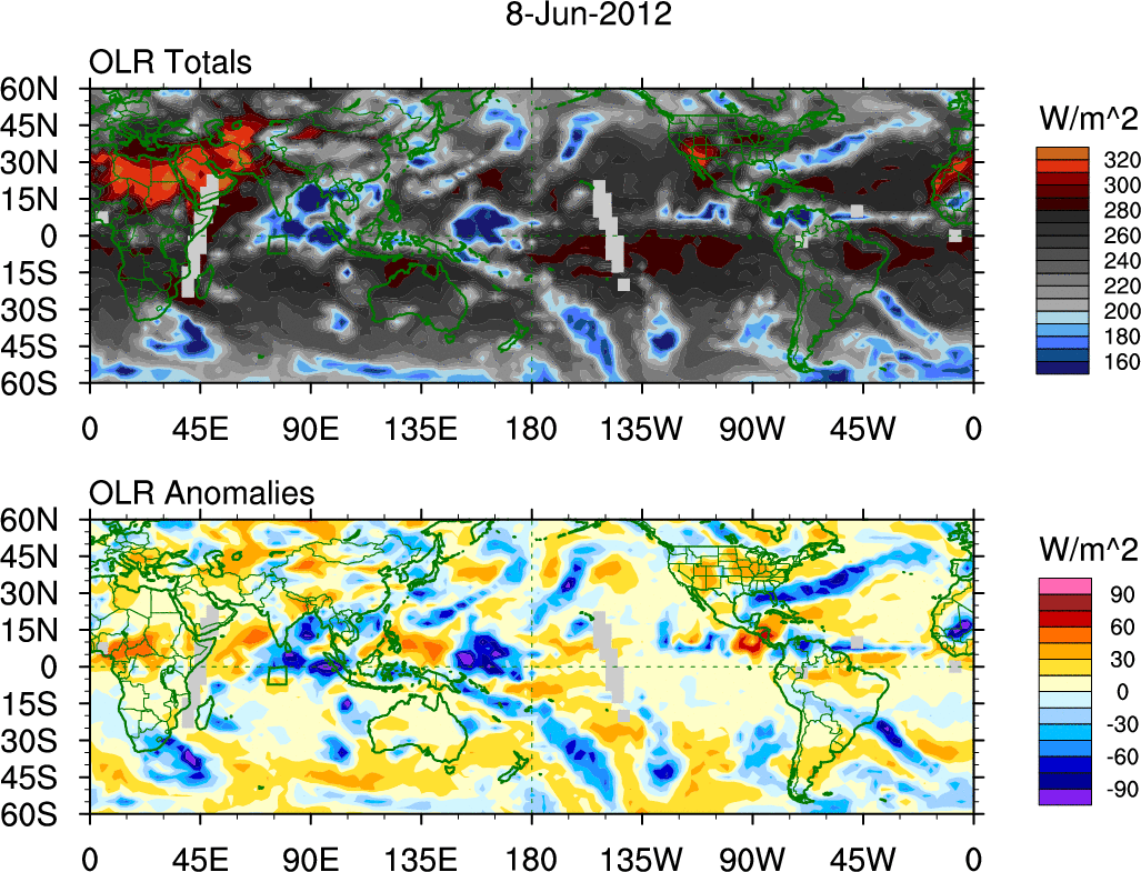 To identify tropical waves in near real-time, the OLR and UTWV data are filtered following Wheeler & Weickmann (2001 MWR). The daily anomalies are calculated using the first 3 harmonics of the seasonal cycle for 1979–2009. Missing values are then filled using linear interpolation in space and time. The most recent 365 days of anomalies are padded with 659 days of zeroes, and the result is filtered for each wave type.