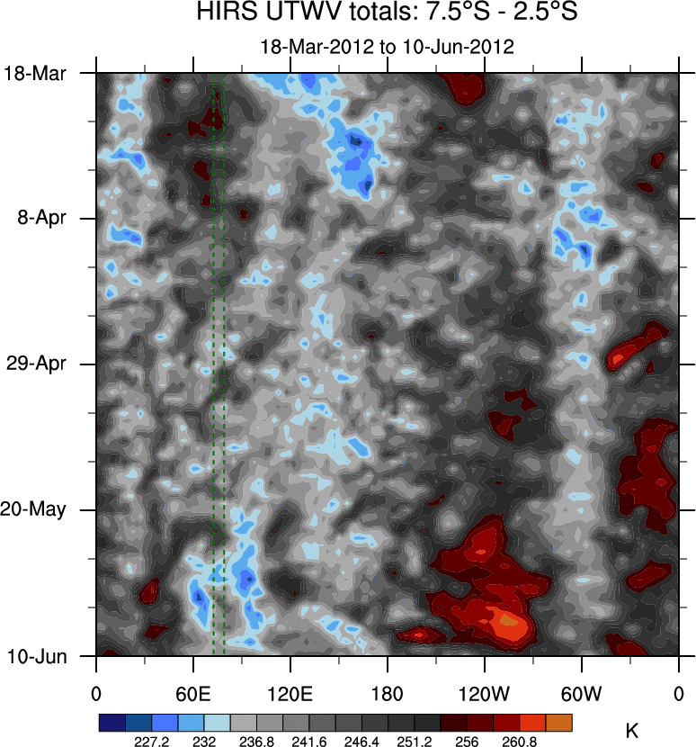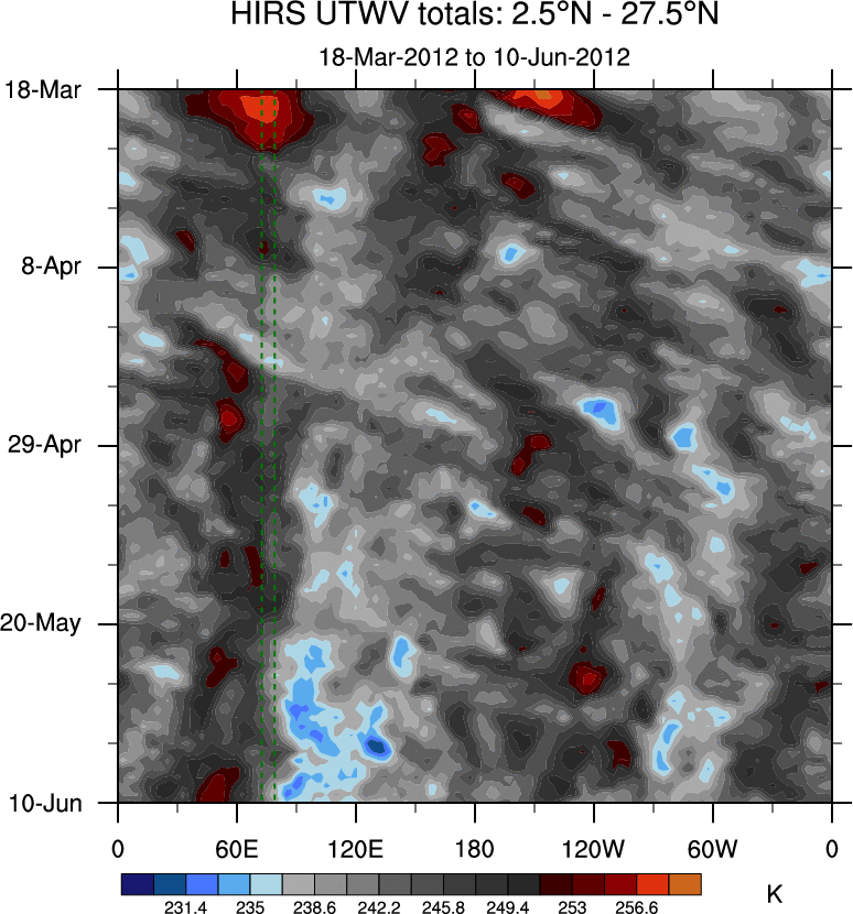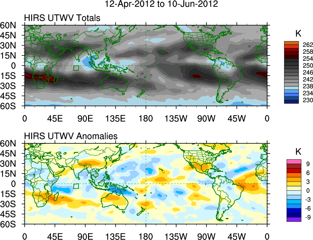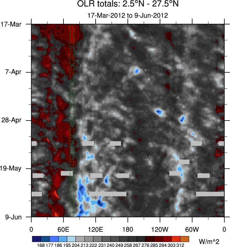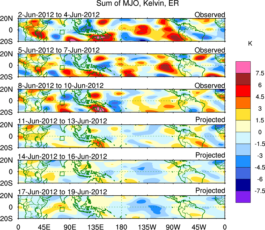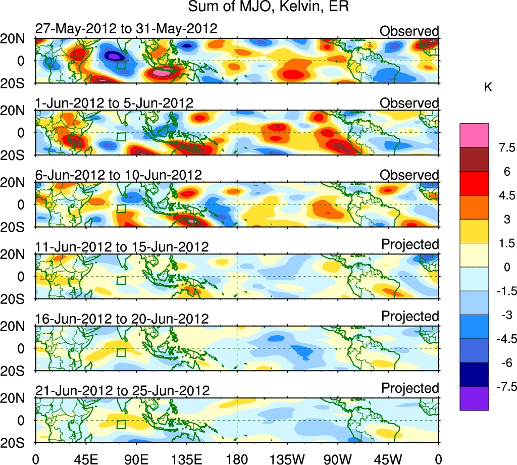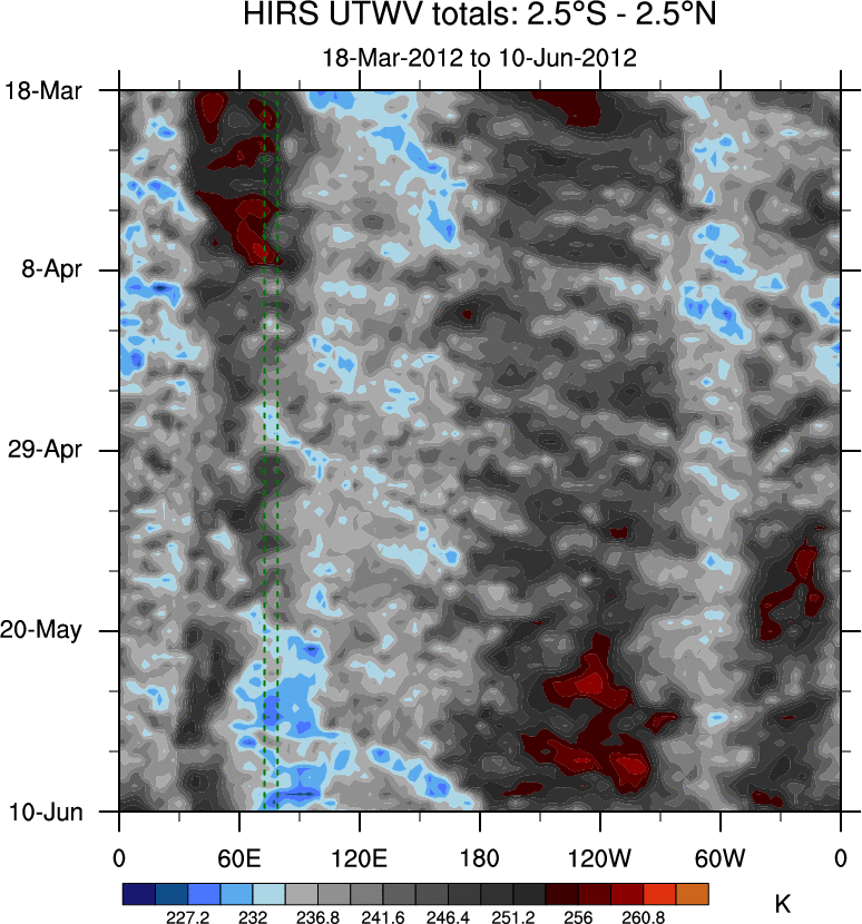 To identify tropical waves in near real-time, the OLR and UTWV data are filtered following Wheeler & Weickmann (2001 MWR). The daily anomalies are calculated using the first 3 harmonics of the seasonal cycle for 1979–2009. Missing values are then filled using linear interpolation in space and time. The most recent 365 days of anomalies are padded with 659 days of zeroes, and the result is filtered for each wave type.