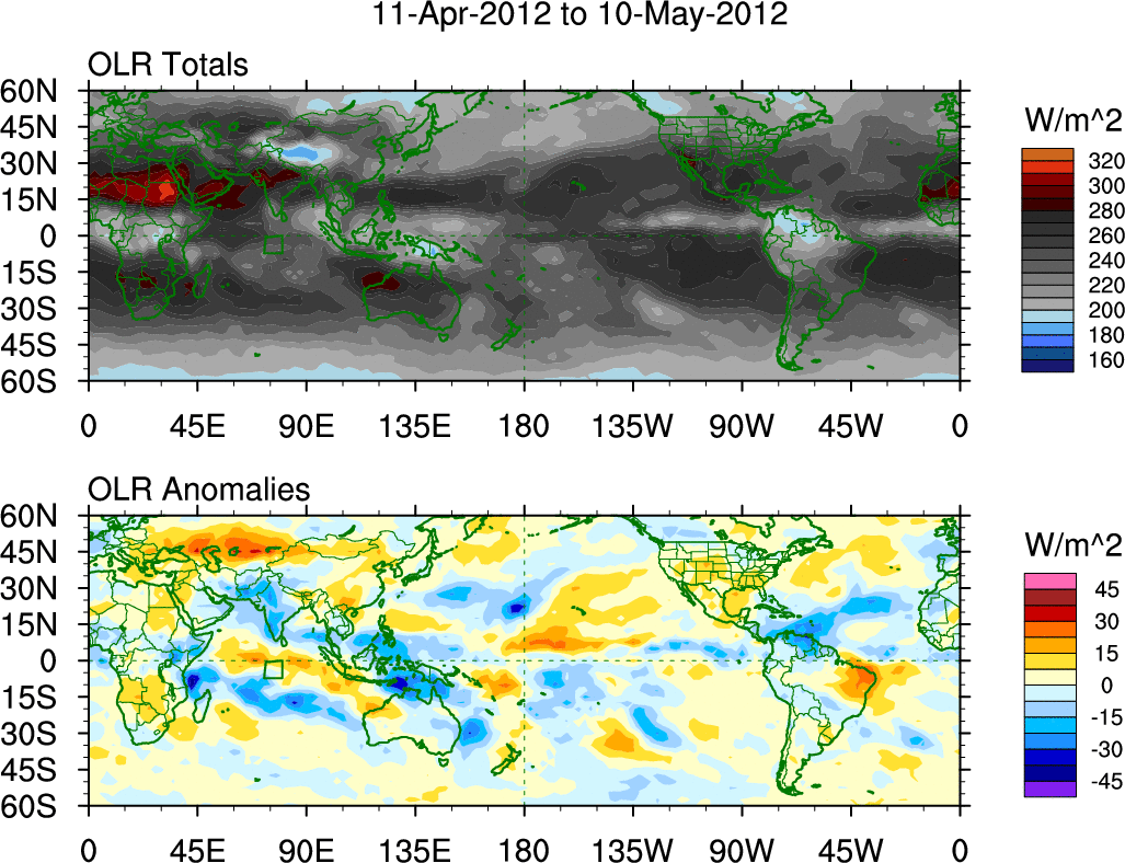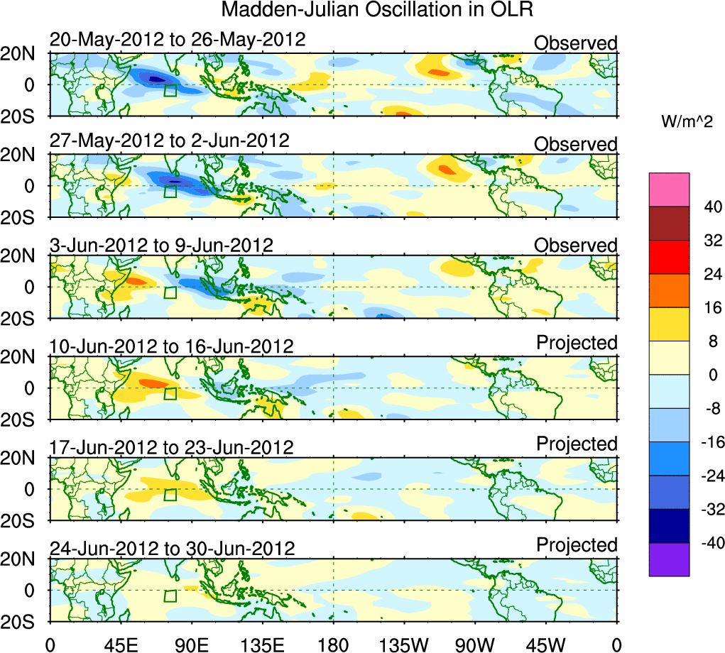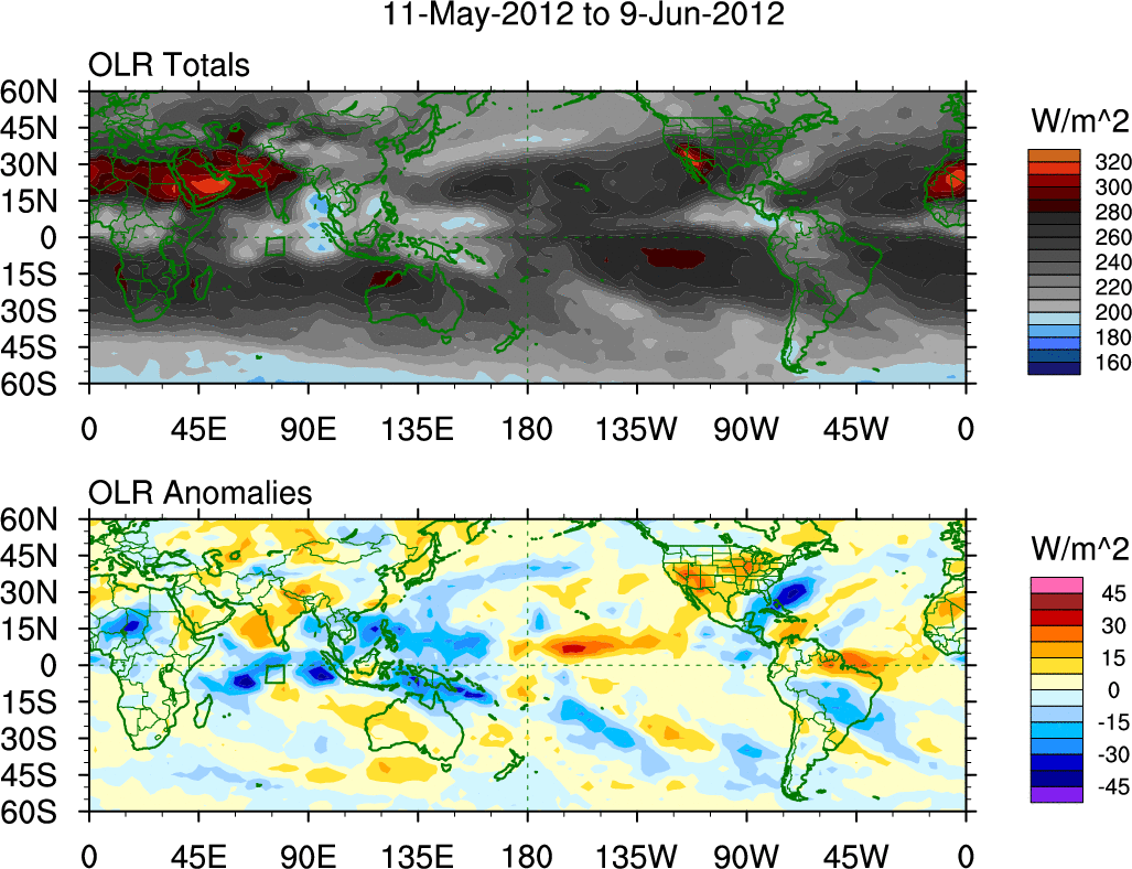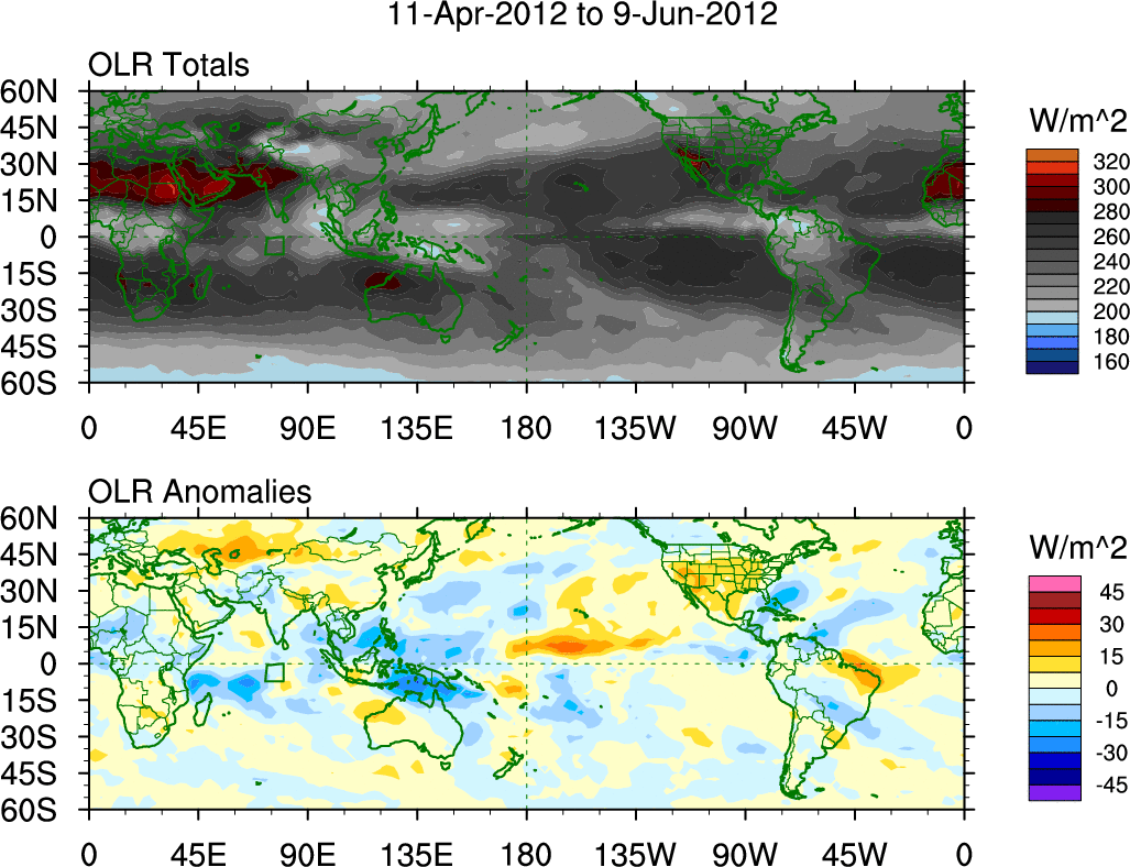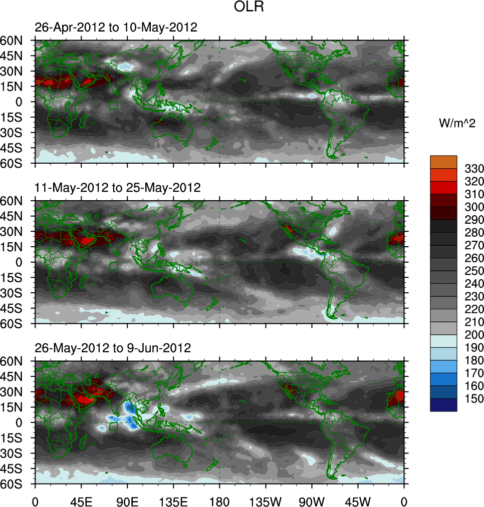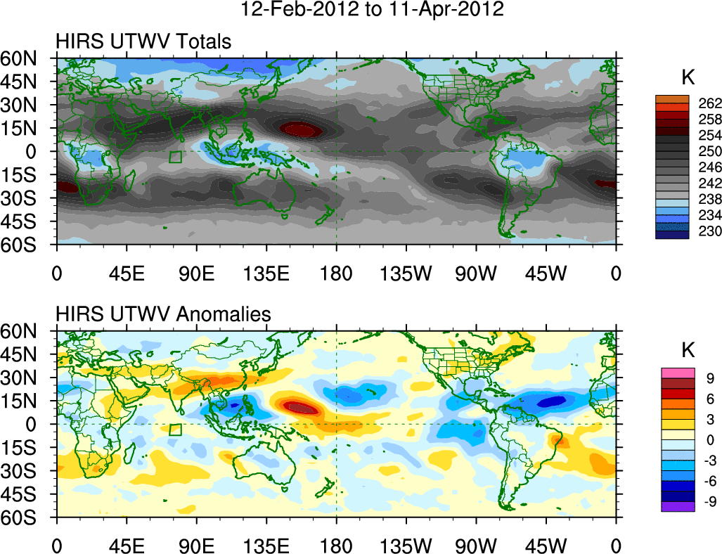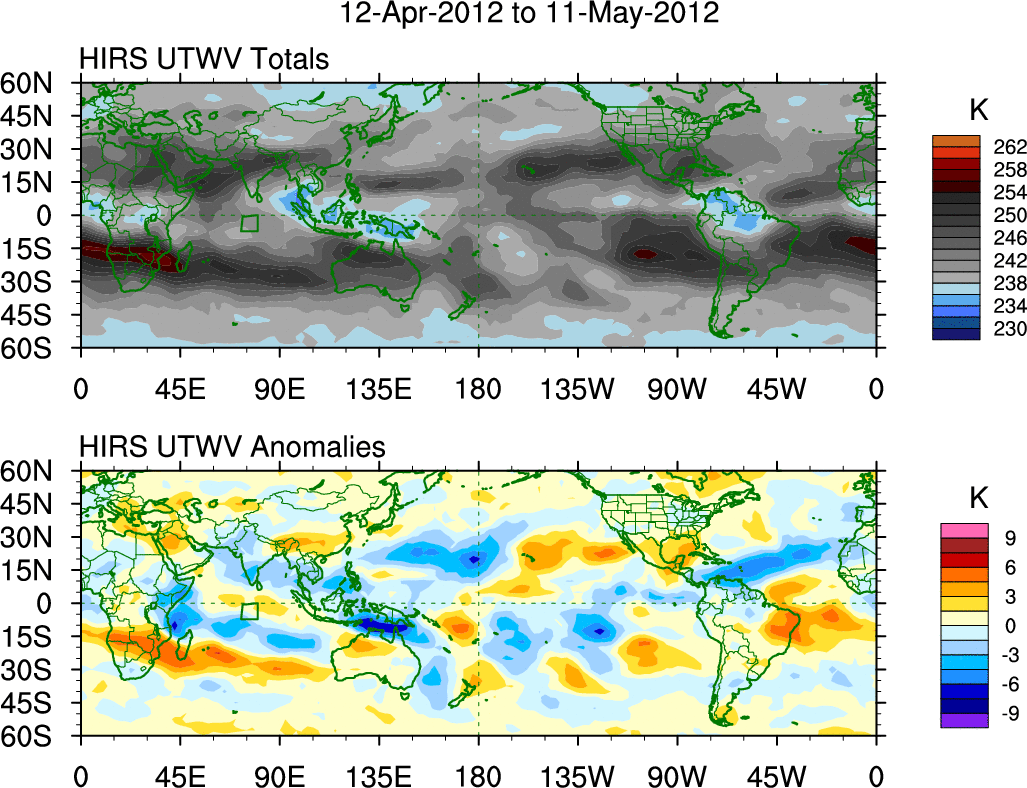 To identify tropical waves in near real-time, the OLR and UTWV data are filtered following Wheeler & Weickmann (2001 MWR). The daily anomalies are calculated using the first 3 harmonics of the seasonal cycle for 1979–2009. Missing values are then filled using linear interpolation in space and time. The most recent 365 days of anomalies are padded with 659 days of zeroes, and the result is filtered for each wave type.