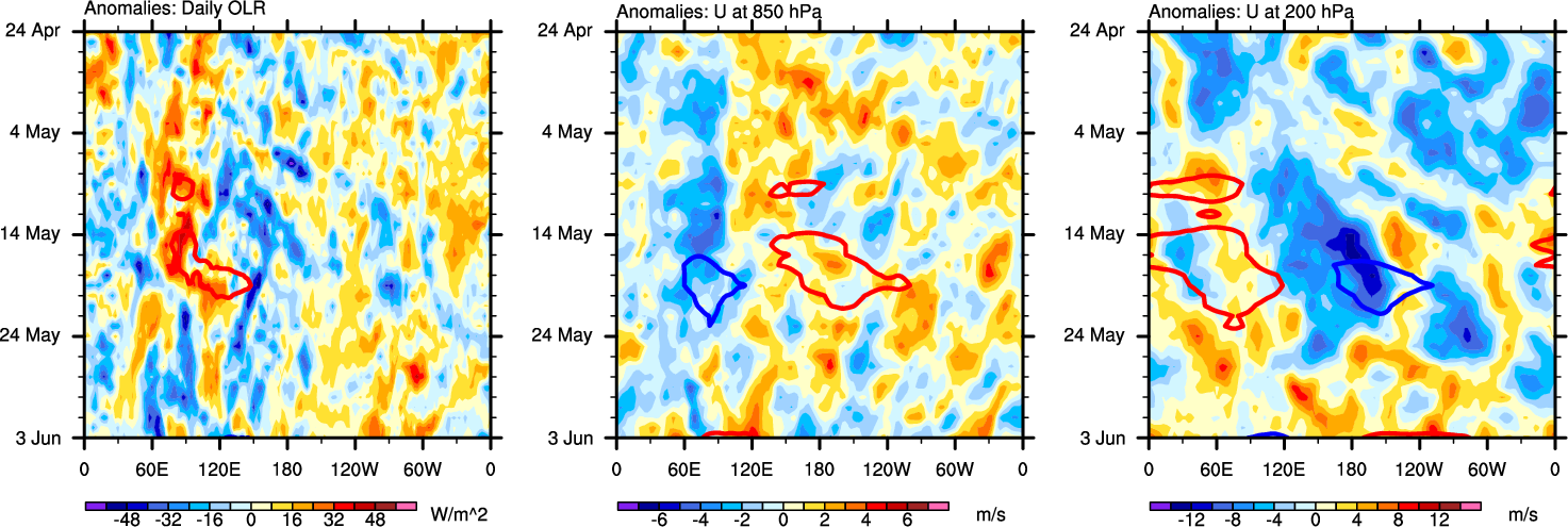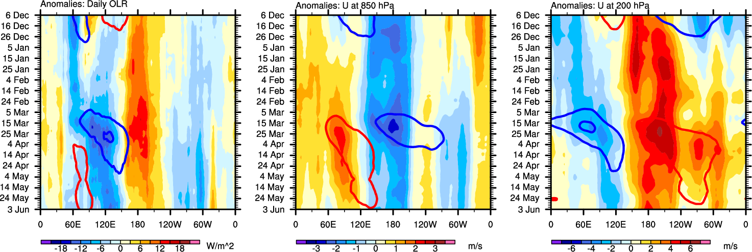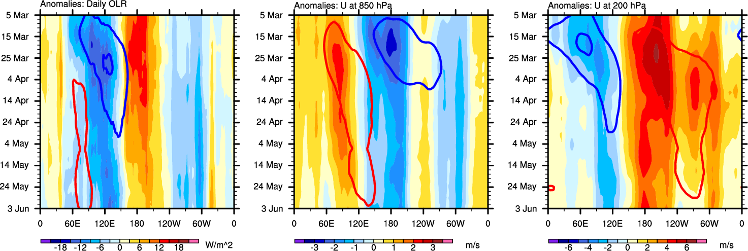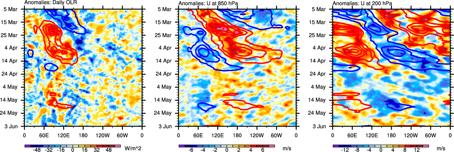 The Hovmollers show longitude-time plots for OLR, U-850, and U-200. The shading indicates the observed anomalies, while the contours are the projection of those anomalies onto the RMM EOFs.