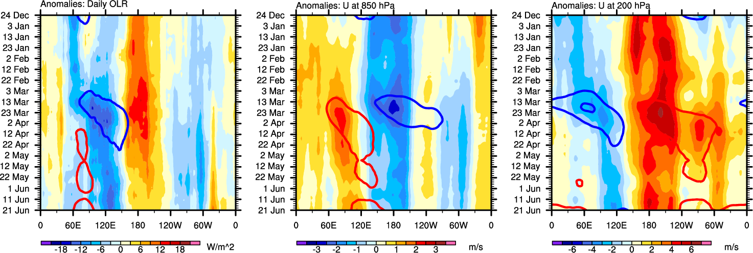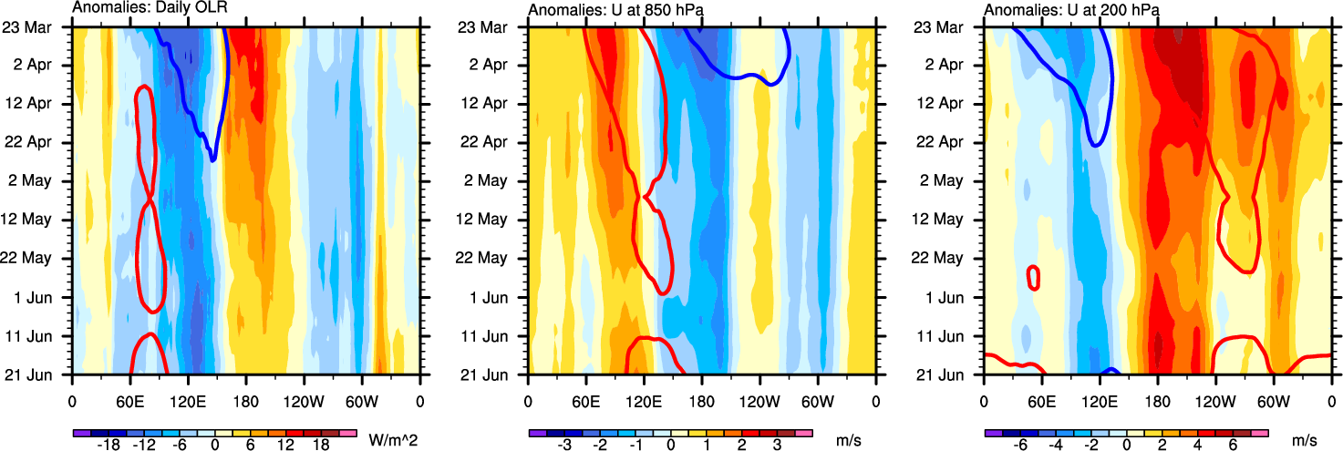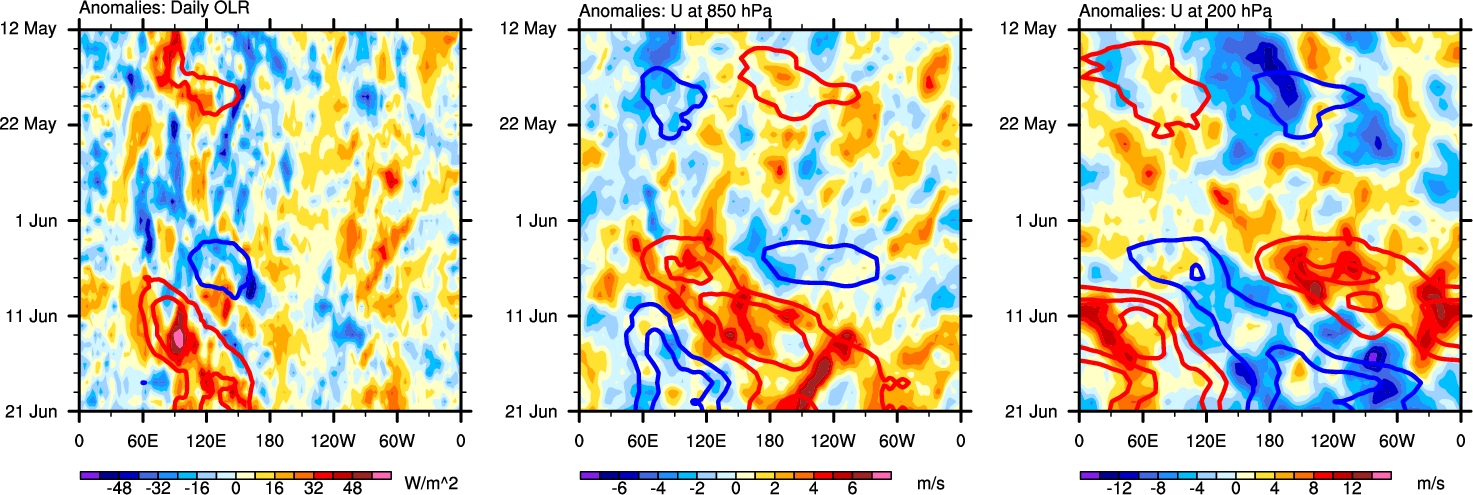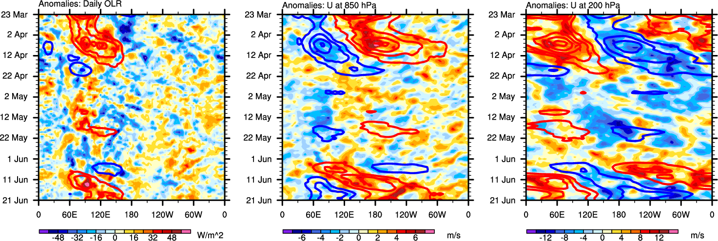The Hovmollers show longitude-time plots for OLR, U-850, and U-200. The shading indicates the observed anomalies, while the contours are the projection of those anomalies onto the RMM EOFs.