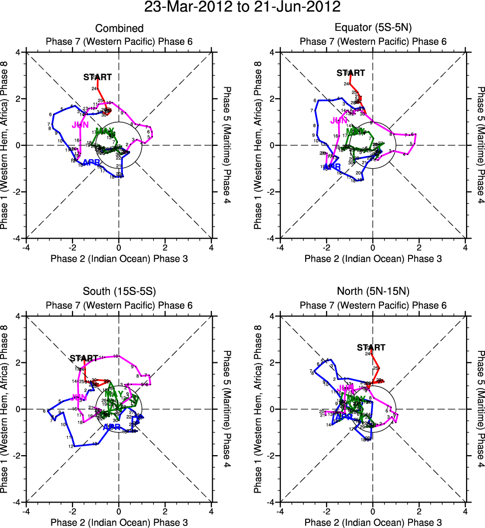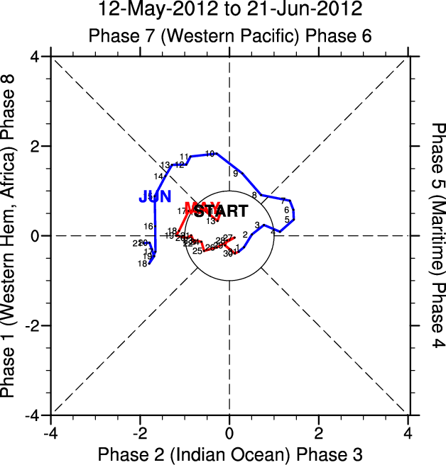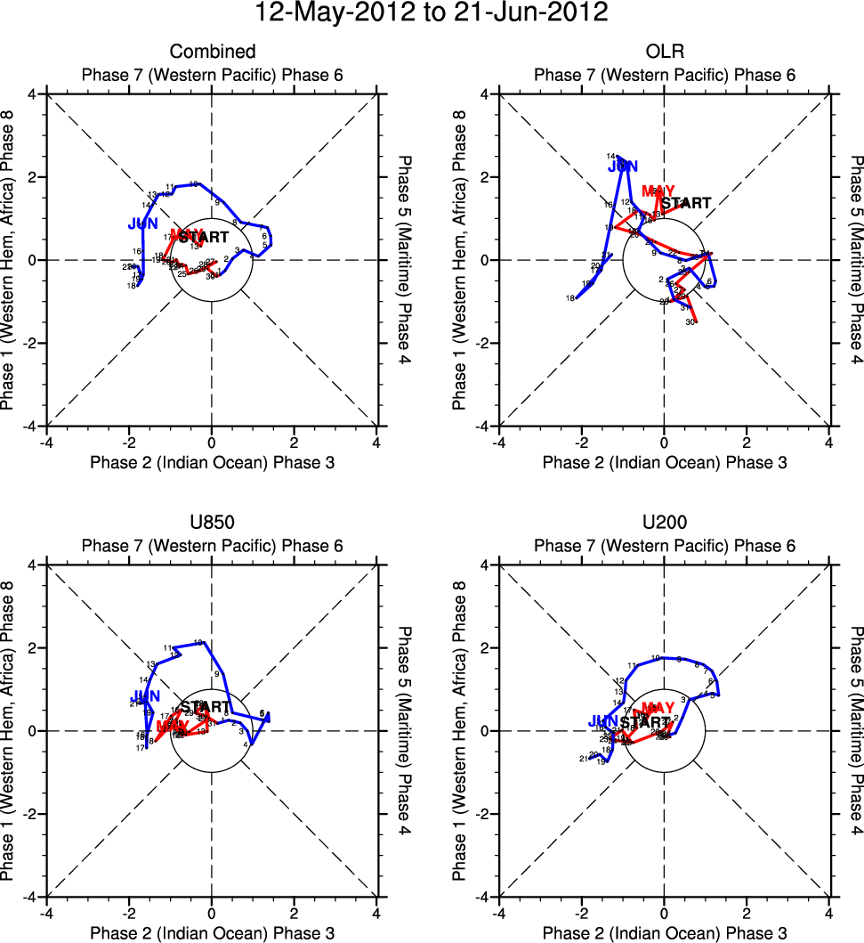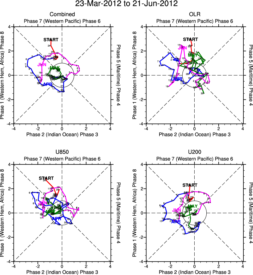 Wheeler and Hendon (2004) constructed the RMM index for monitoring the MJO. This index consists of the first two principal components (PCs) of OLR, 850-hPa zonal wind, and 200-hPa zonal wind averaged 15S-15N.