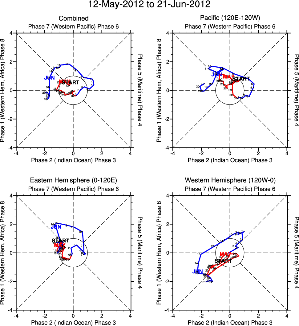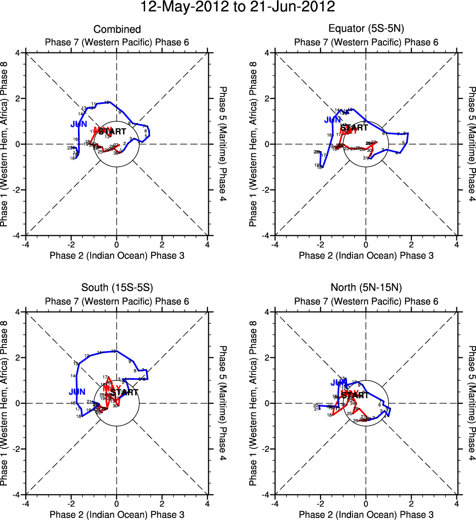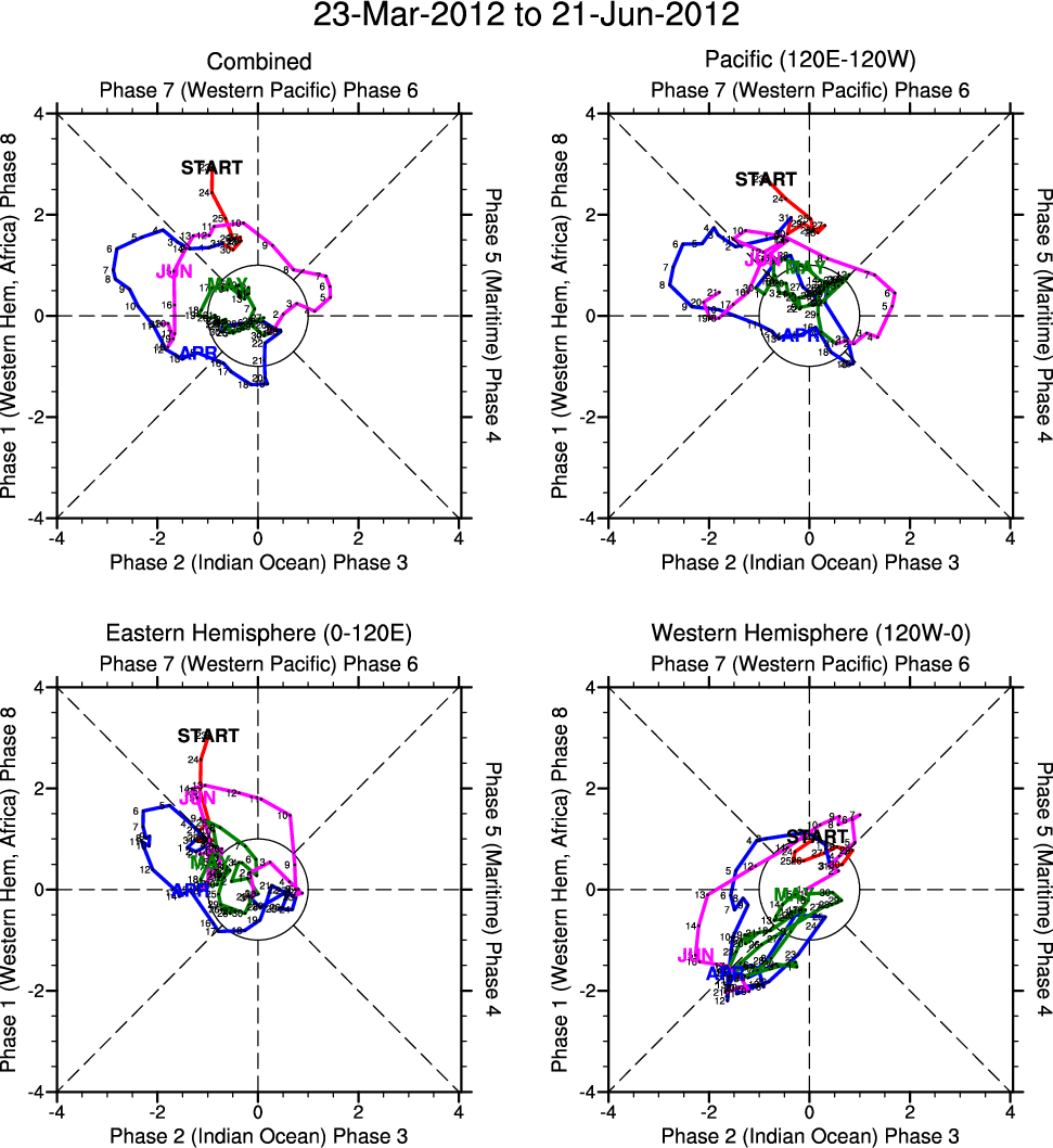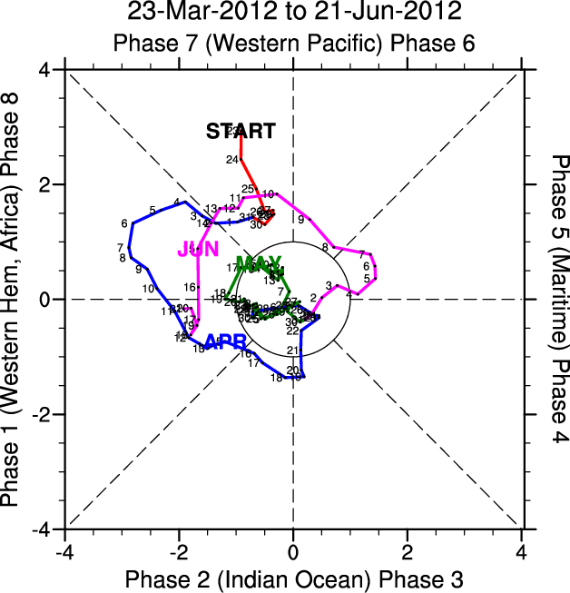 Wheeler and Hendon (2004) constructed the RMM index for monitoring the MJO. This index consists of the first two principal components (PCs) of OLR, 850-hPa zonal wind, and 200-hPa zonal wind averaged 15S-15N.