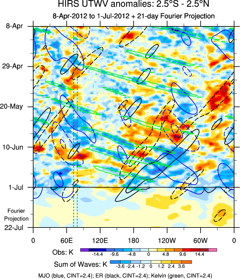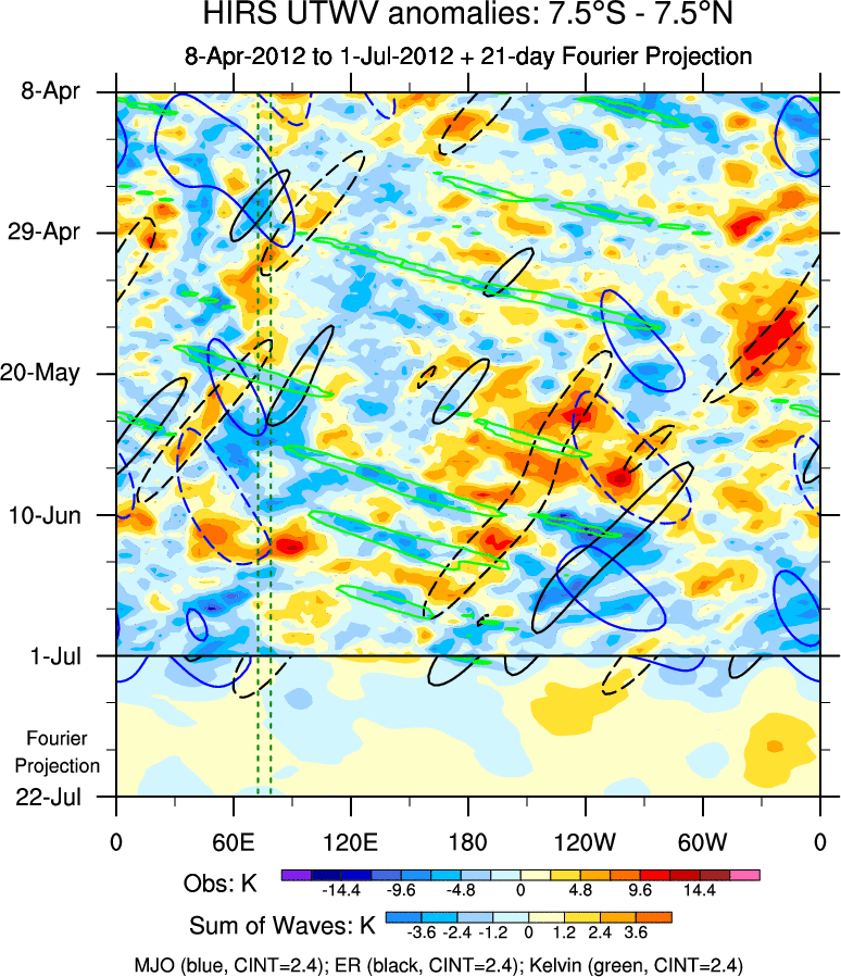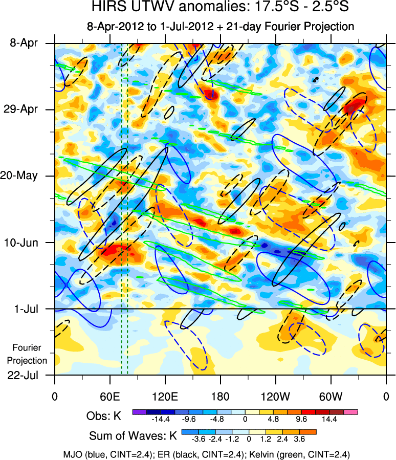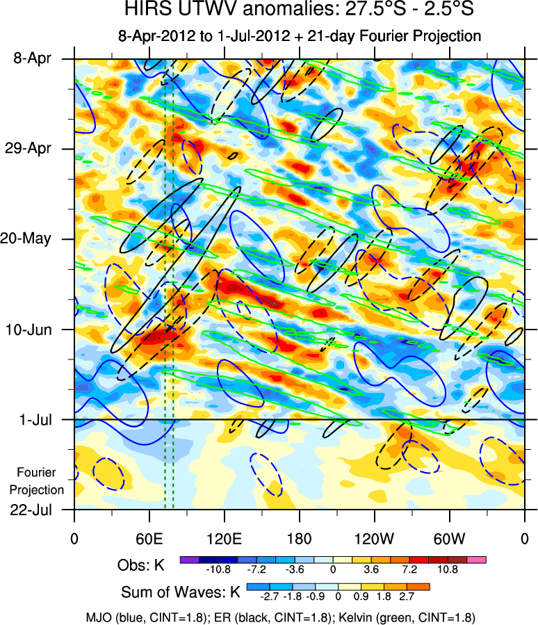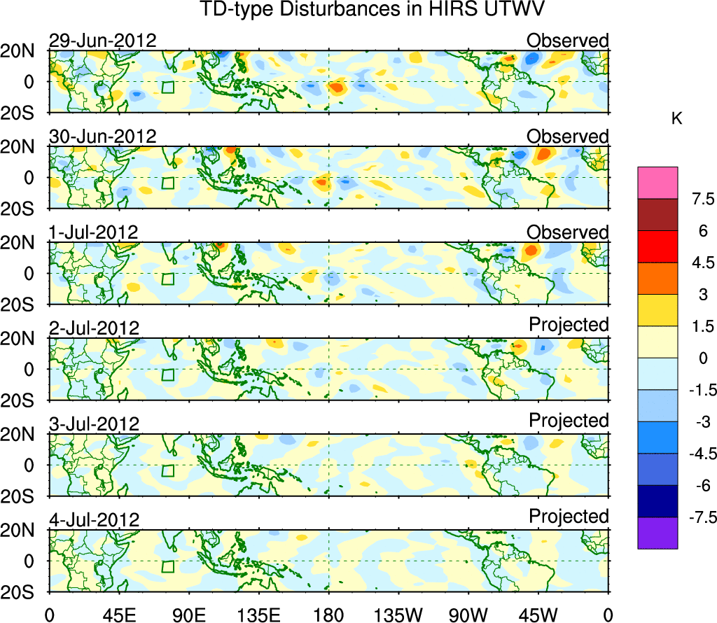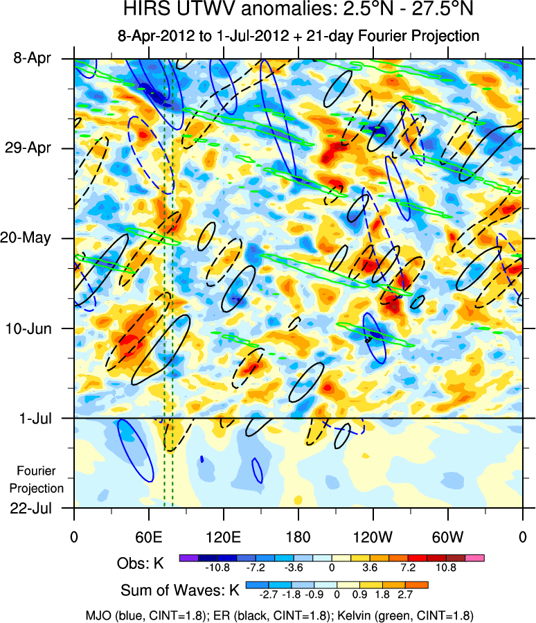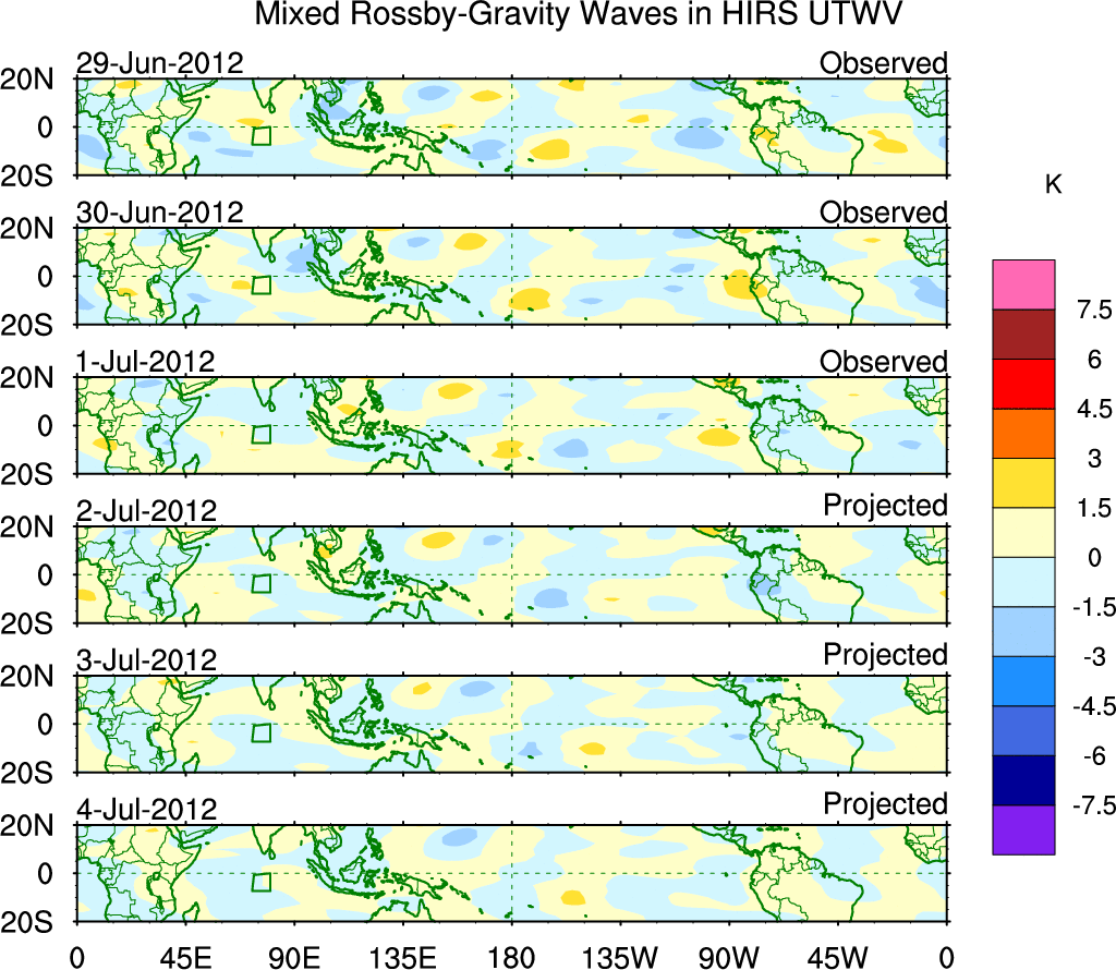 To identify tropical waves in near real-time, the OLR and UTWV data are filtered following Wheeler & Weickmann (2001 MWR). The daily anomalies are calculated using the first 3 harmonics of the seasonal cycle for 1979–2009. Missing values are then filled using linear interpolation in space and time. The most recent 365 days of anomalies are padded with 659 days of zeroes, and the result is filtered for each wave type.