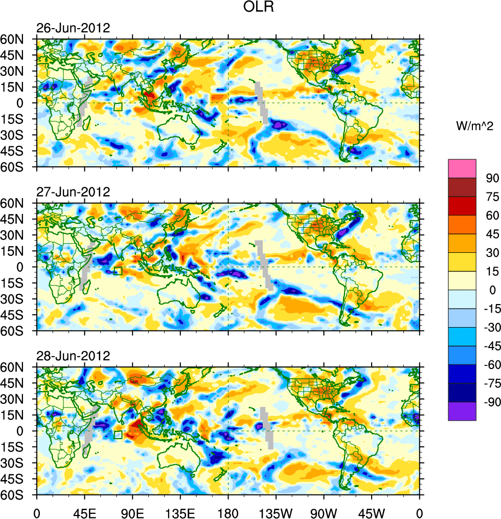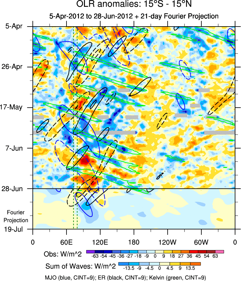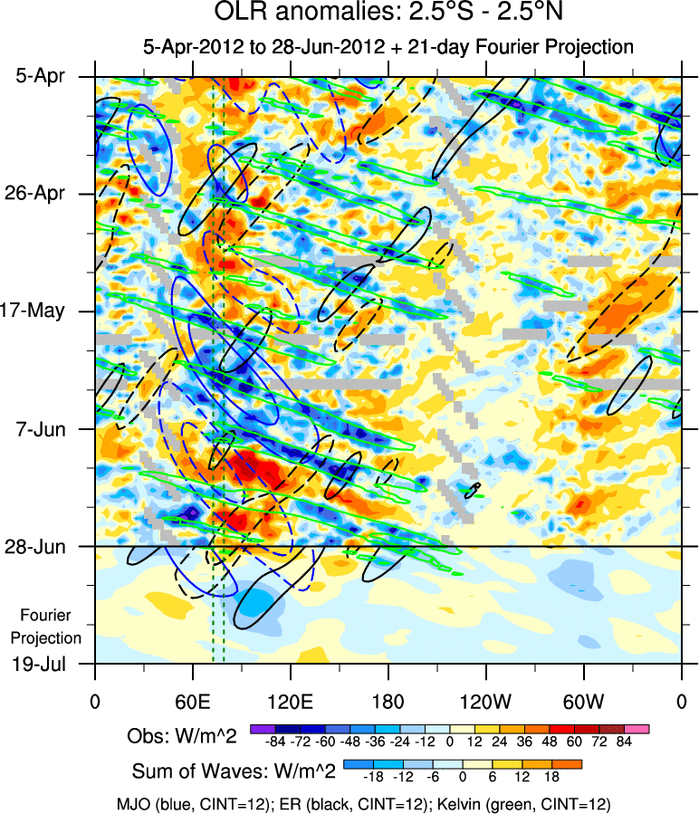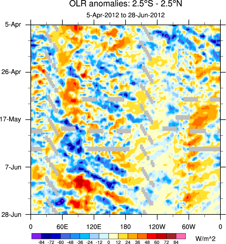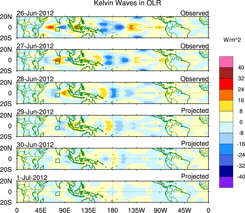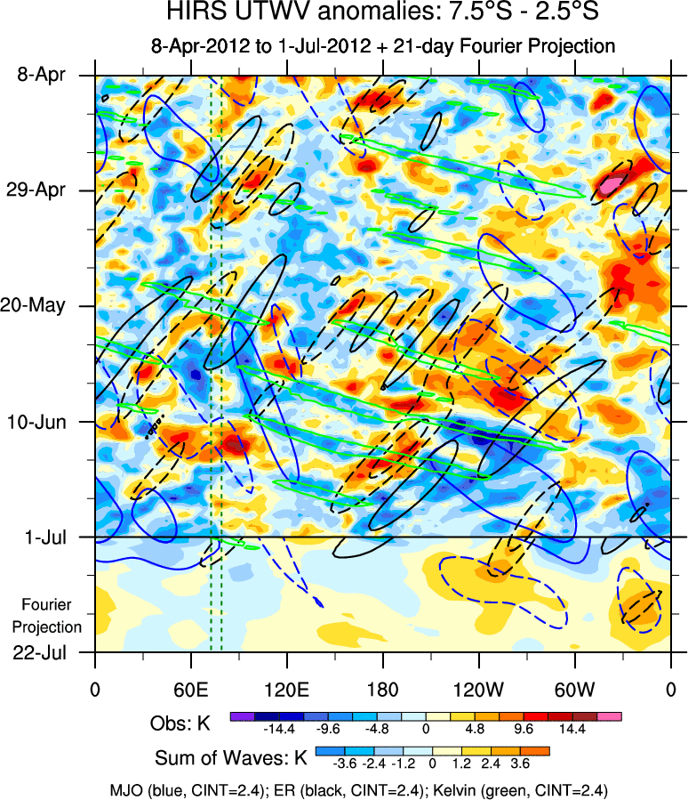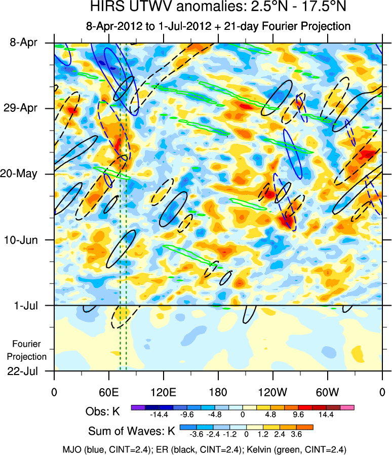 To identify tropical waves in near real-time, the OLR and UTWV data are filtered following Wheeler & Weickmann (2001 MWR). The daily anomalies are calculated using the first 3 harmonics of the seasonal cycle for 1979–2009. Missing values are then filled using linear interpolation in space and time. The most recent 365 days of anomalies are padded with 659 days of zeroes, and the result is filtered for each wave type.