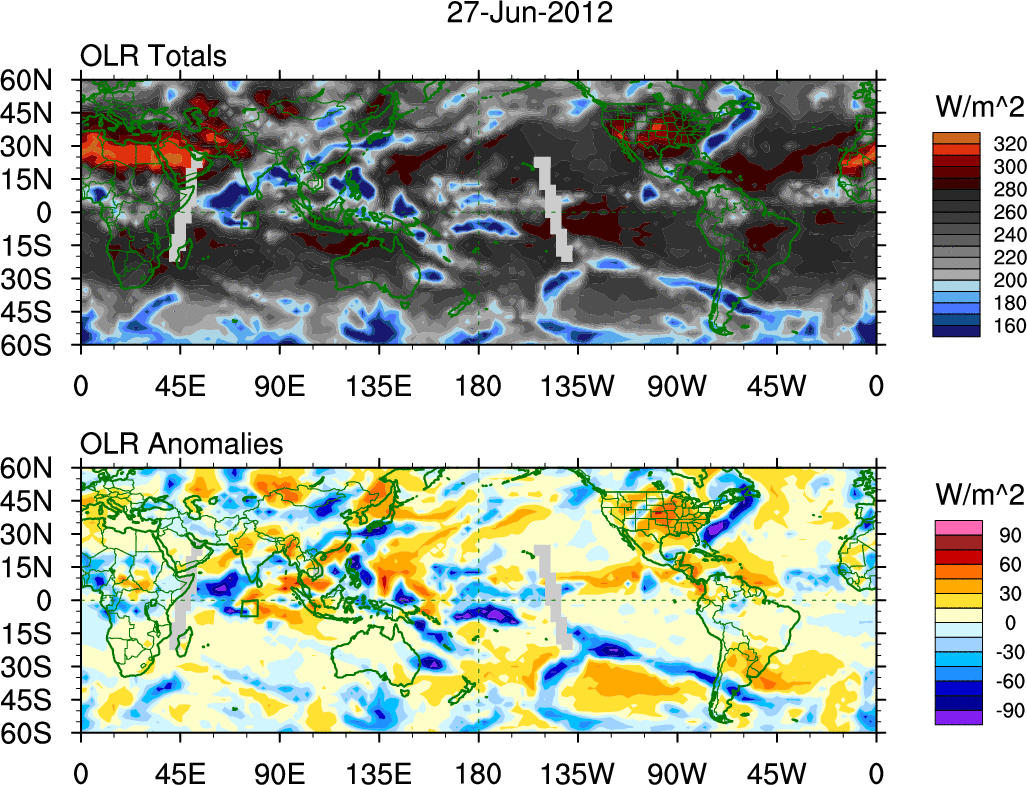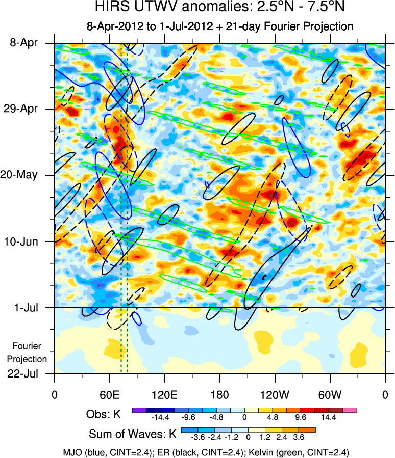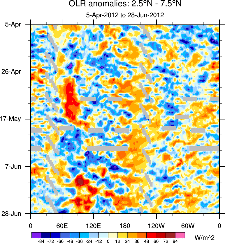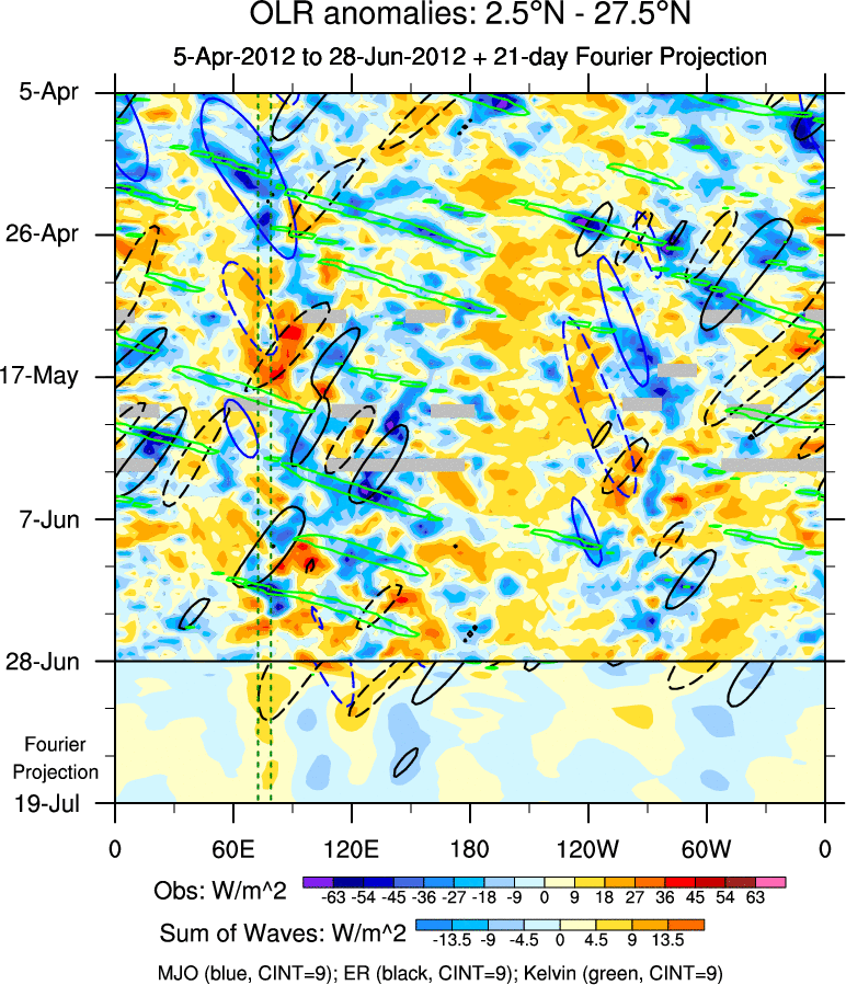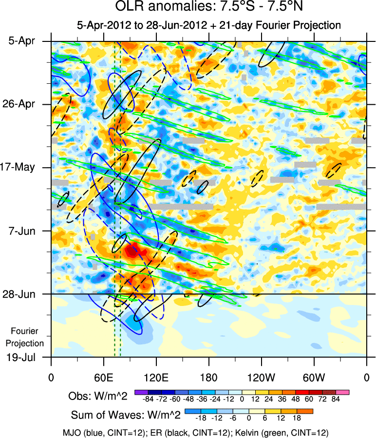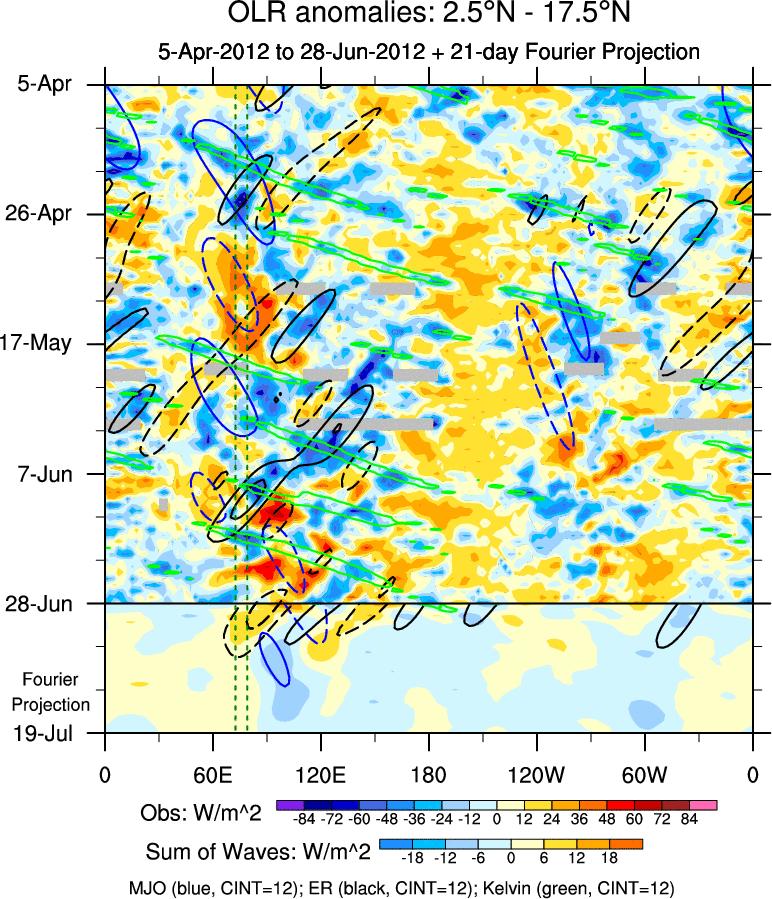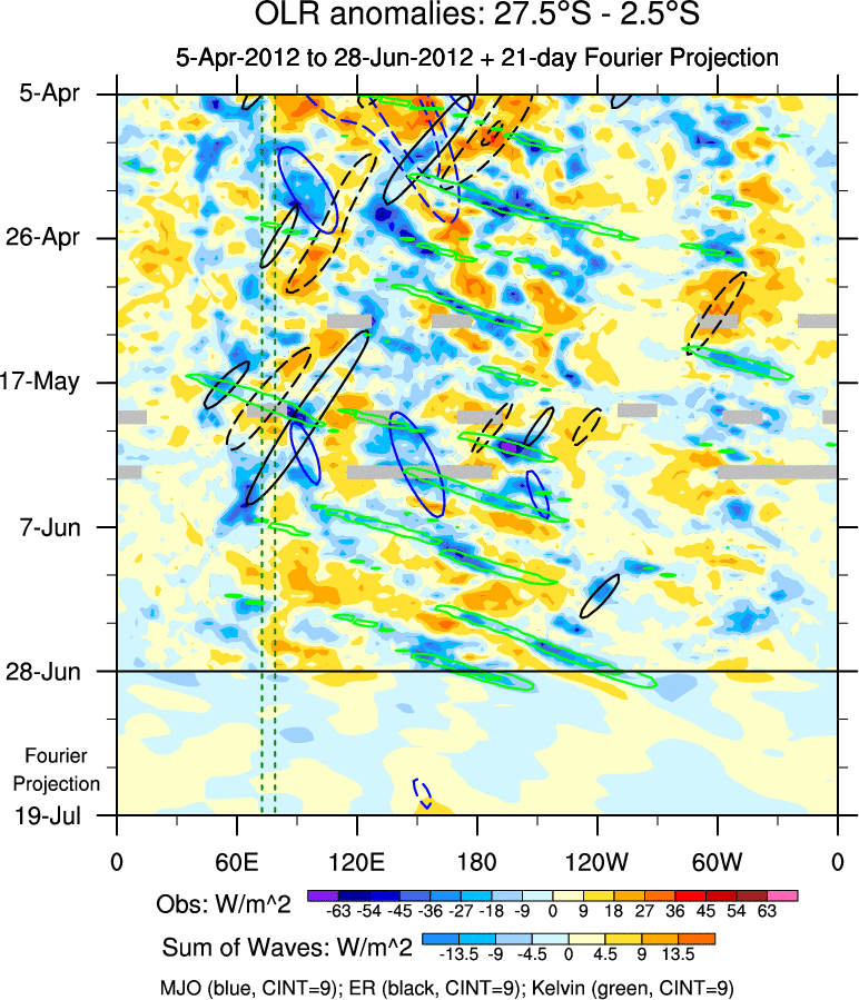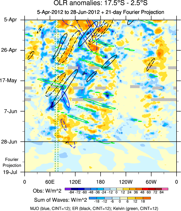 To identify tropical waves in near real-time, the OLR and UTWV data are filtered following Wheeler & Weickmann (2001 MWR). The daily anomalies are calculated using the first 3 harmonics of the seasonal cycle for 1979–2009. Missing values are then filled using linear interpolation in space and time. The most recent 365 days of anomalies are padded with 659 days of zeroes, and the result is filtered for each wave type.